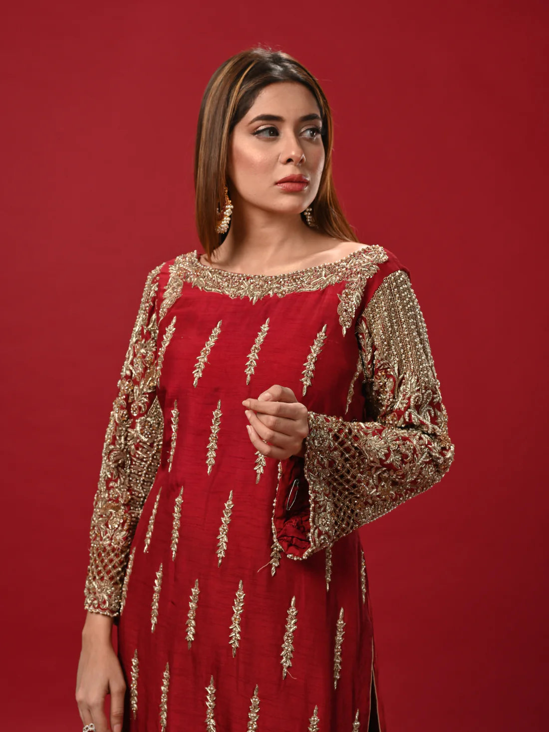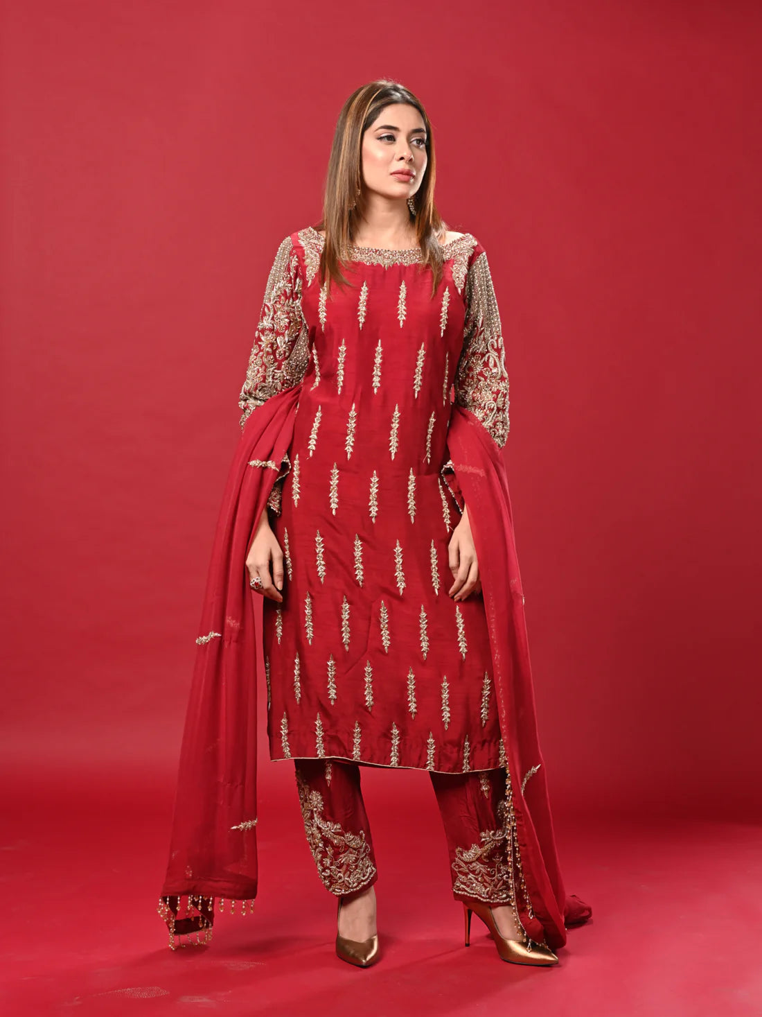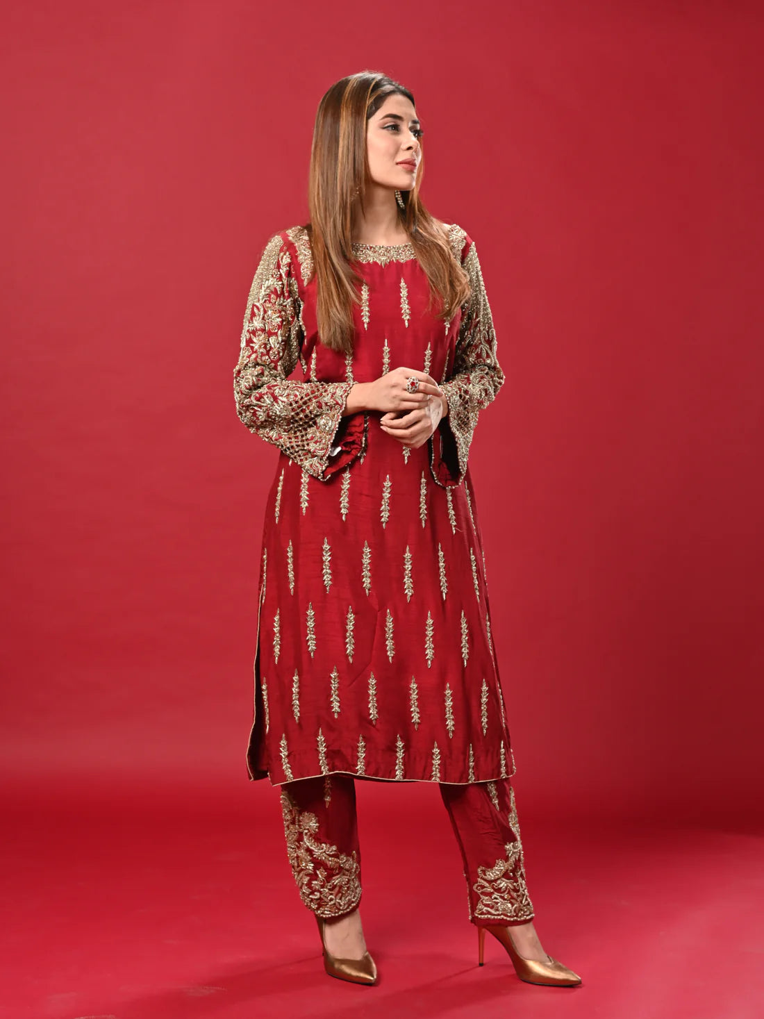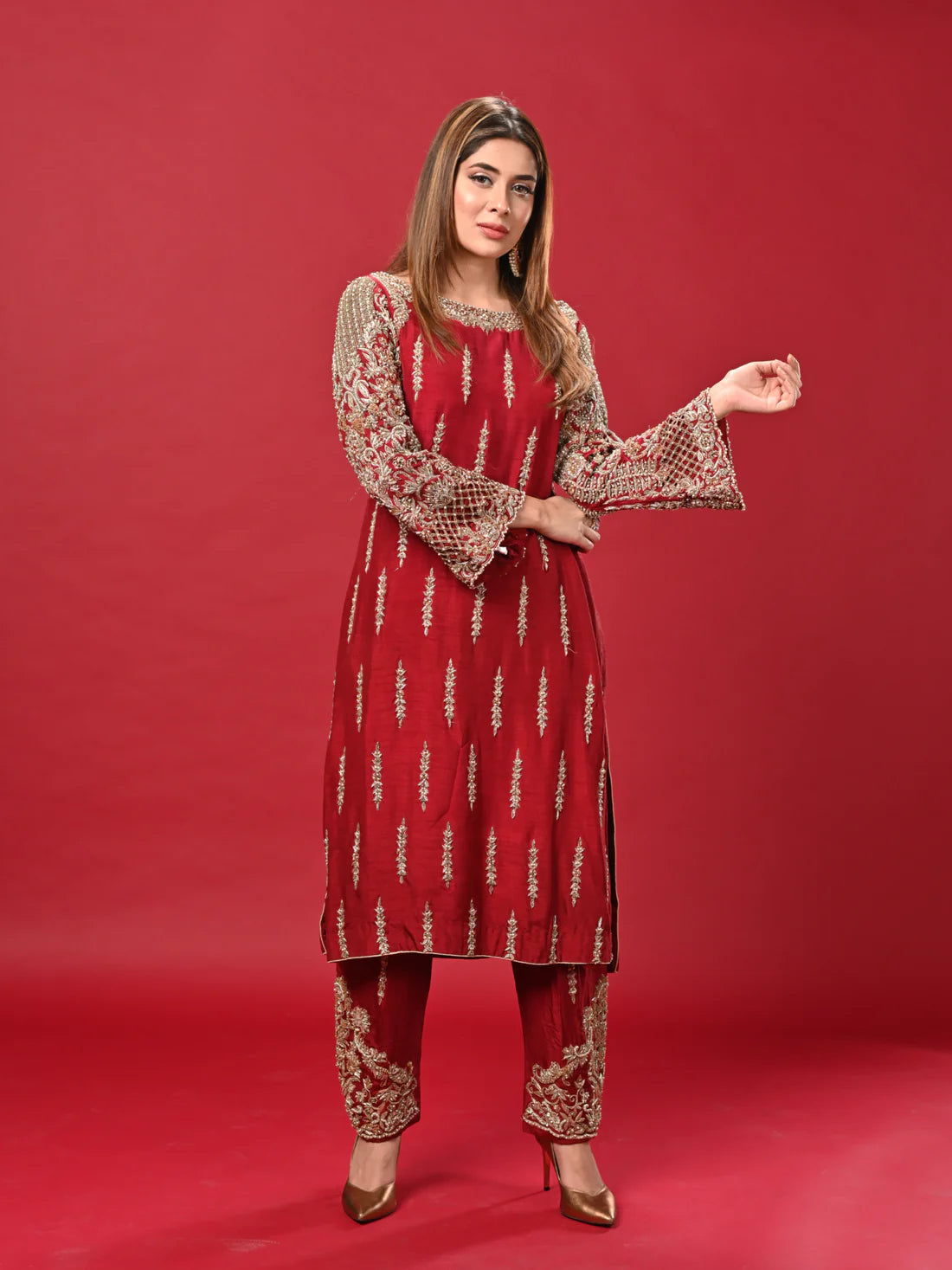 The blood-red dress captivates with its intricate beauty. Its sleeves are a testament to craftsmanship, adorned with delicate adda work that weaves a tapestry of artistry. The glistening pearls enhance the richness of the design,.The trousers accompanying this ensemble are no less exquisite. They share the same blood-red hue and feature subtle yet ornate adda work, mirroring the dress's elegance. These trousers are a perfect match, completing the outfit with a harmonious blend of traditional craftsmanship and contemporary style.