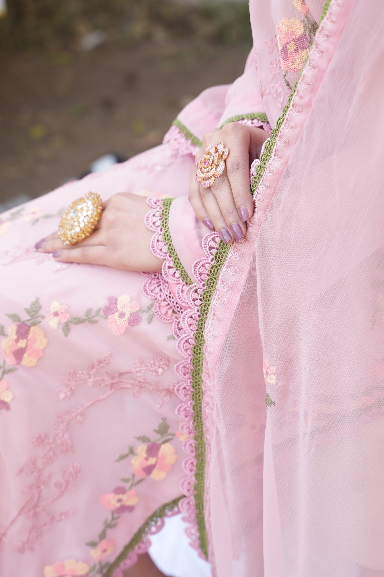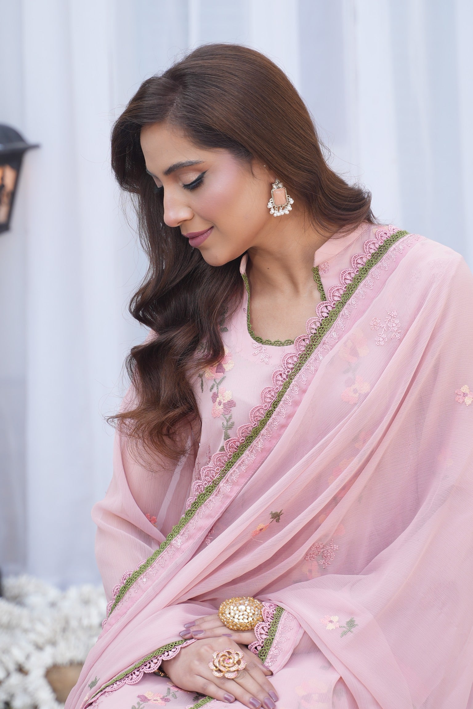 حناء in a graceful tea pink shade, crafted on luxurious Bamber chiffon and adorned with delicate embroidery and intricate double lace detailing for a refined festive charm.
