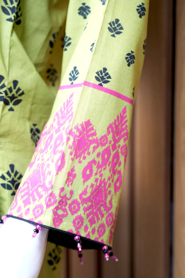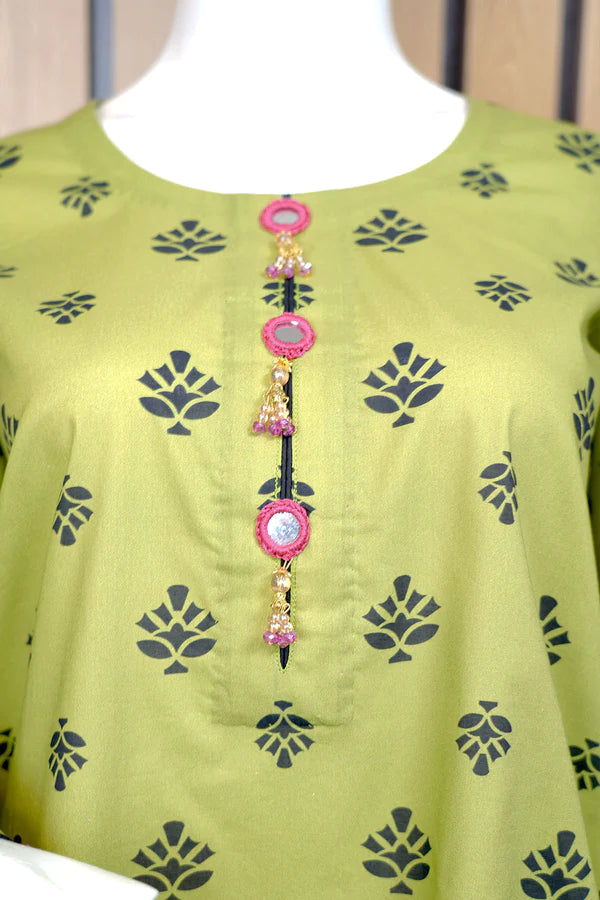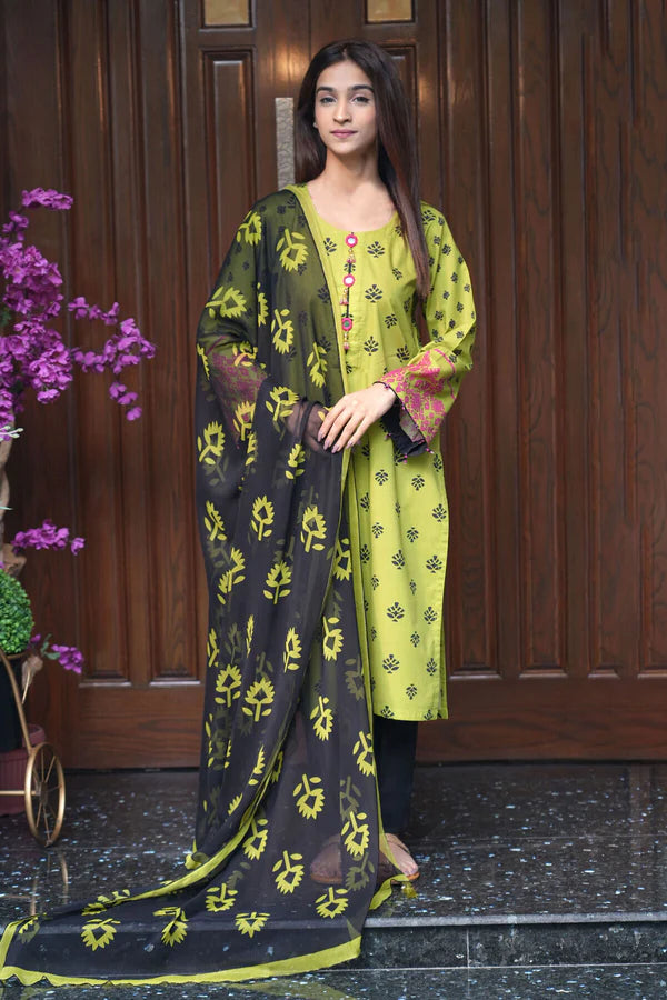 Savor the magic of winter in our two-piece ensemble. The apple green cambric shirt, adorned with vibrant patterns dancing like snowflakes in the wind, transforms you into a walking work of art. Paired with a chiffon black digital printed dupatta, this ensemble isn’t just a dress; it’s your style symphony. Embrace Madiha Jahangir’s creativity and let every stitch sing your unique fashion tale, making heads turn wherever you go.