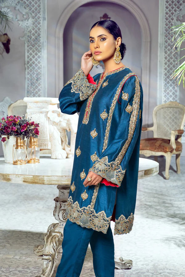 Look stunningly radiant with this deep blue ensemble adorned with intricate golden embellishment paired with a golden organza dupatta.