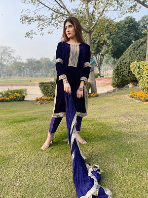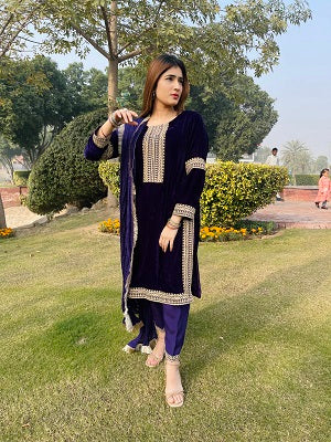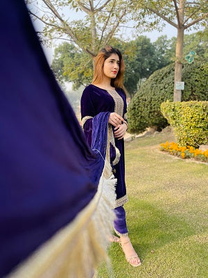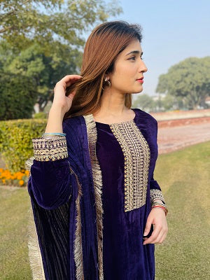 AIRA[3piece]”Drape yourself in opulence: Deep purple velvet, silk allure, and intricate tilla embroidery where elegance meets exquisite craftsmanship. Unveil the artistry of style with our curated ensemble
