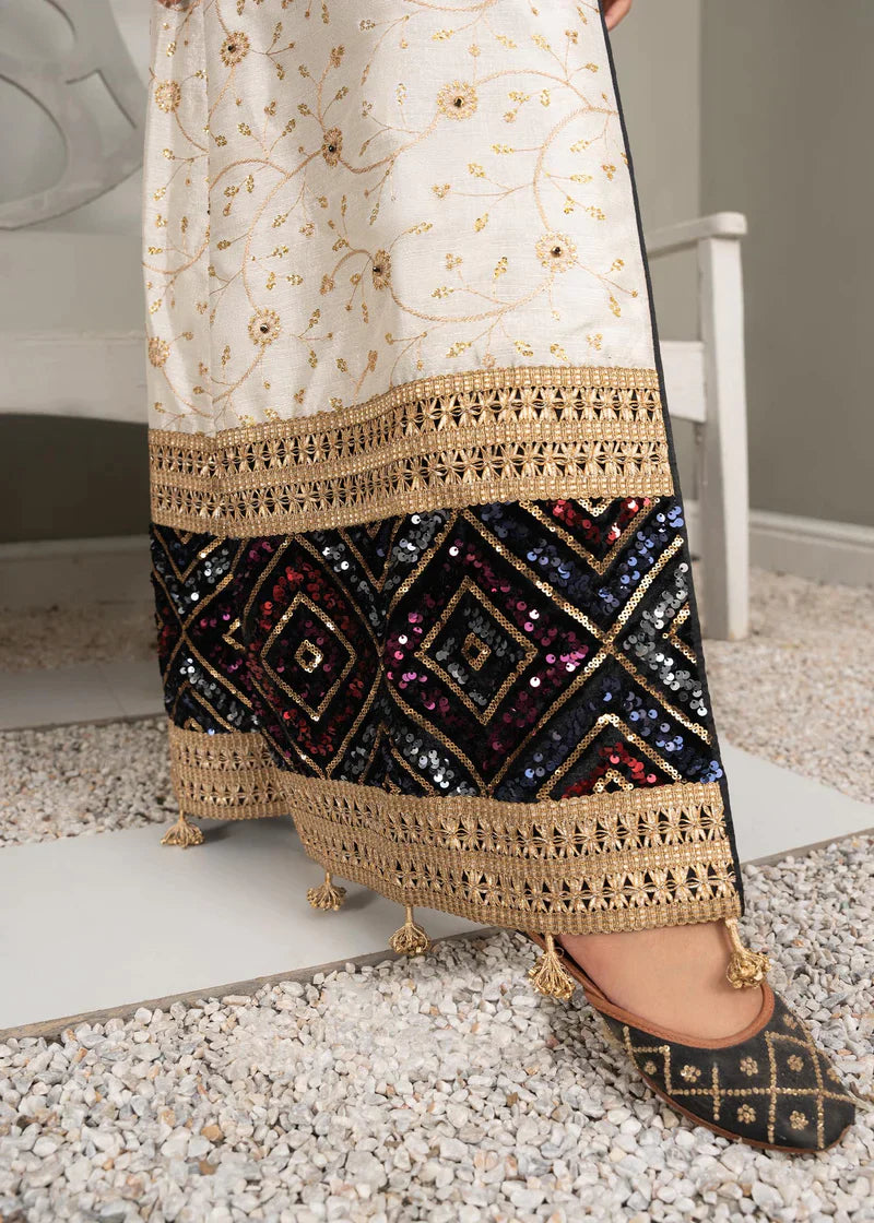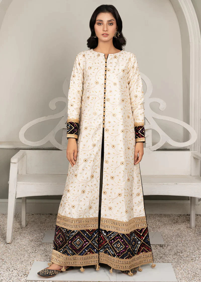 Description: Immerse in elegance with RANG-E-MERAAS’ khaddi silk gown. Off-white in shade, with an extended open front, this attire flatters all. Decorated with pastel hued embroidery, embellished using fabric manipulation, and paired with fitted pants for a seamless ensemble.