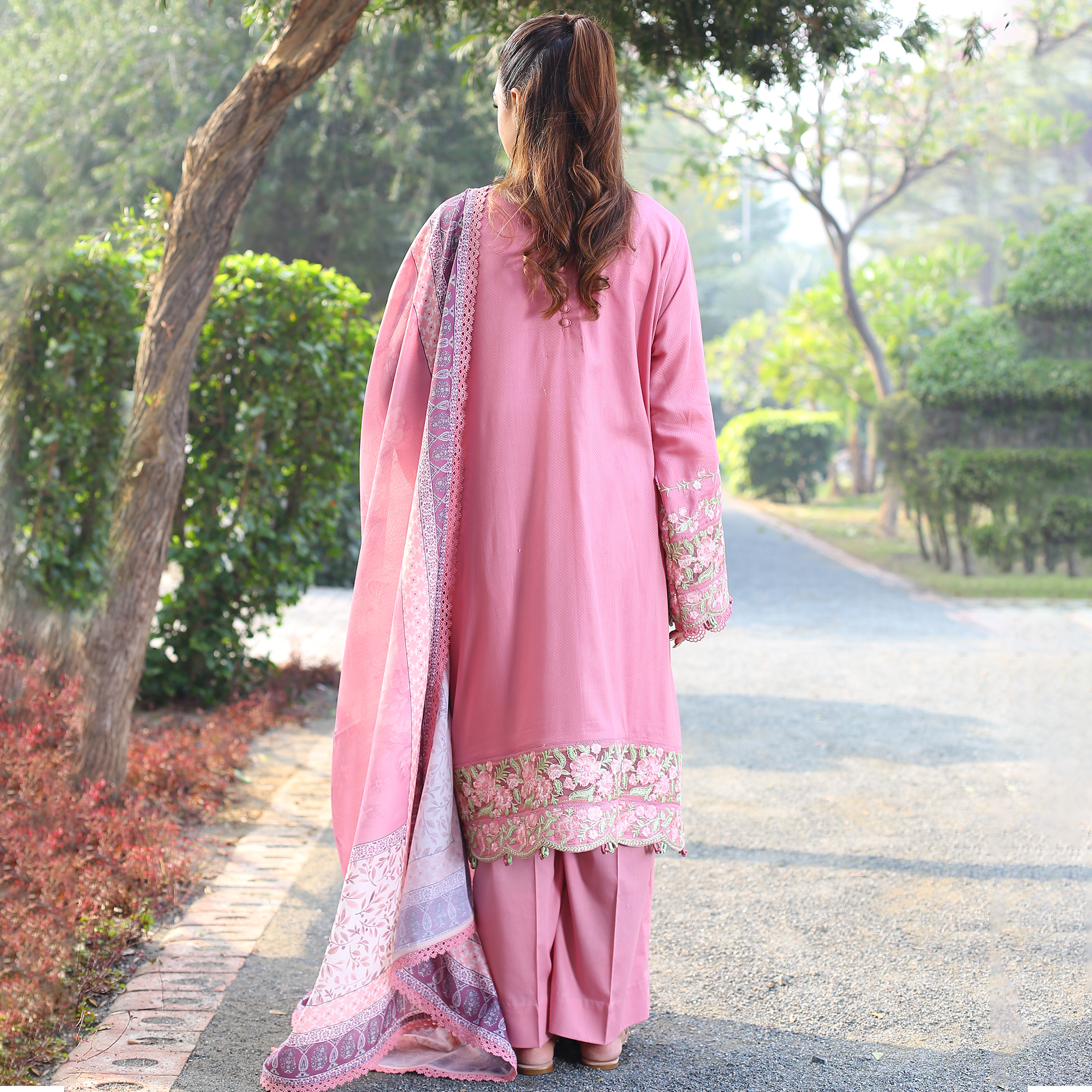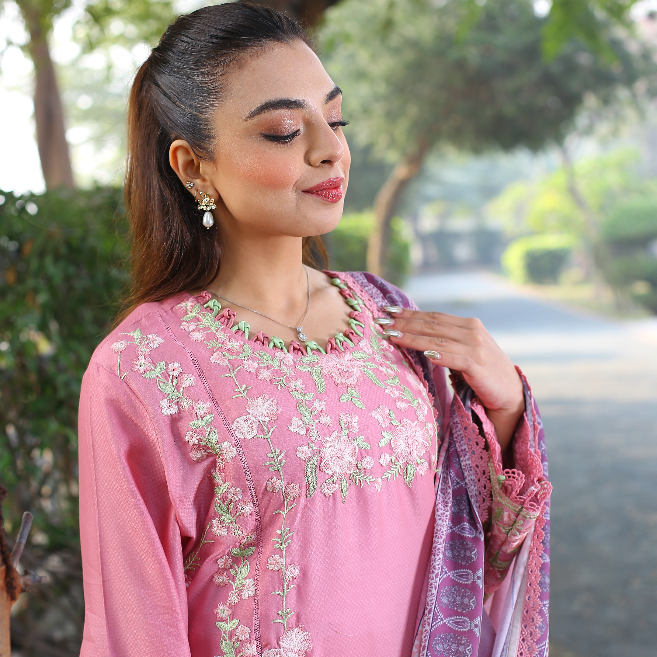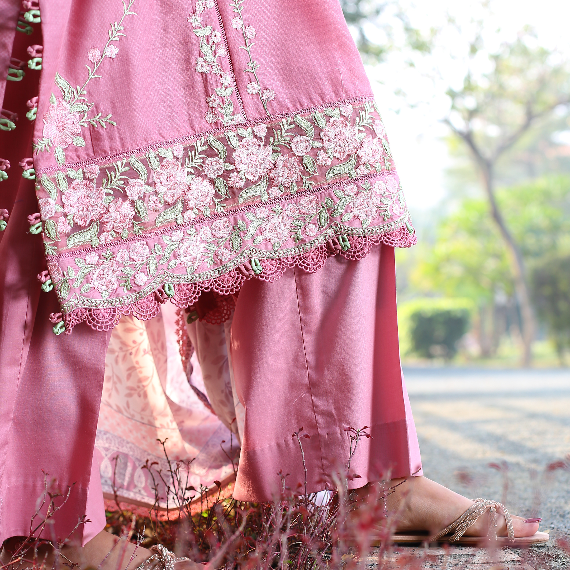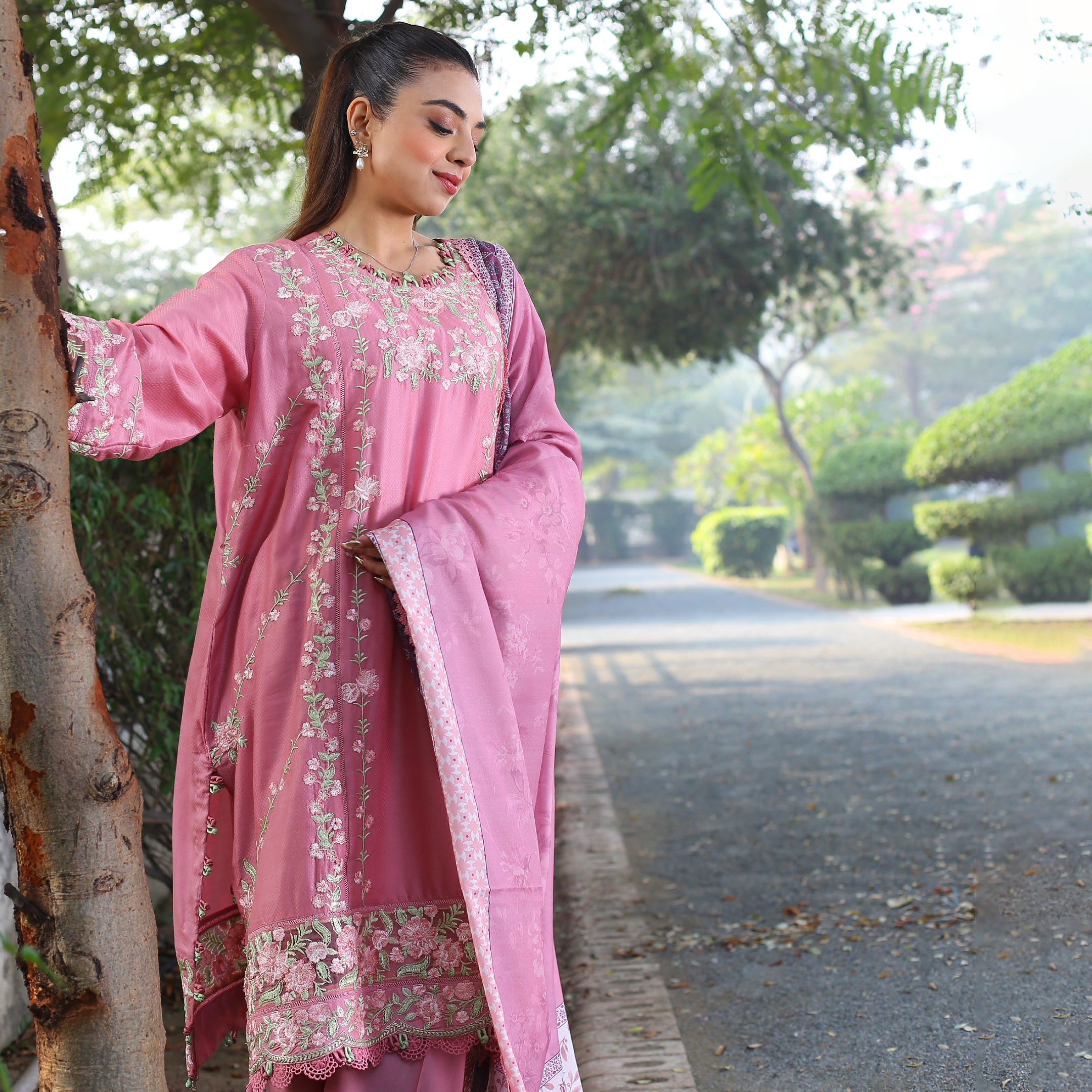 Capture the essence of timeless beauty with this tea pink ensemble, featuring intricate floral embroidery in soft hues of pink,