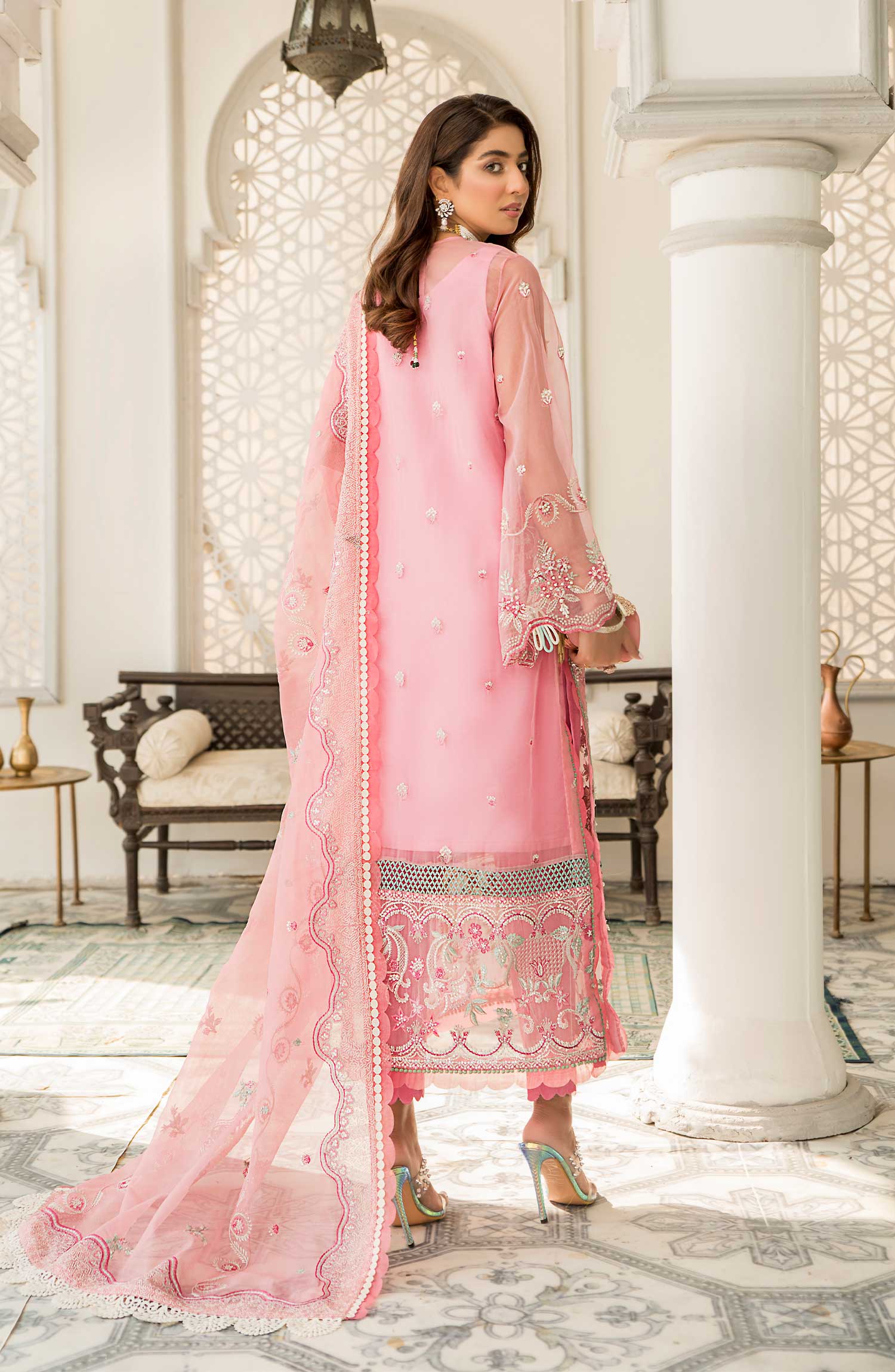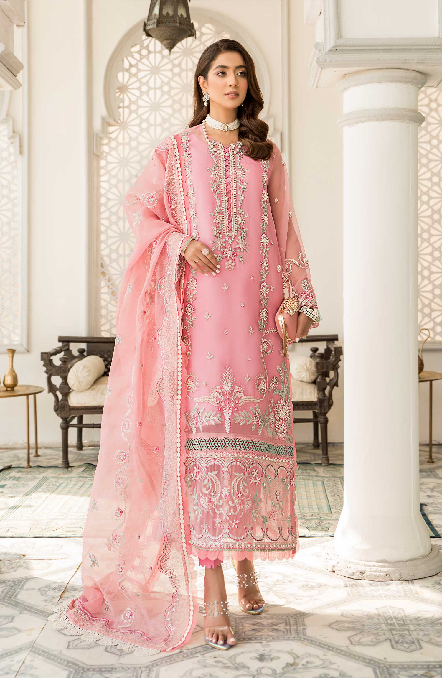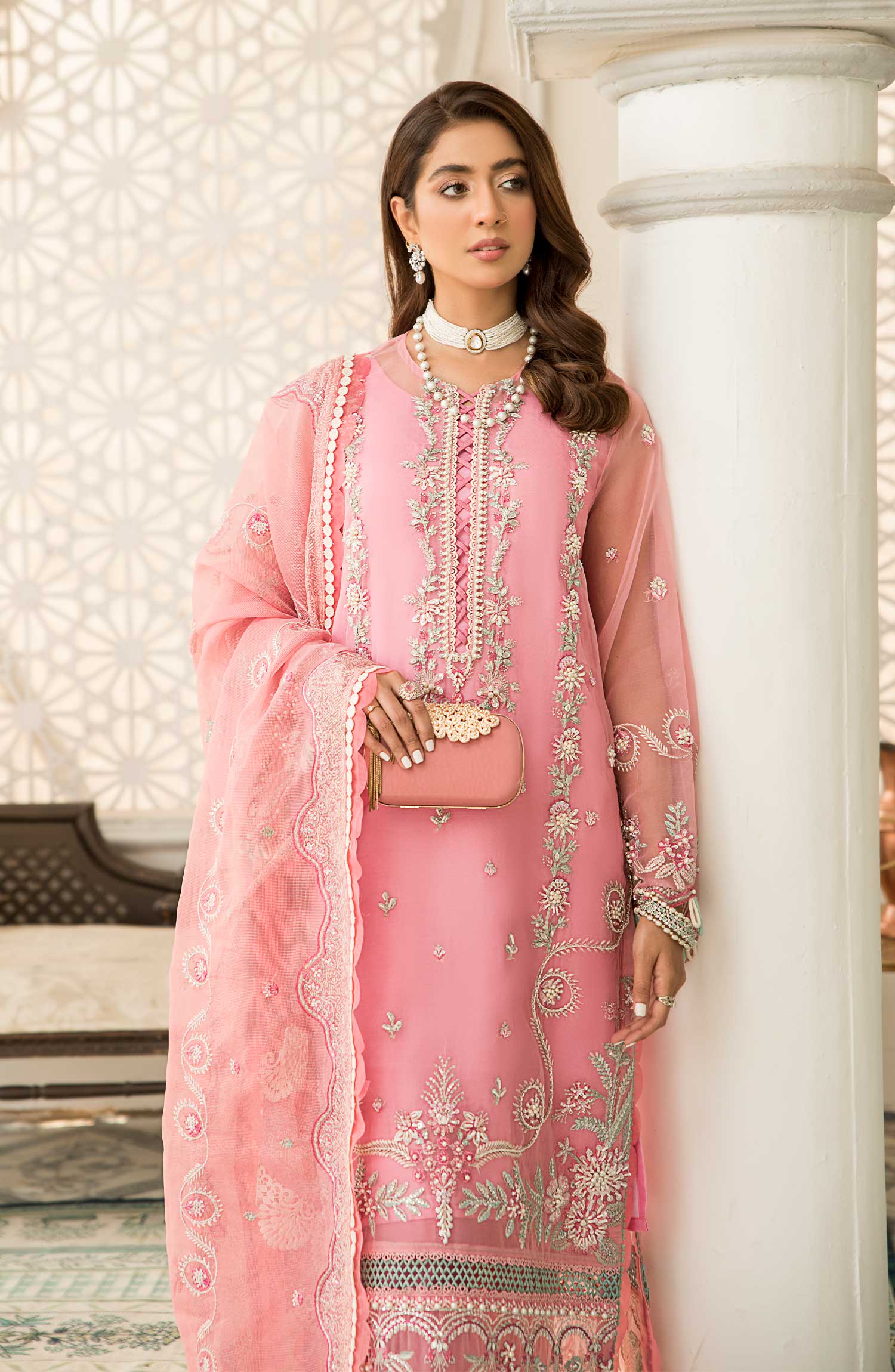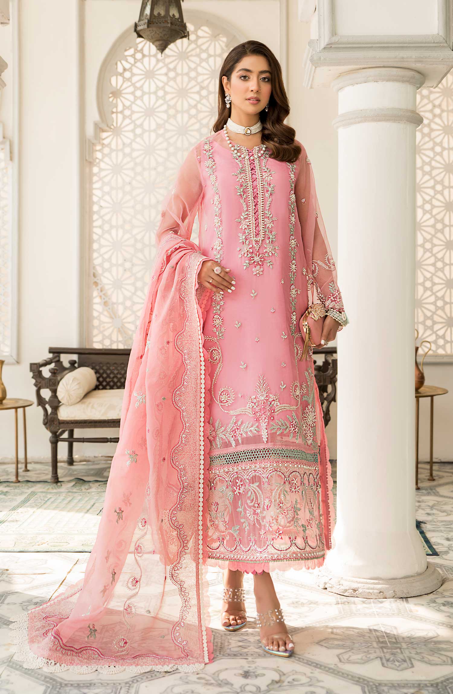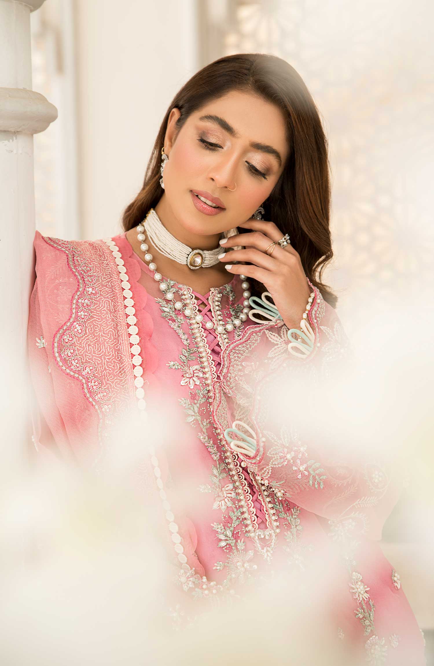 A stunning Pastel-pink straight shirt with a detailed neckline, embellished with embroidered borders at the front and back, and scalloped sleeves makes it a perfect addition to your formal closet. Amaaneh is paired with an embroidered khaadi net dupatta with heavily laced pallu that add richness to the look.