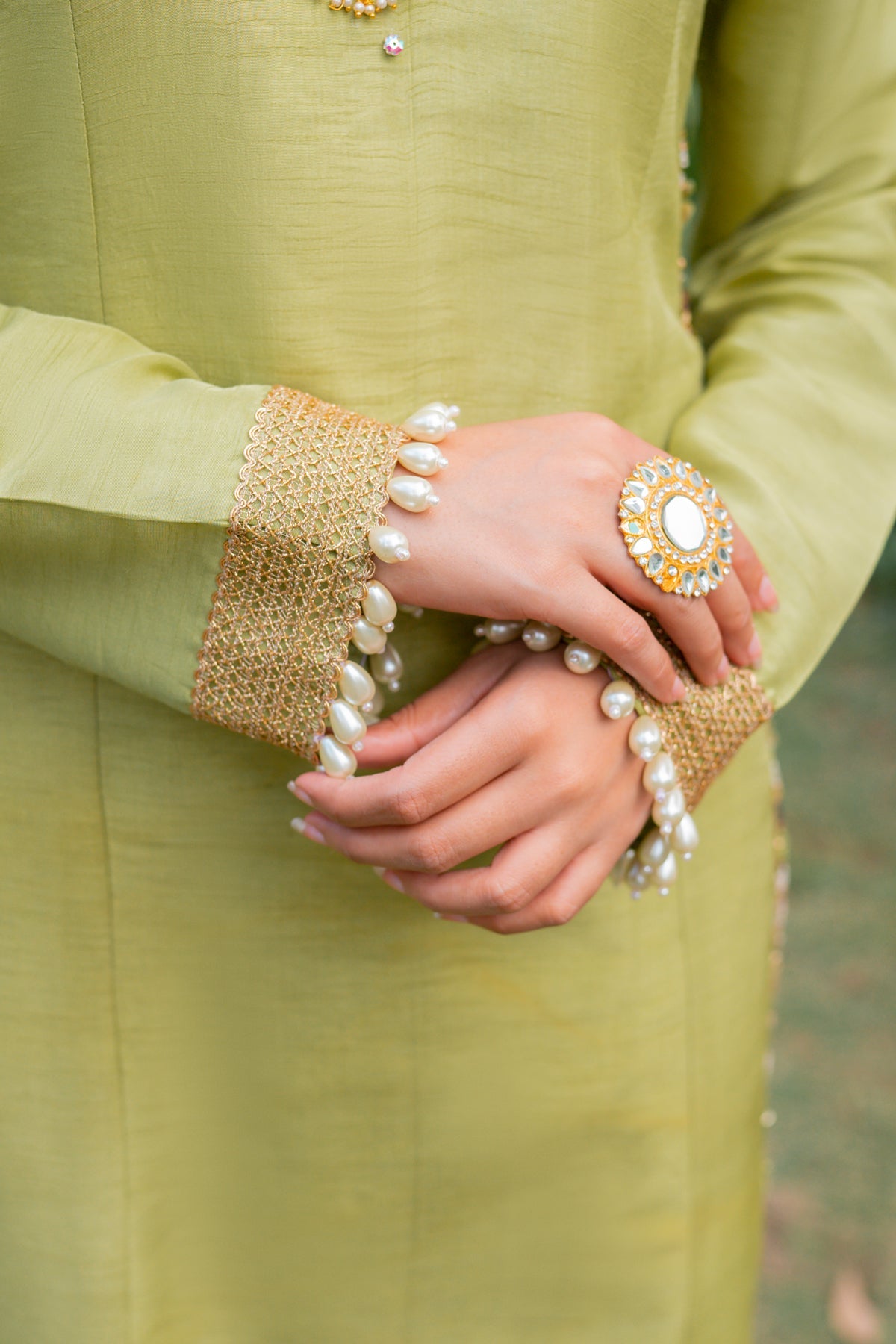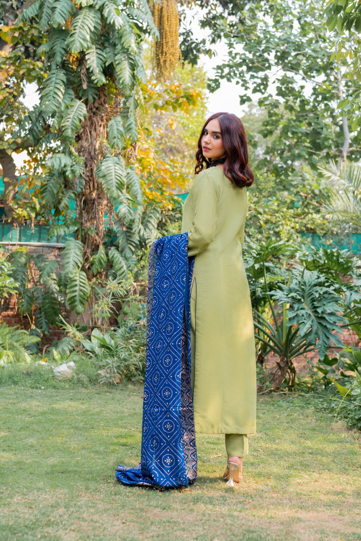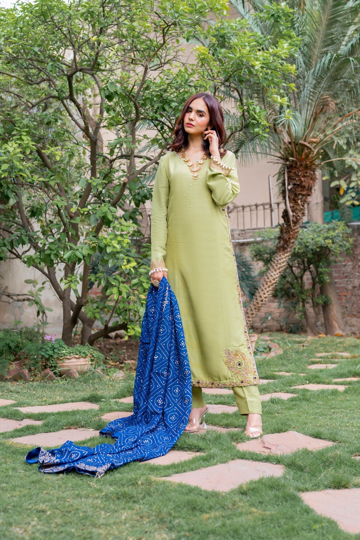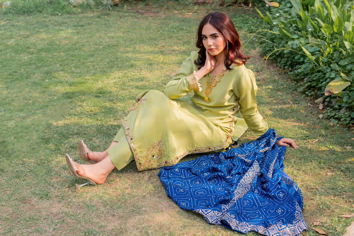 A vibrant sage green fabric is trimmed into an elegant long shirt and straight trousers. The shirt's border showcases meticulously intricate hand embellishments in rustic gold tones morphed into masterful artwork. A bright electric blue dupatta elevates the ensemble.