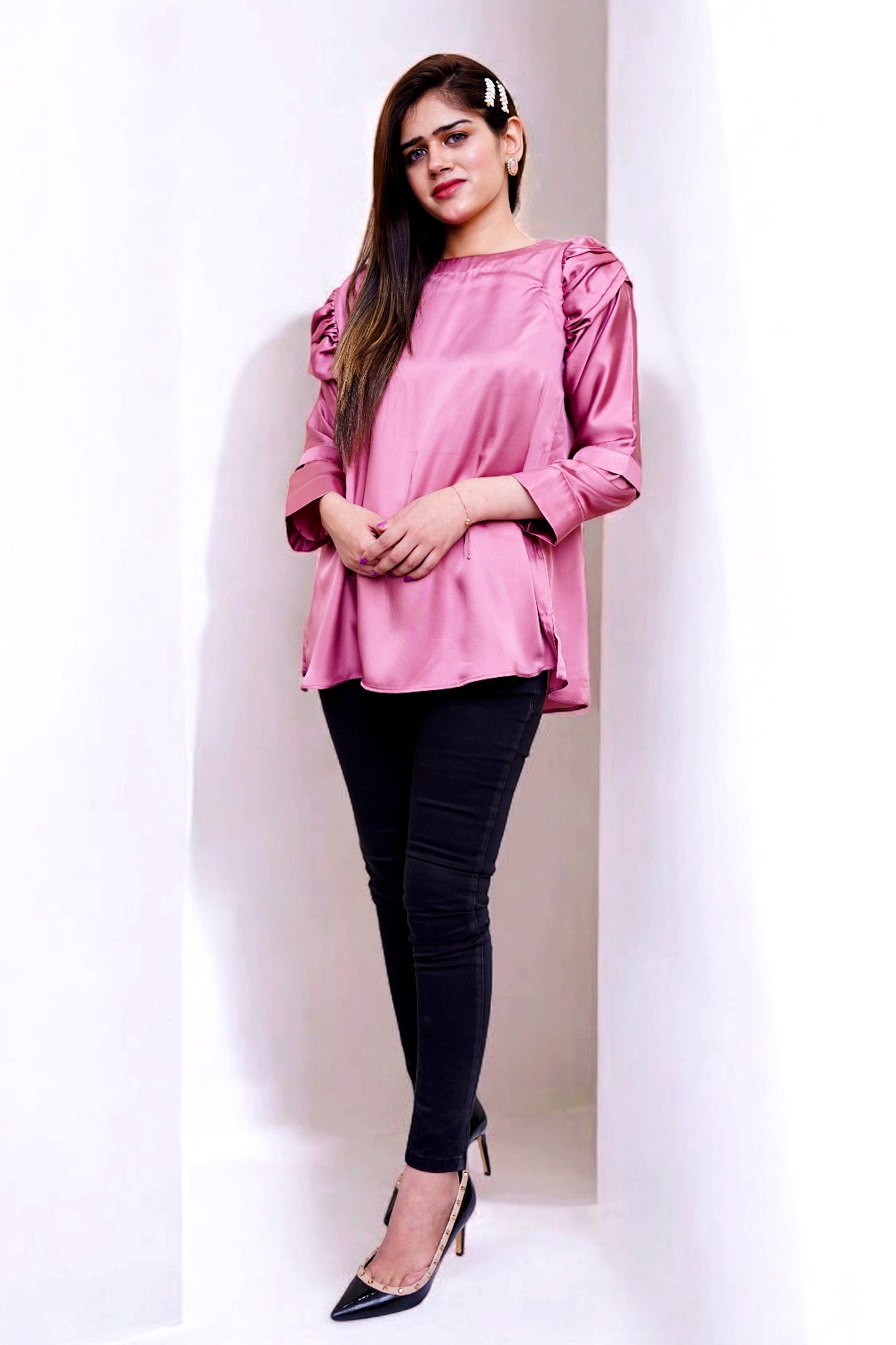 A luxurious pink Shamoze silk top with soft, voluminous puff sleeves. The smooth, lustrous fabric offers a refined sheen, while the puff sleeves add a playful, feminine silhouette. Ideal for a stylish and sophisticated look with a touch of elegance.