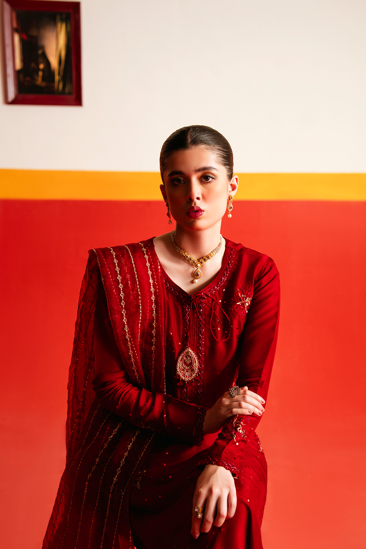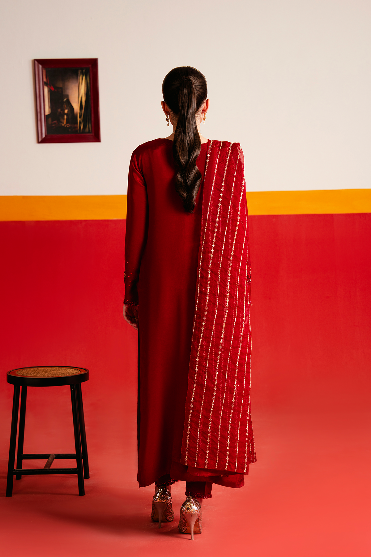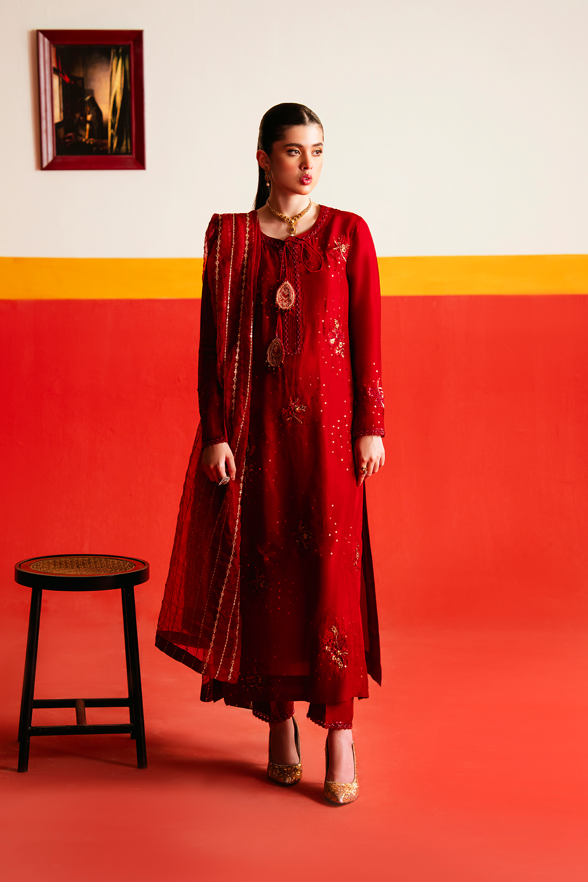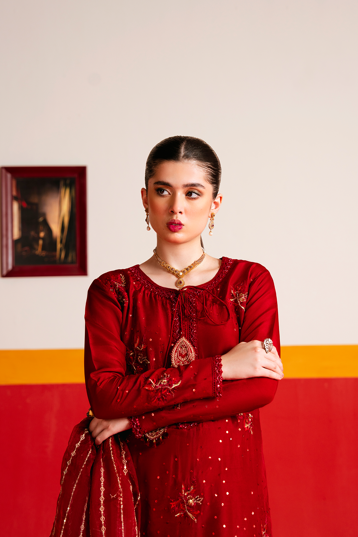 A striking crimson ensemble with a sequin-embroidered long shirt and tailored pants. A luxurious organza dupatta with sequin embellishments completes the look.
