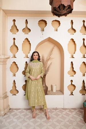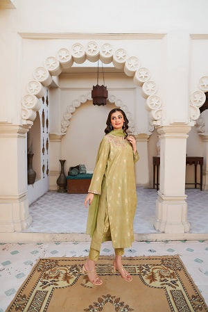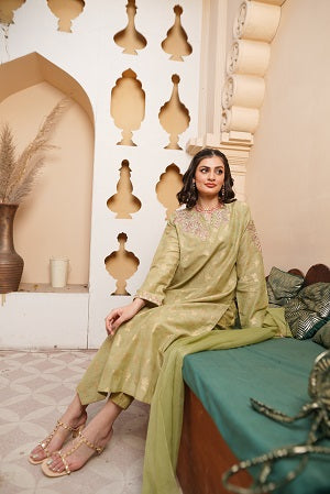 Elevate your evening with our semi formal Sage green masterpiece, adorned with mesmerizing embroidery and enchanting embellishment on cotton jacquard, this dress is a celebrating of sophistication and style adorned with delicate embroidery and subtle embellishments on the sleeves & neckline Paired with straight pants and a graceful organza dupatta for a semi-formal look that radiates timeless charm.”