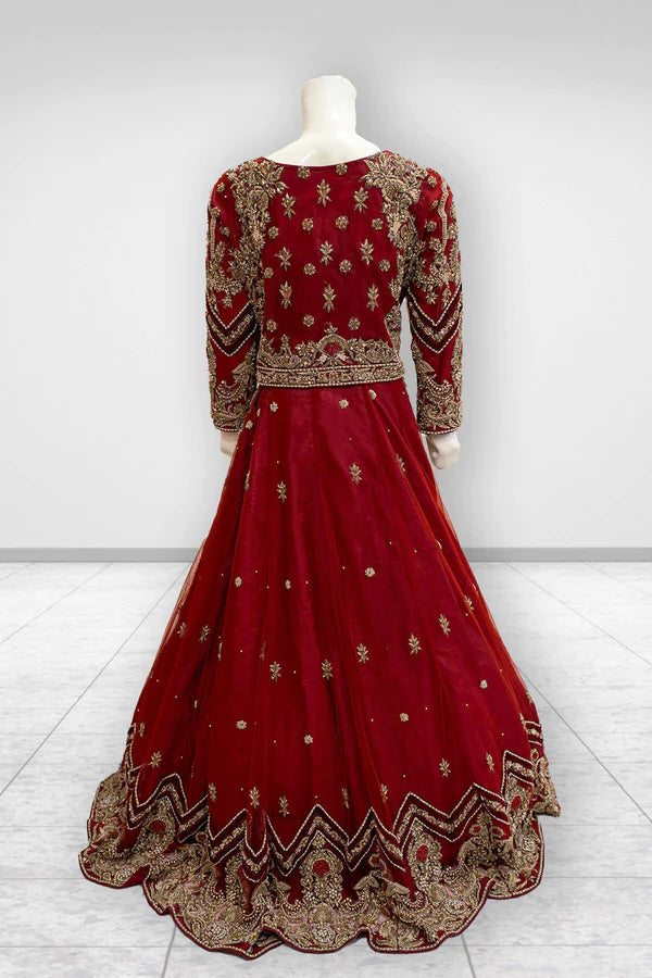 Introducing the Antique Crimson Majesty Lehenga from Designer Bridals by MJ by Madiha Jahangir, a timeless masterpiece exuding traditional allure. This exquisite ensemble features a captivating Red Lehenga paired with a shirt adorned in an antique traditional look, embellished with golden antique, red thread, white pearls, champagne crystals, and skin sequins. Crafted in a rich pure red hue, this three-piece suit includes the Lehenga, Cholli, and Dupatta, showcasing impeccable craftsmanship and regal elegance. Embrace the essence of heritage and sophistication on your special day with this resplendent bridal attire