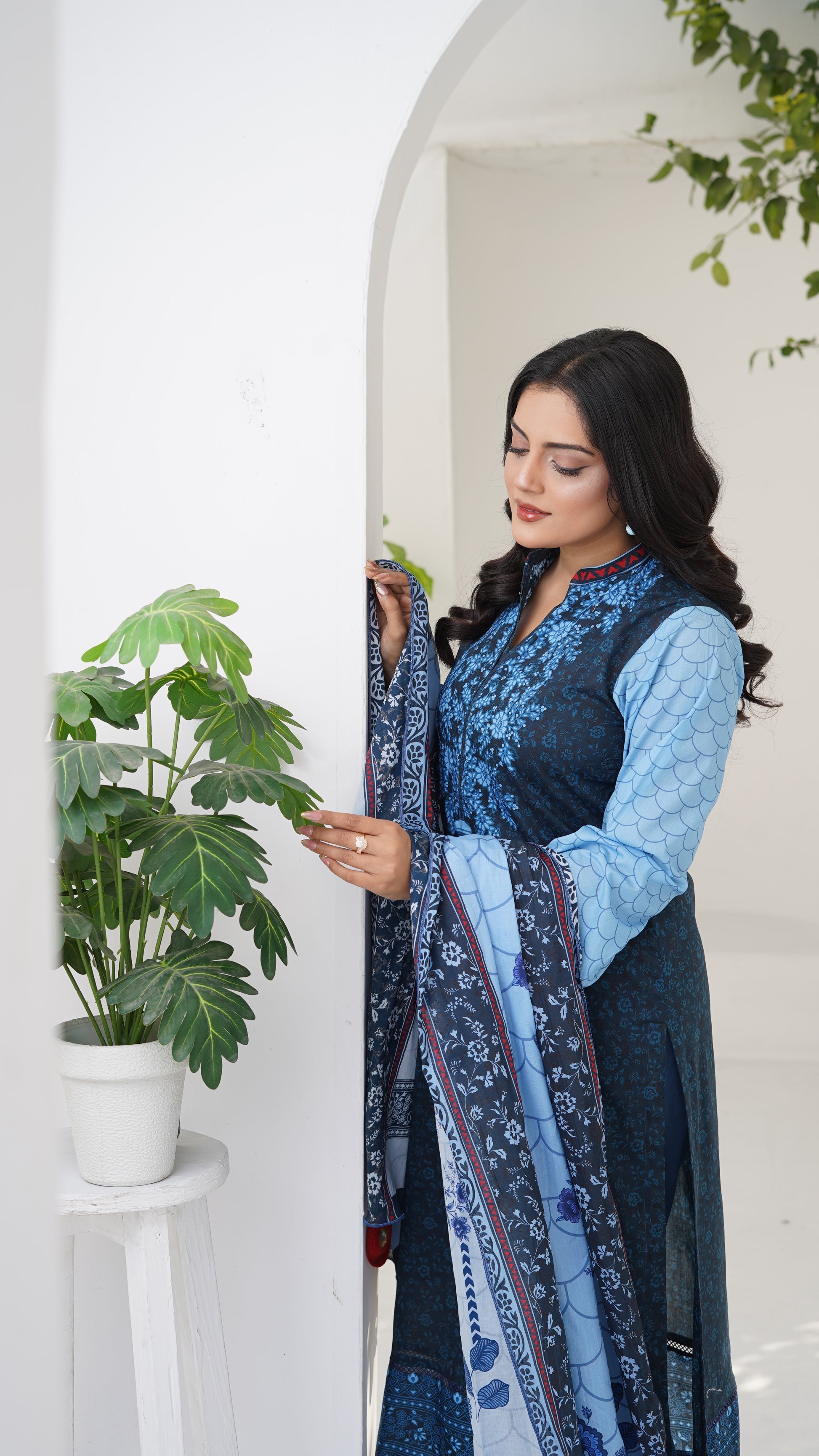 The Midnight Azure ensemble is a striking piece inspired by the deep, mysterious hues of the night sky.