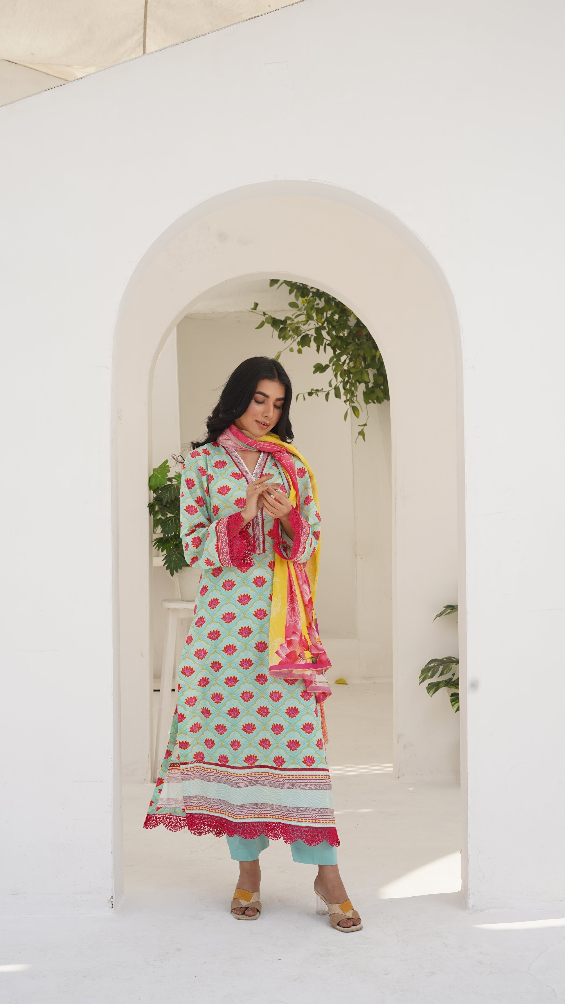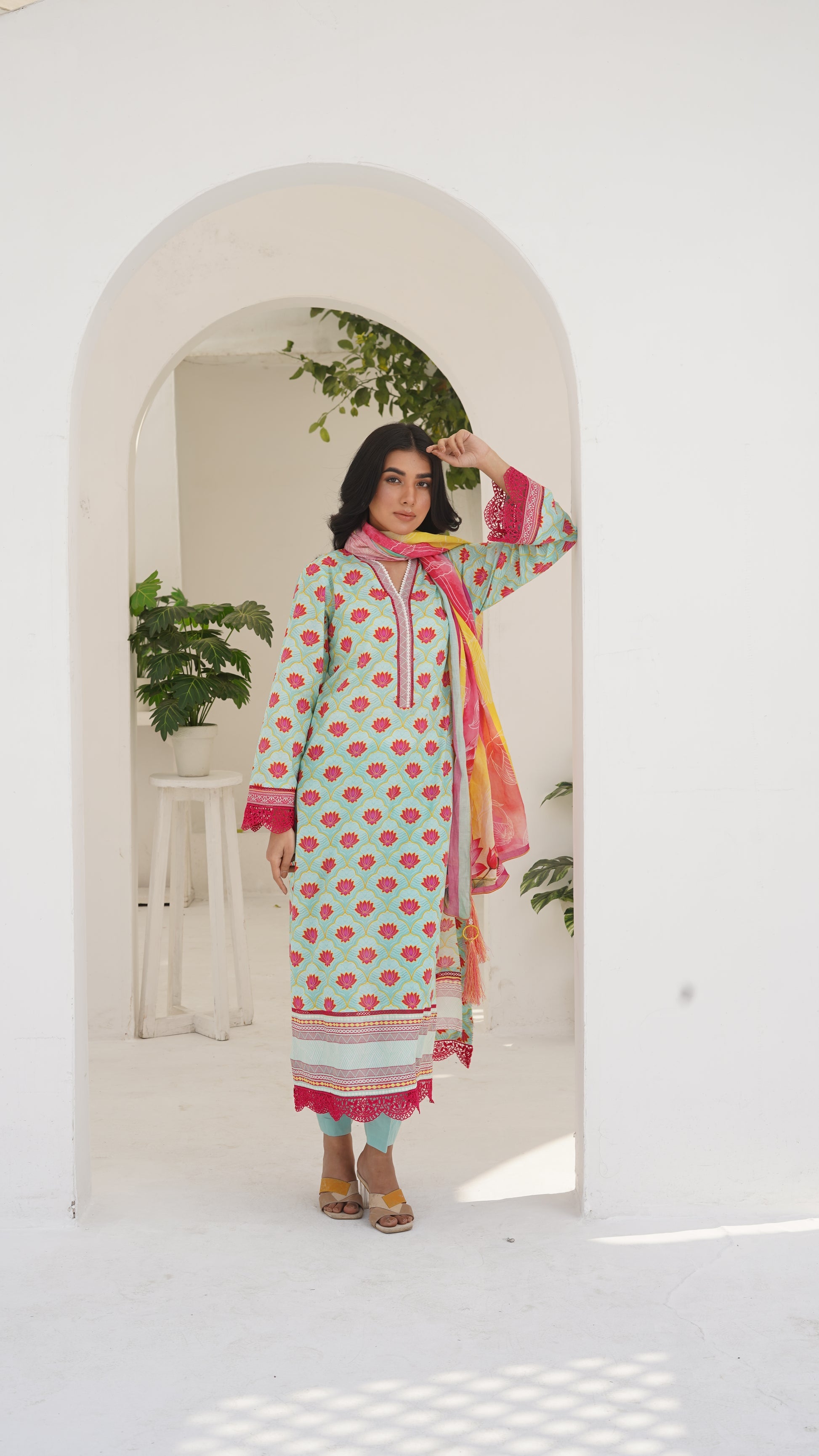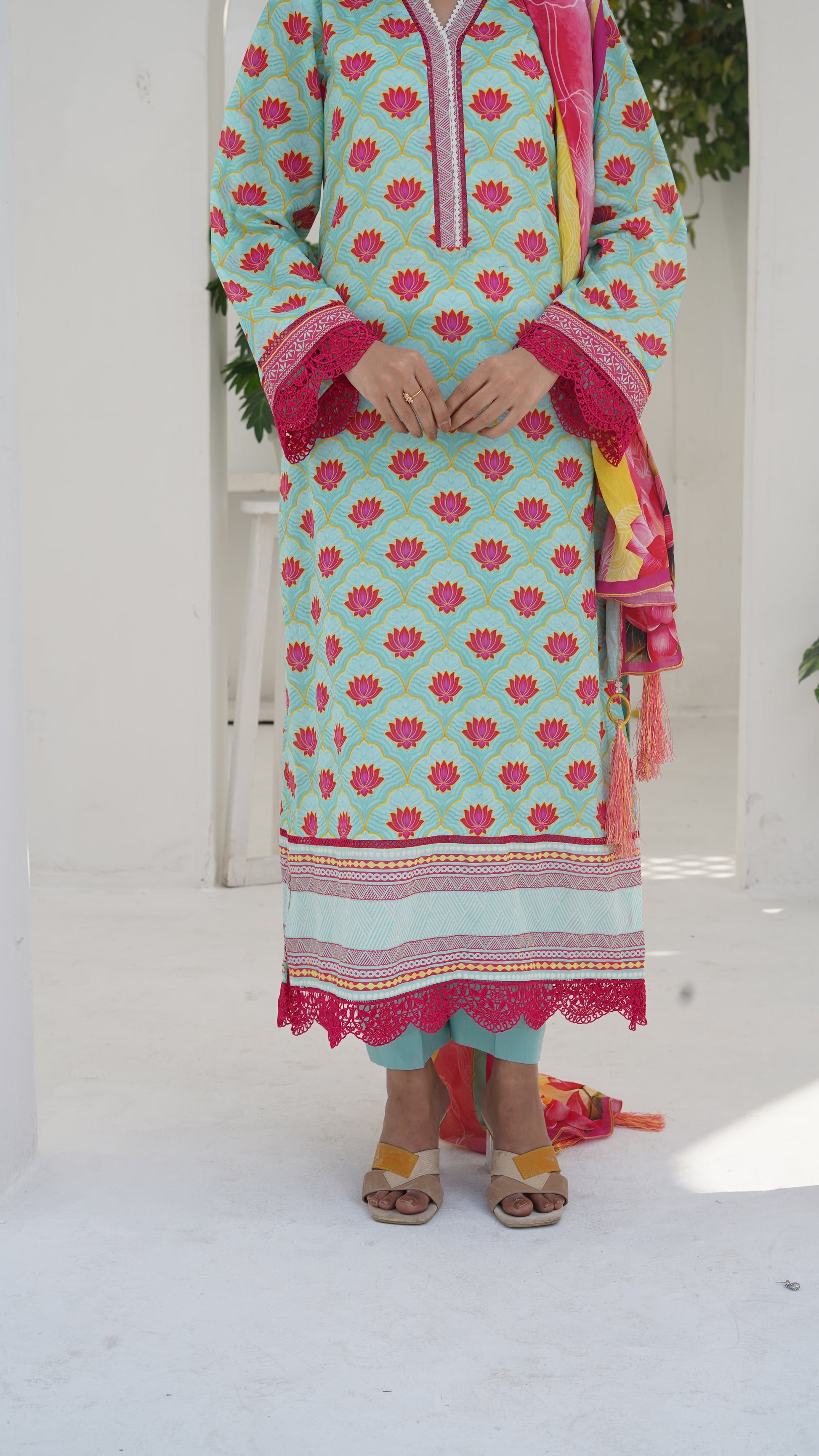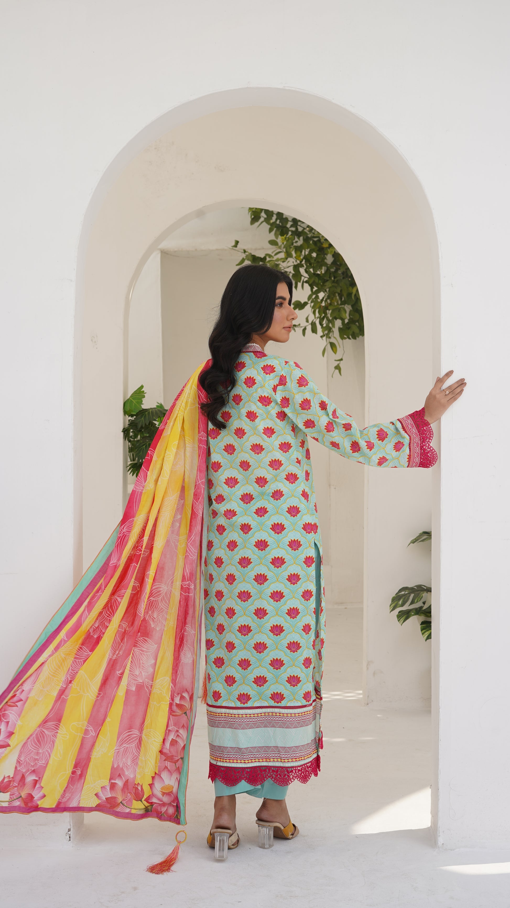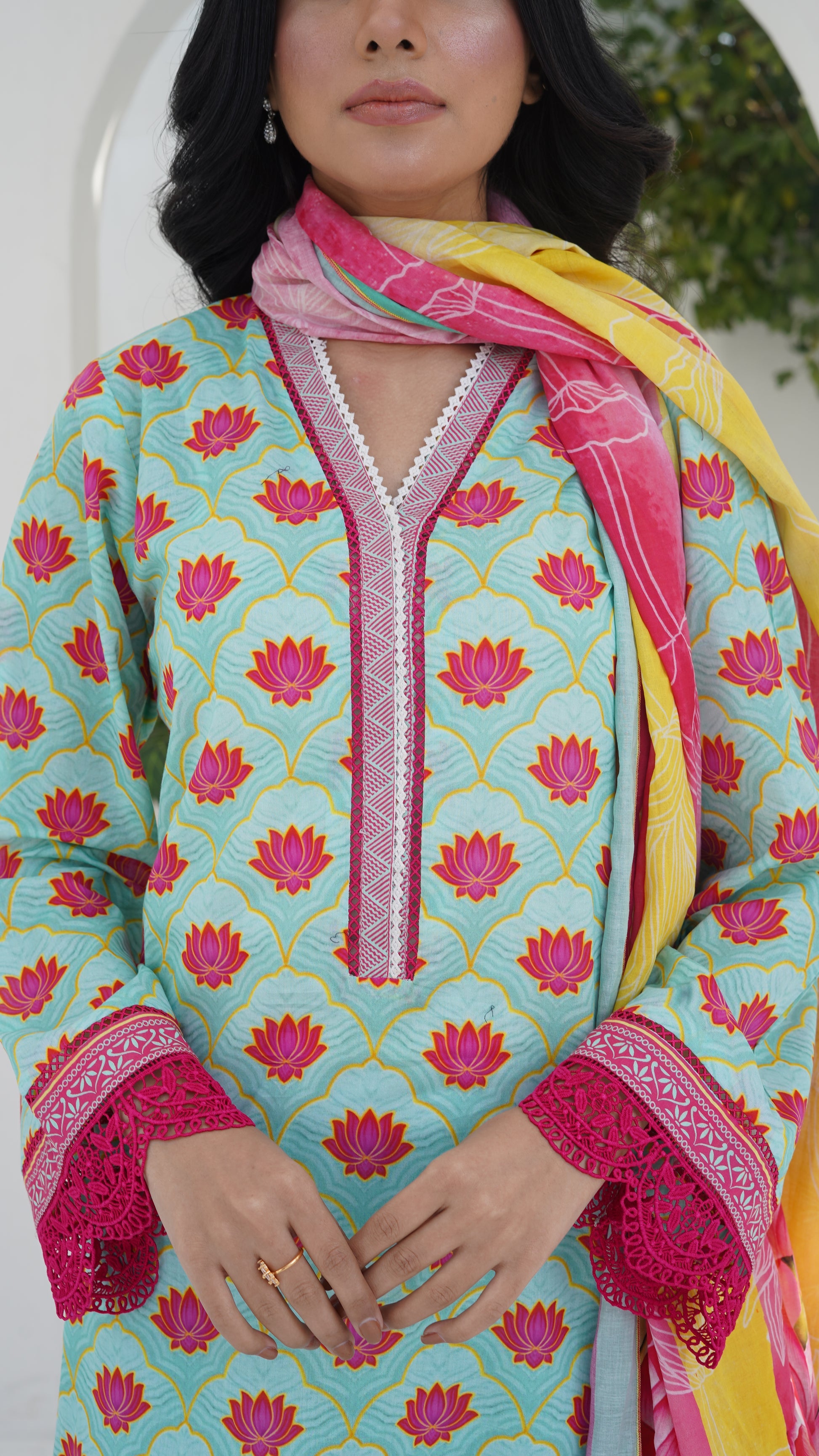Verdant Glow radiates freshness in a serene aqua canvas adorned with vibrant lotus blooms.