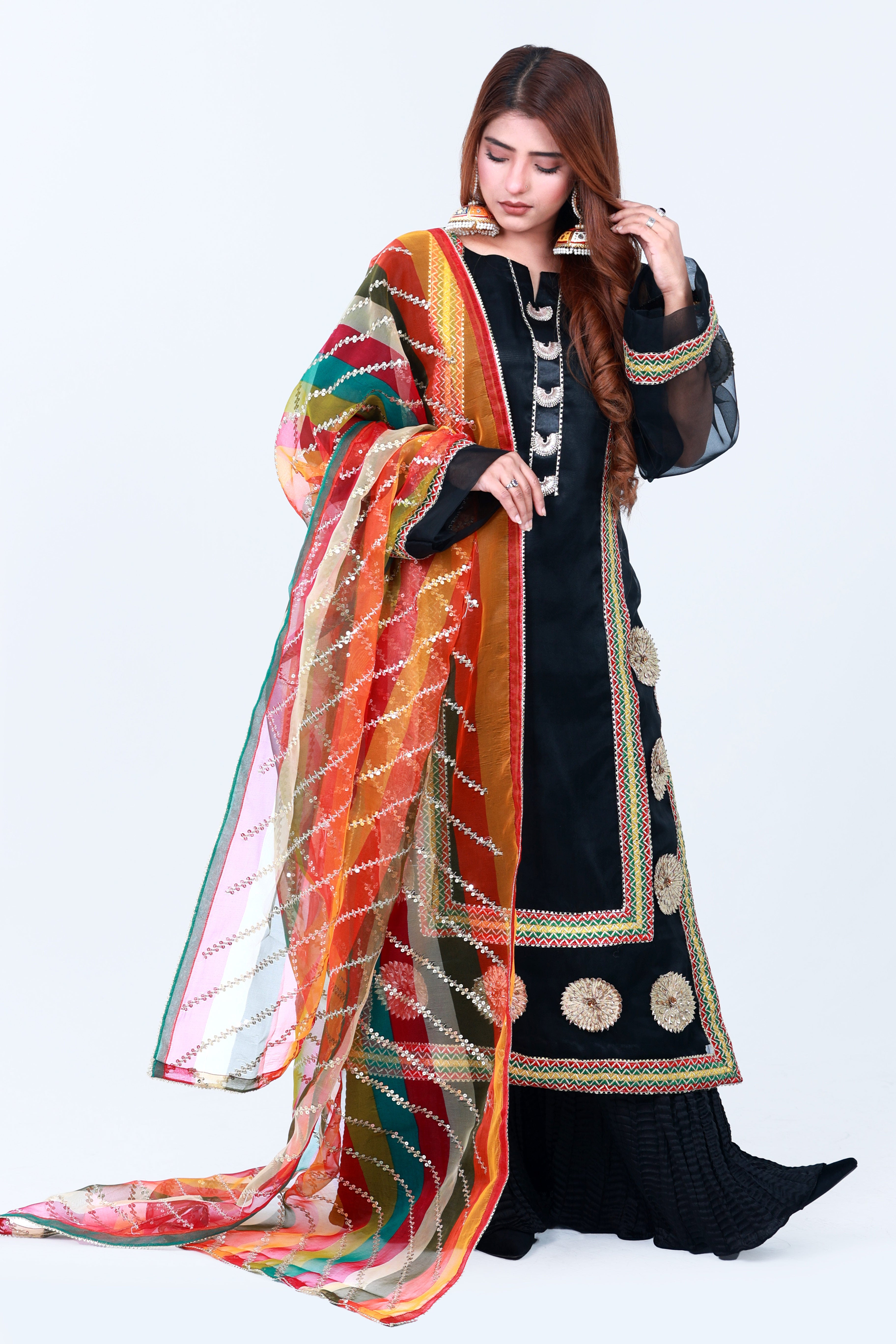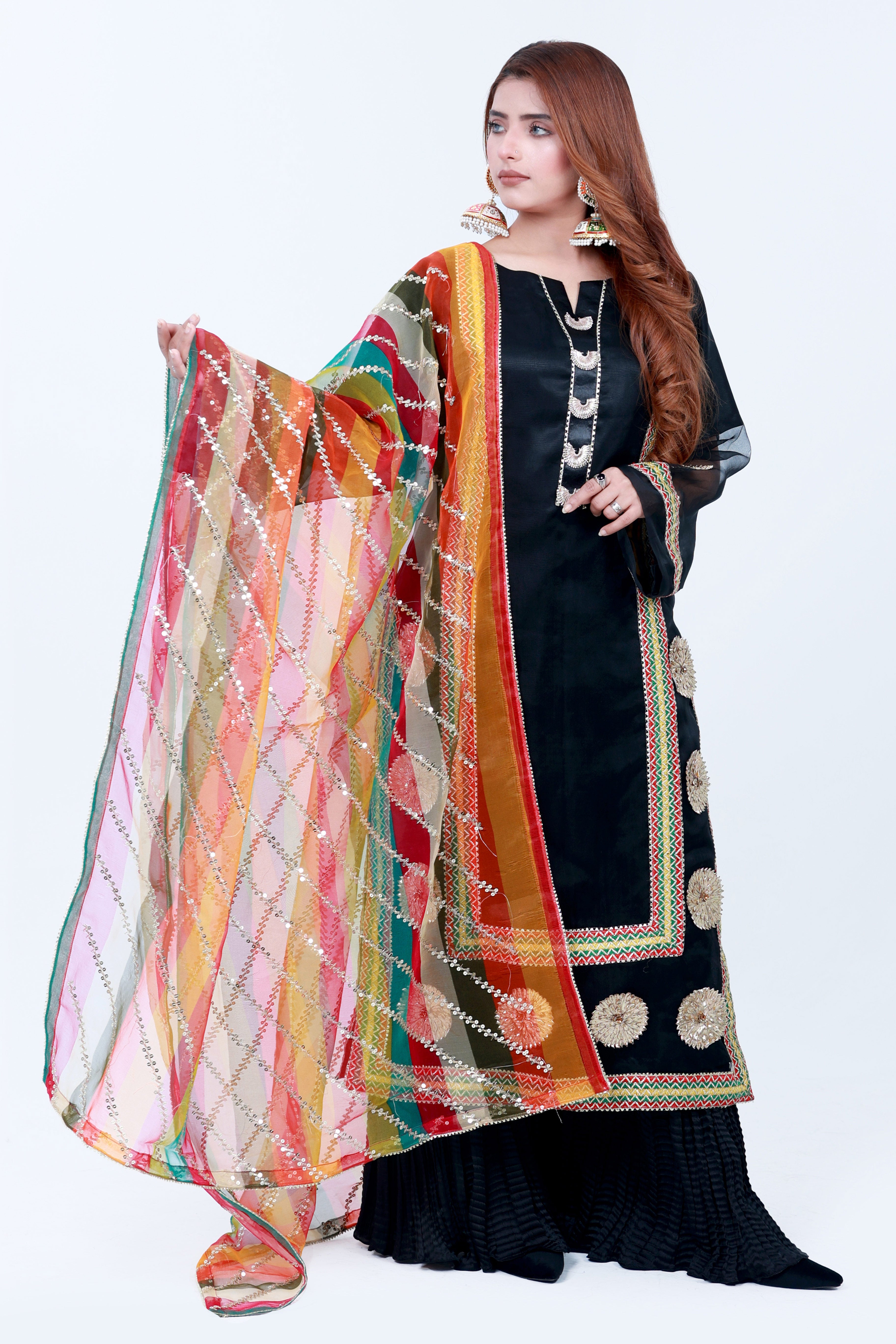 Basanti our striking black Gotta Work Dress featuring intricate gotta work. Add a pop of color in your dress BASANTI is perfect blend of elegance & playfulness, to brighten up your day. Basanti paired with a stunning multicolored dupatta.