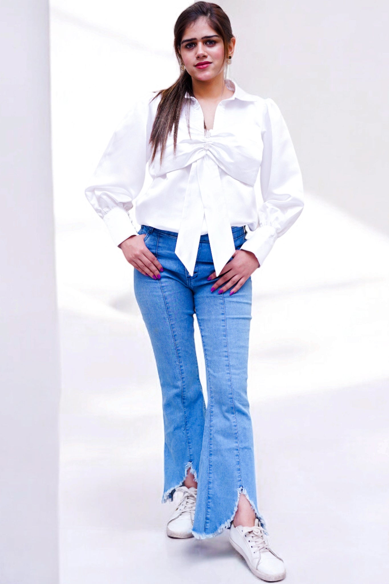 A stunning white silk top featuring a bold, oversized front bow. The luxurious silk fabric adds a smooth, elegant finish, while the statement bow creates a dramatic, feminine look. Perfect for a chic and sophisticated style.