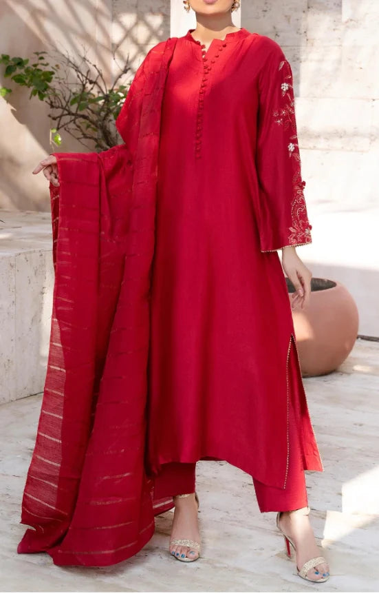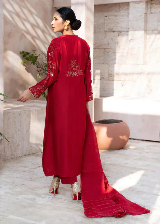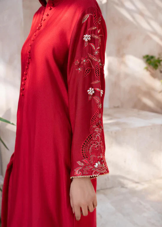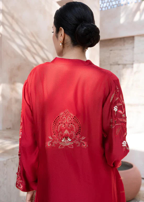 A rhapsody of red intricate with geometric embroidery design with Sequins and thread work design along with Handcraft of Crystals, Sheesha moti, and White Pearls to make the ensemble more classic with Rawsilk Pants. Embrace the traditions with our stunning festive collection!