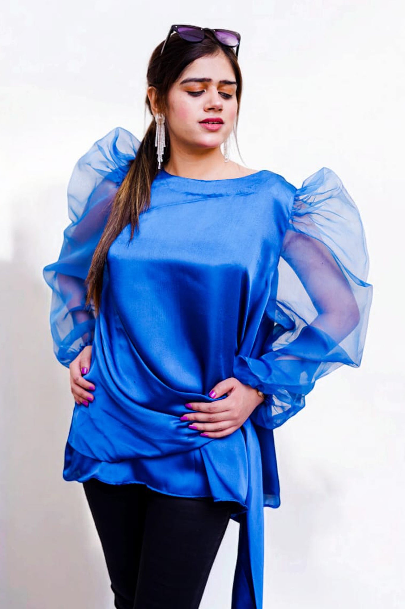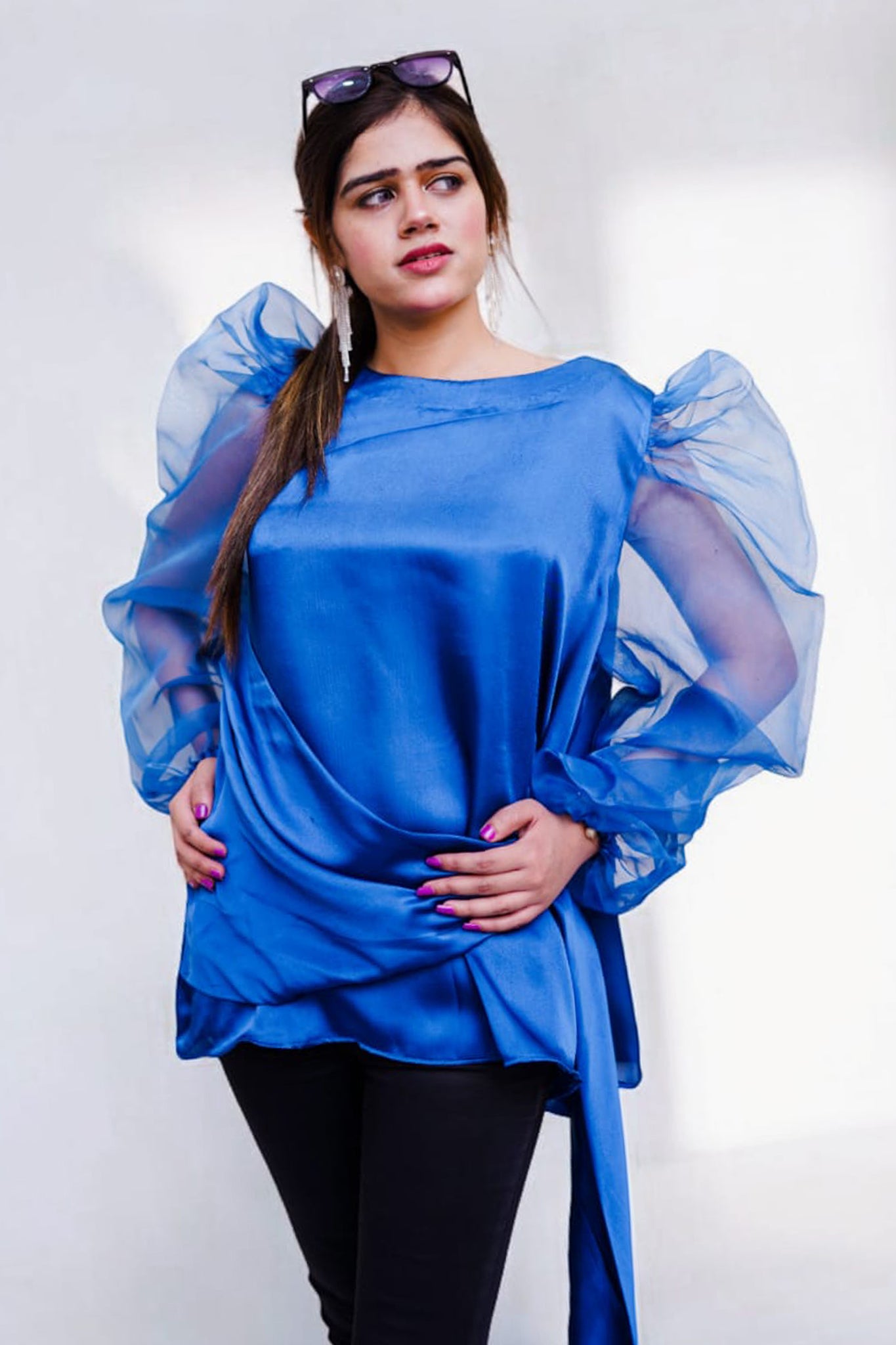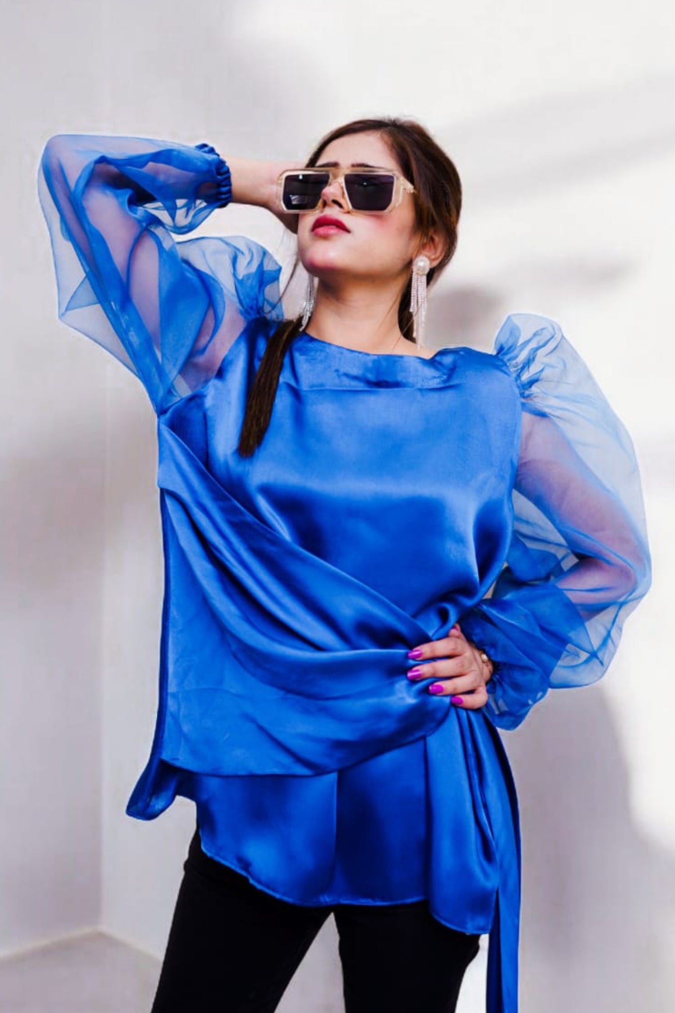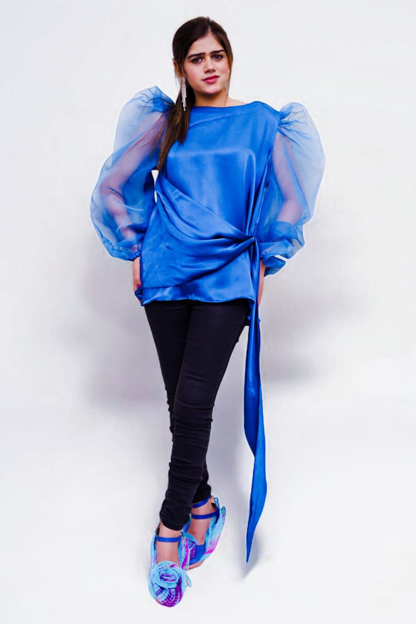 A refined Shamoze silk top with a flattering bow at the waist and delicate organza puff sleeves. The soft silk fabric offers a luxurious feel, while the bow accentuates the waist for a feminine silhouette. The airy puff sleeves add a touch of drama and elegance.