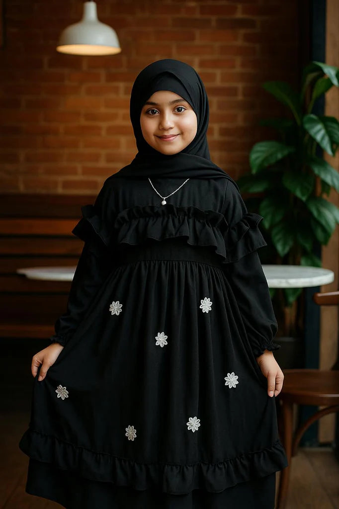 This abaya is a celebration of modesty with a playful flair—perfect for Eid, family events, or simply making her feel like the little queen she is.