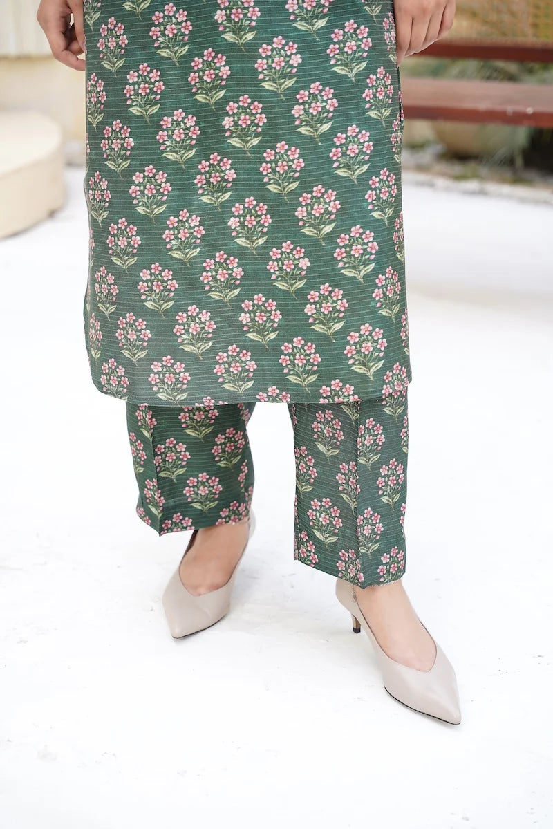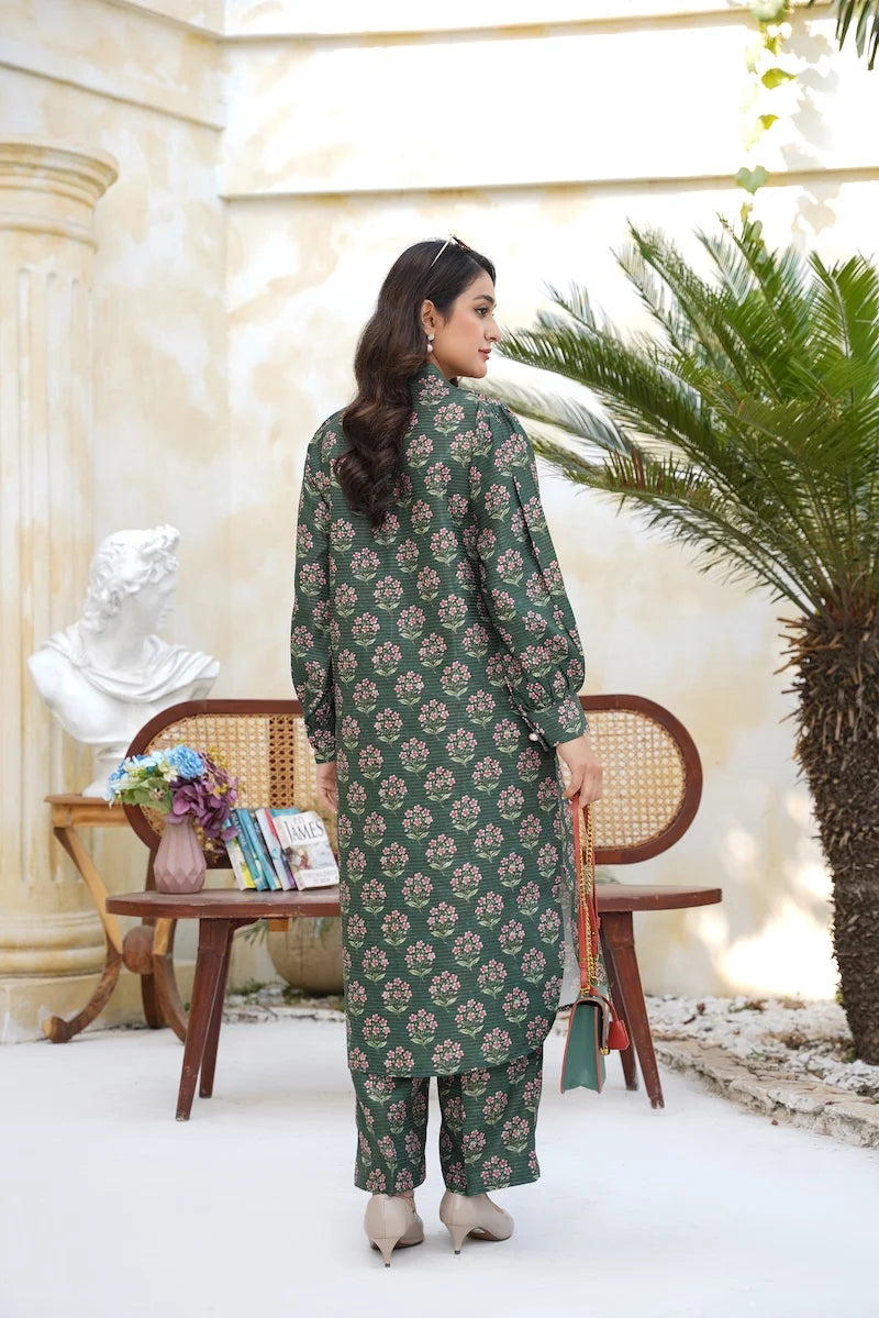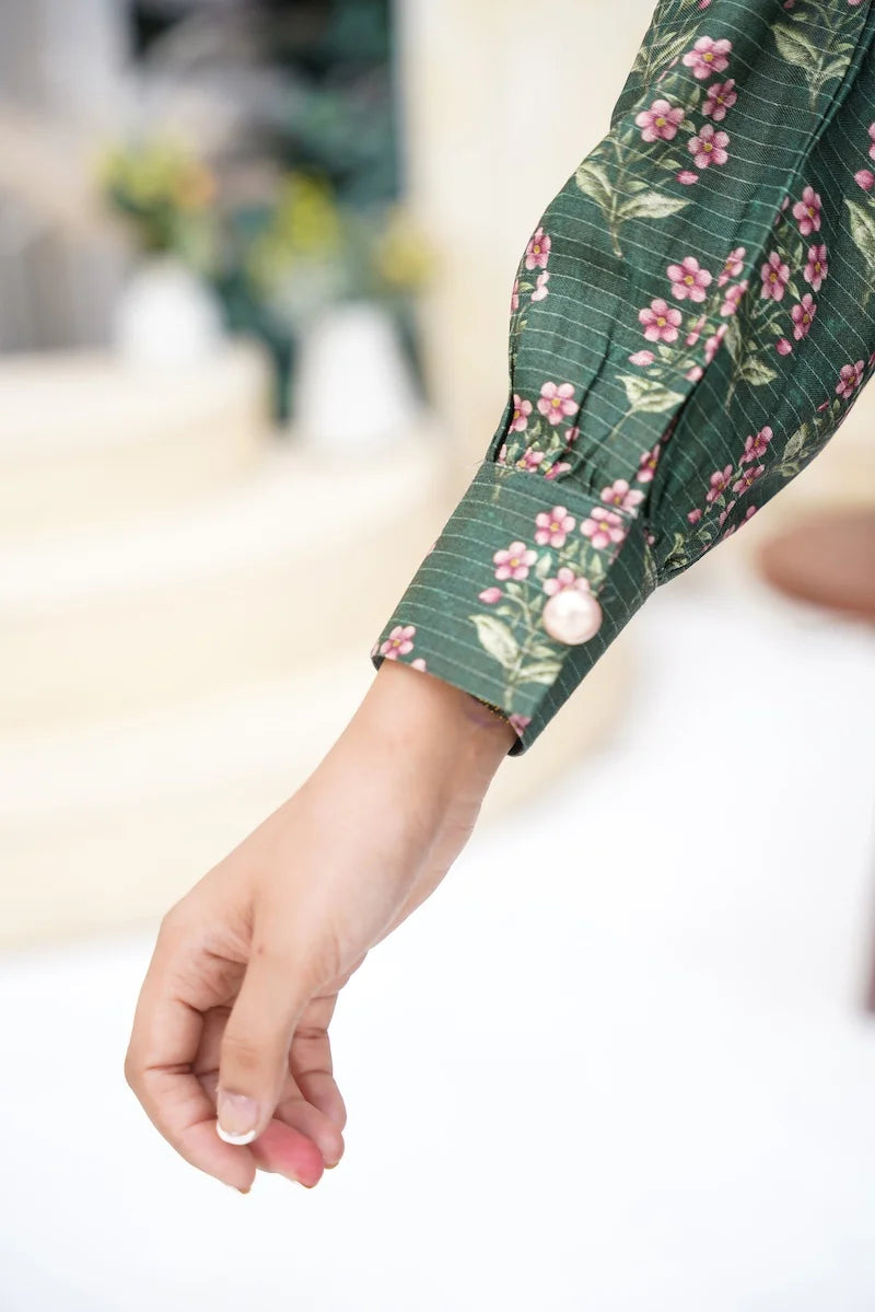 Shirt: A long shirt featuring collared neck, pleated sleeves, buttoned cuffs, and side pockets