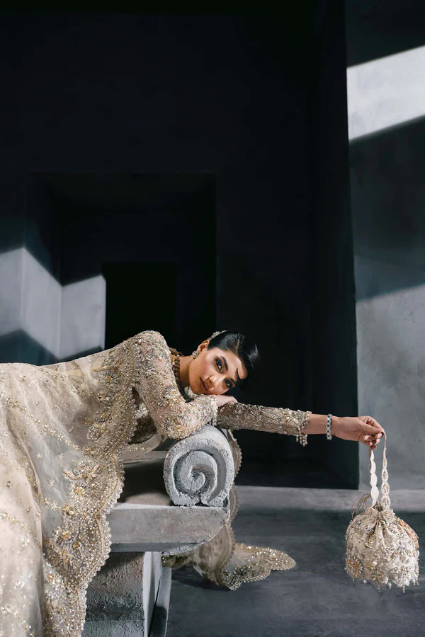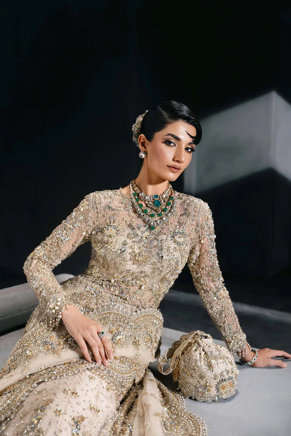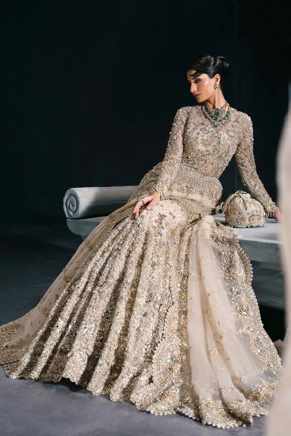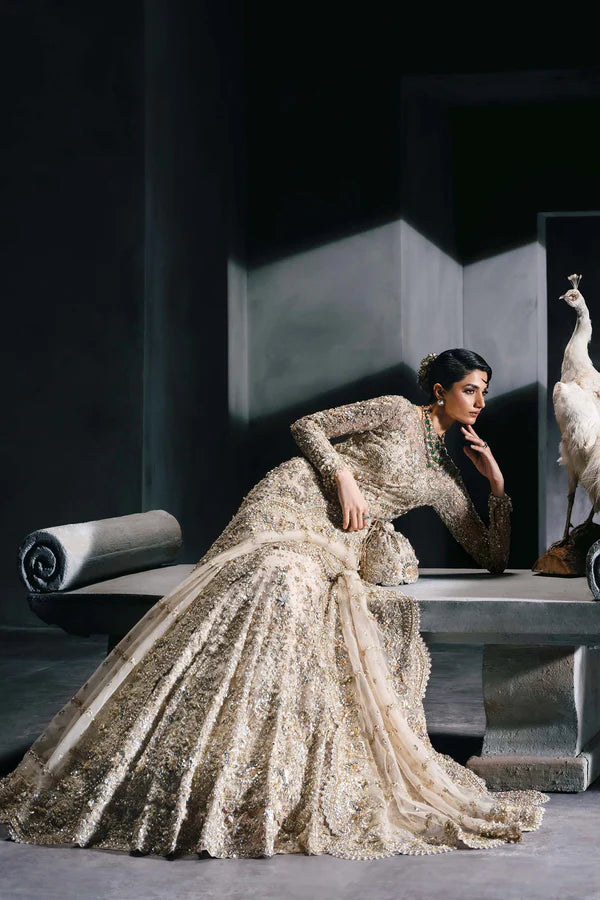 Radiate regal charm in this exquisitely detailed bridal lehenga by Akbar Aslam. Featuring a fully embellished bodice with intricate hand embroidery, crystals, and sequins, the ensemble flows into a luxuriously flared skirt adorned with shimmering gold accents. The high neckline and full sleeves offer a classic silhouette, while the scalloped dupatta drapes gracefully, enhancing the look with its ornate borders. Finished with a handcrafted pouch and styled with statement emerald jewelry, this look is a perfect fusion of traditional splendor and modern sophistication—ideal for the bride who seeks timeless elegance on her big day.