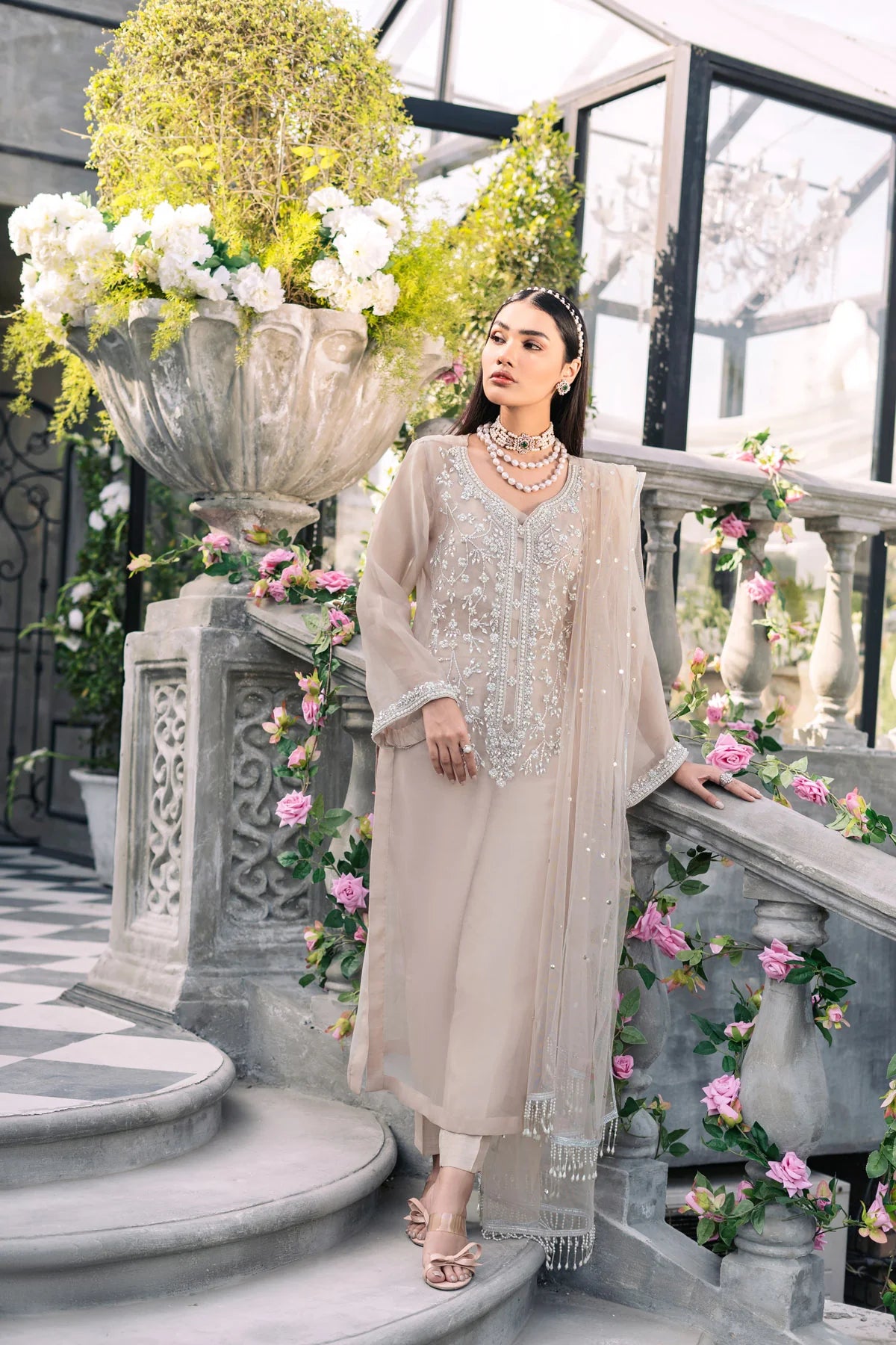 The charismatic Celine outfit includes a Pink organza shirt showing off a neckline with Ari and naqsha handwork. It’s a gorgeous piece covered in stone and beadwork that is crafted to perfection. The embellished sleeves flawlessly balance the structure of whole attire exhibiting a sublime glossy look. The outfit is matched up with a chatta lined net dupatta, Korean raw silk pants and a crop slip