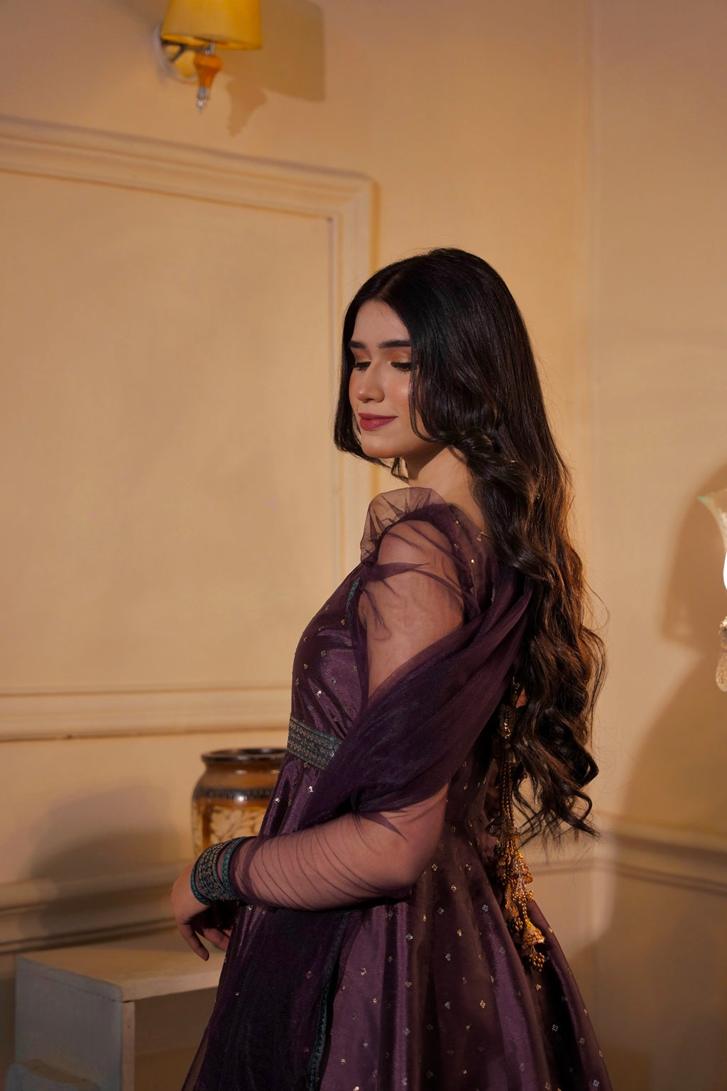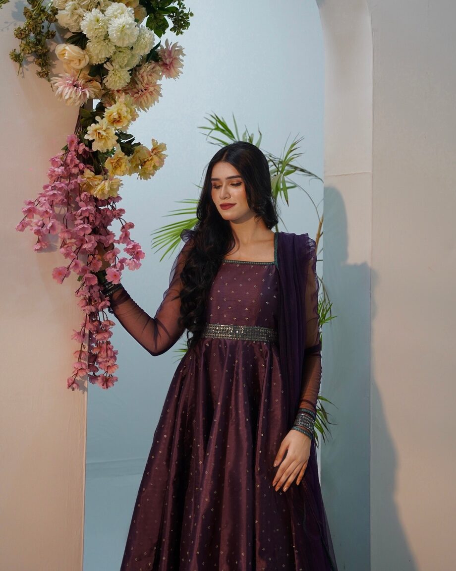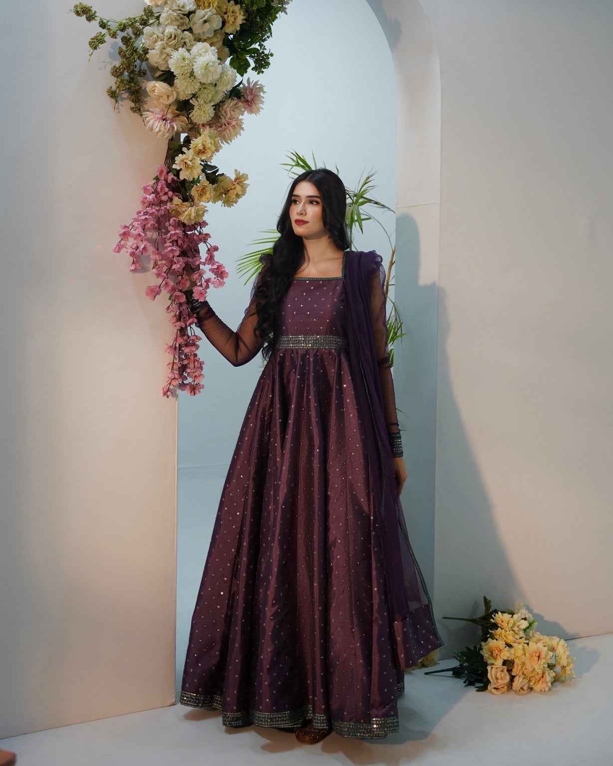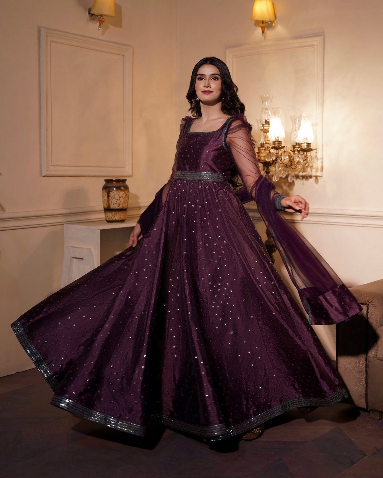 “Chamkeli” – a mesmerizing plum raw silk frock with an elegant net dupatta. Fully embroidered with a stunning sea green contrast and intricate sitara embroidery, this outfit radiates grace. With an impressive 8-yard flare, it’s perfect for a statement festive look!