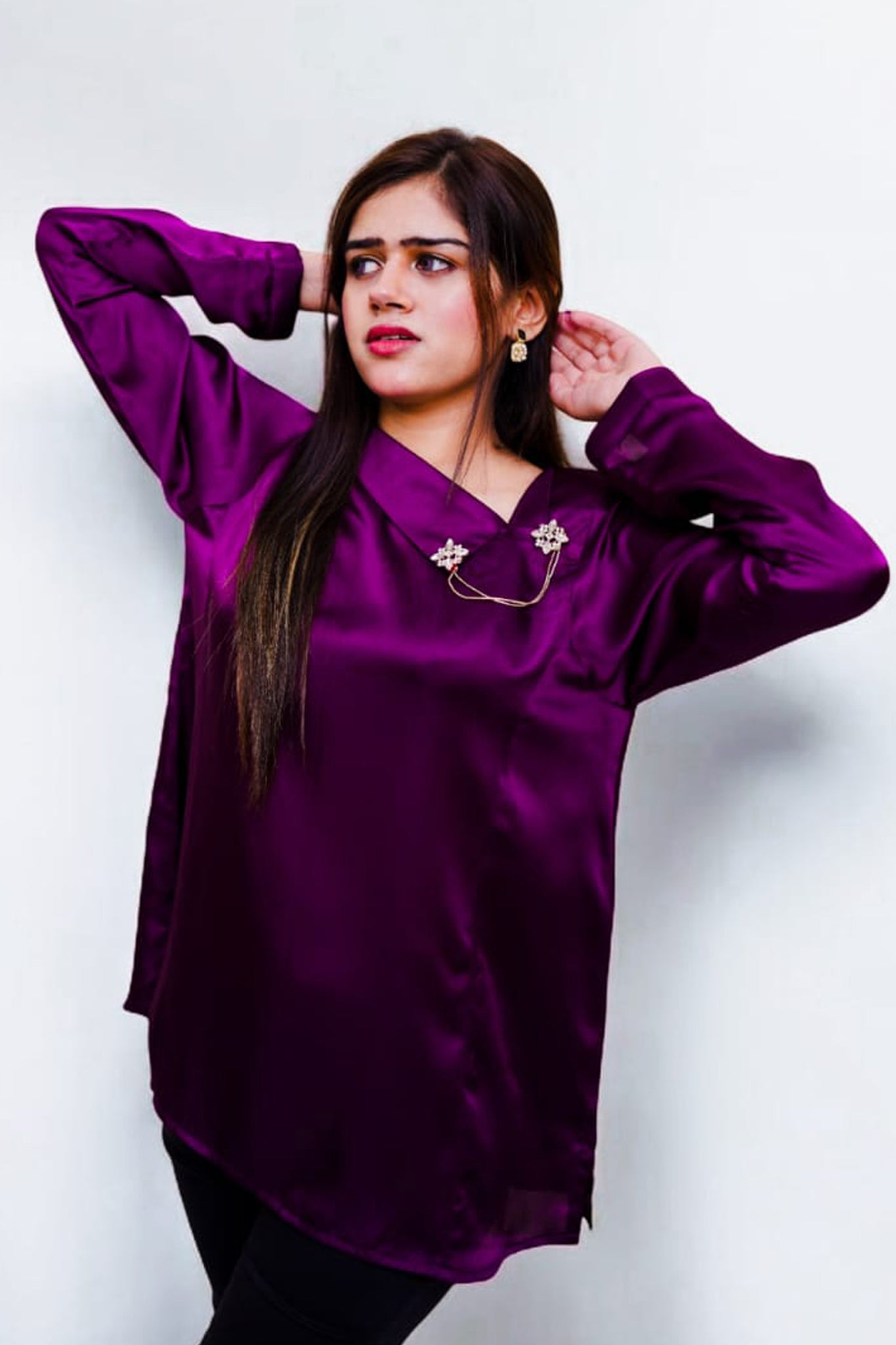 A stunning purple Shamoze silk top adorned with a handcrafted brooch. The vibrant color of the top is complemented by the intricate, handmade brooch, adding a touch of unique elegance and craftsmanship to the design. Perfect for a refined and stylish look.