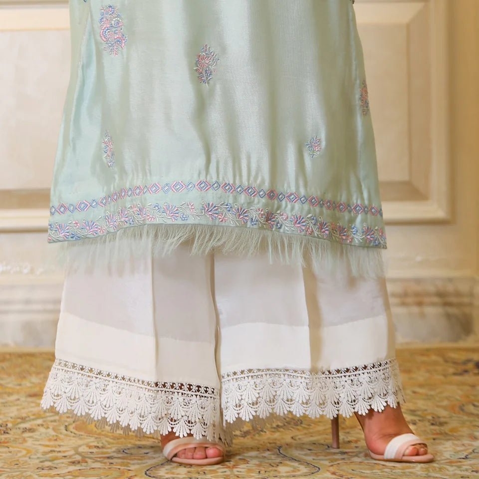 A fresh light mint green outfit crafted on pure cotton net, adorned with delicate pink and blue reesham embroidery, paired with a light pink organza dupatta featuring intricate embroidery for a soft, elegant look.