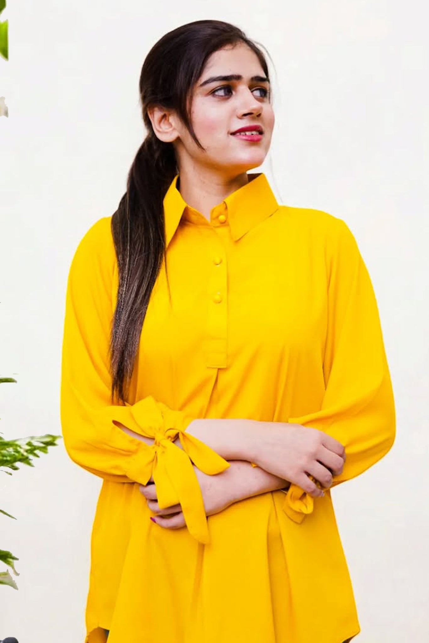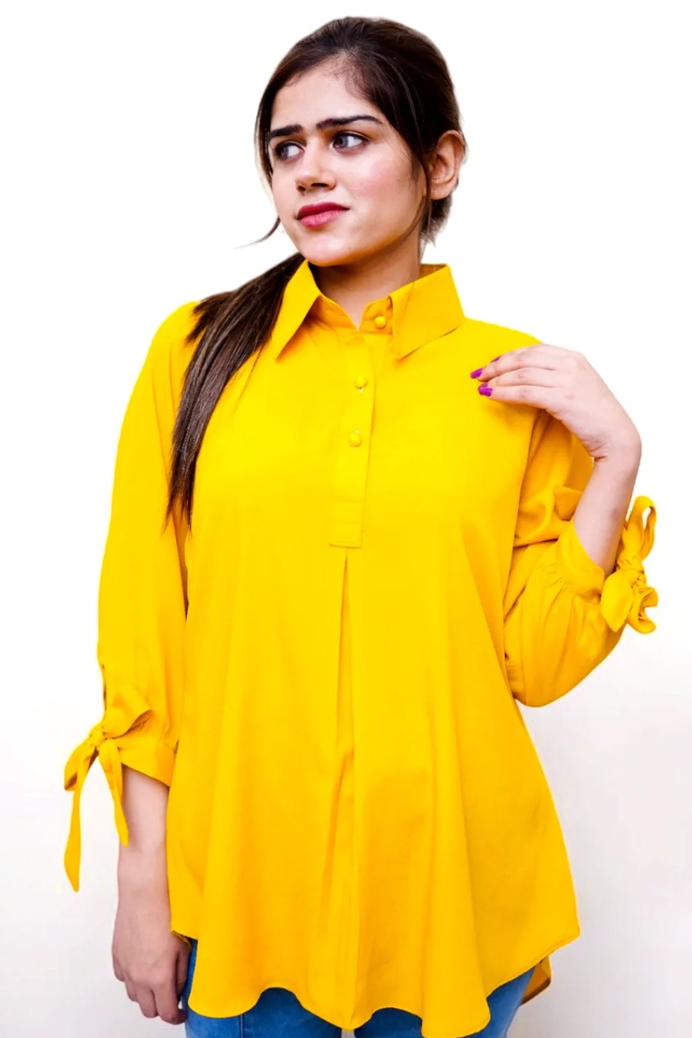A vibrant yellow grip top featuring stylish bow-tied sleeves. The bold color and playful bow details on the sleeves add a feminine and fun touch, making it a perfect choice for a chic and eye-catching look.