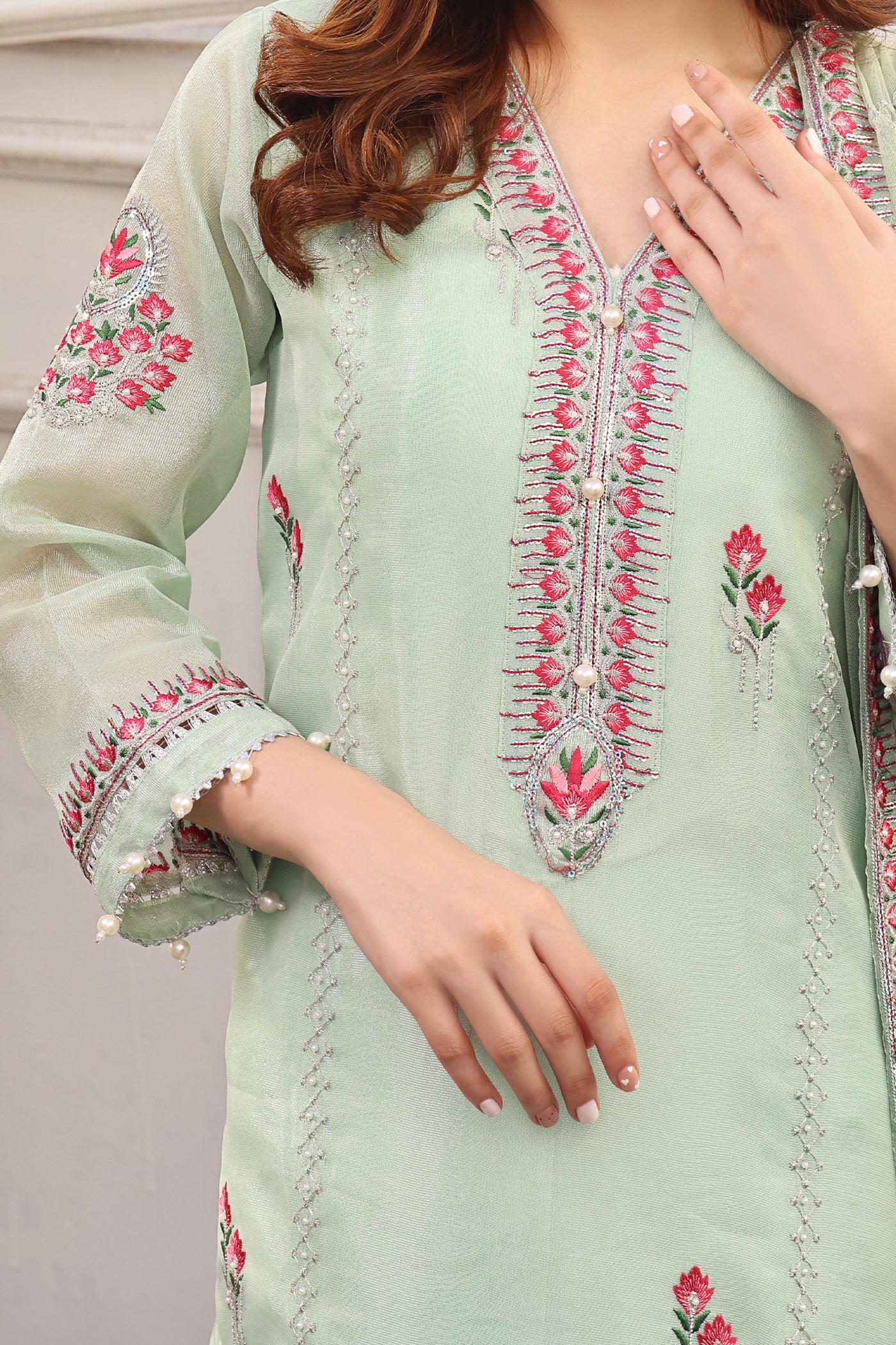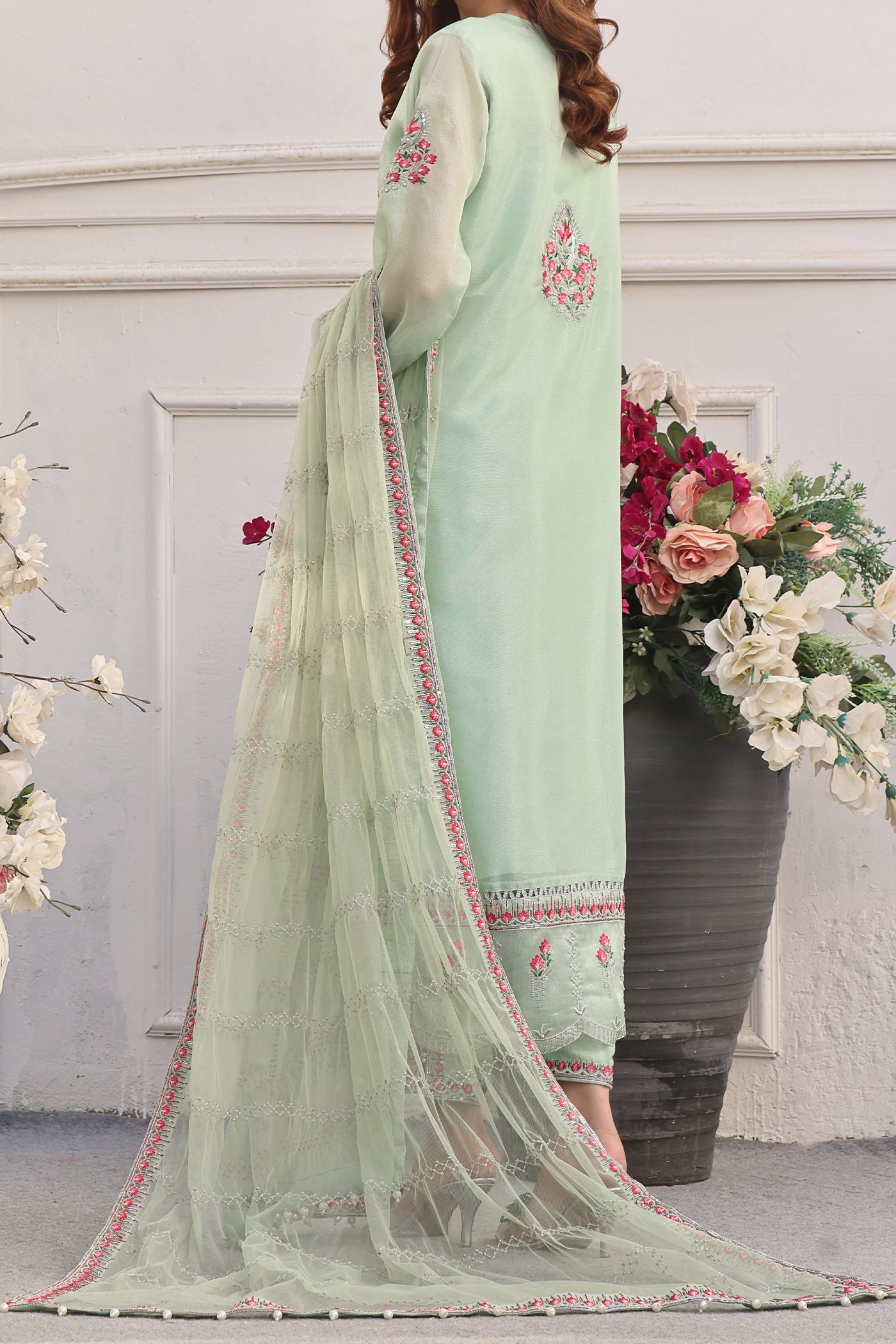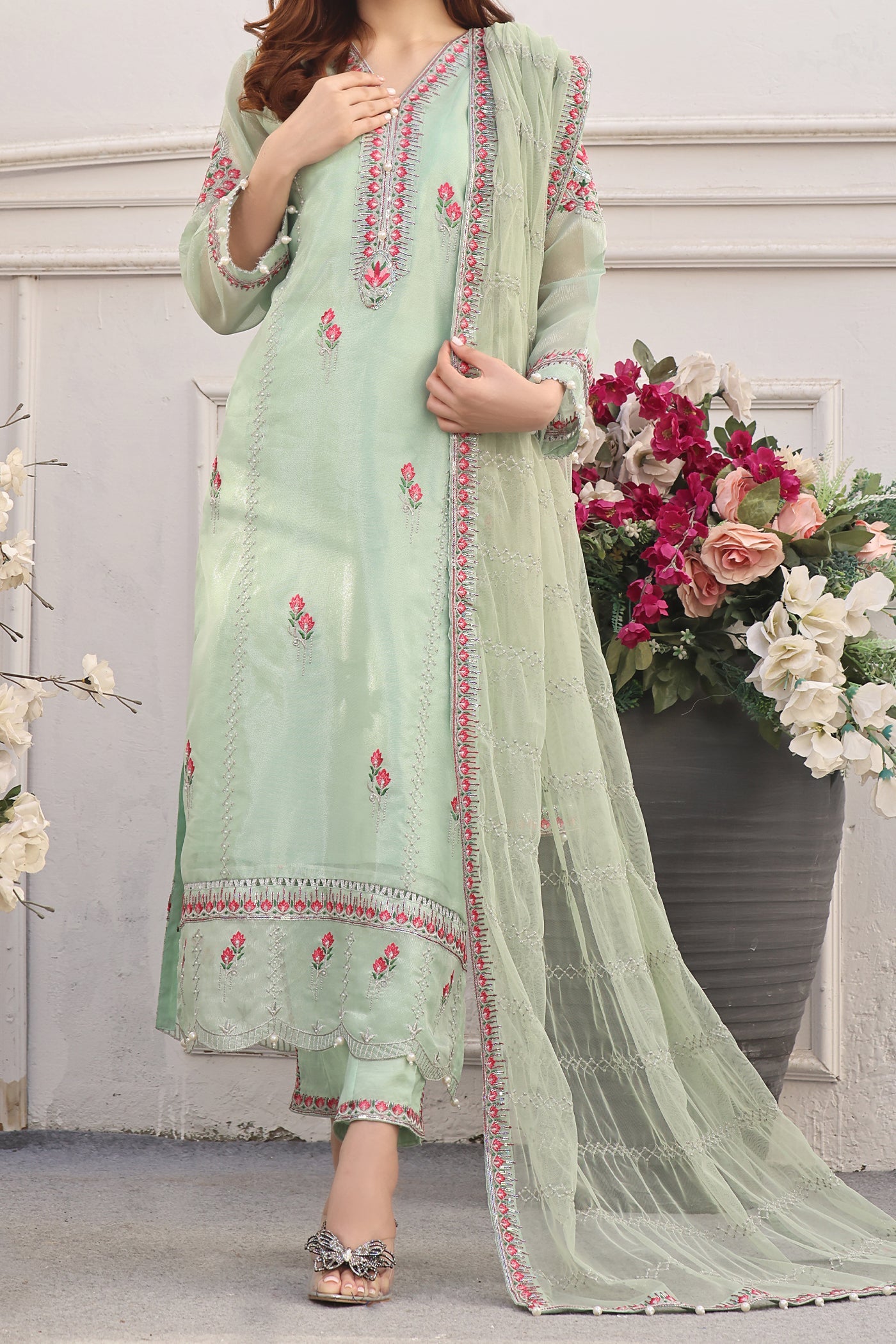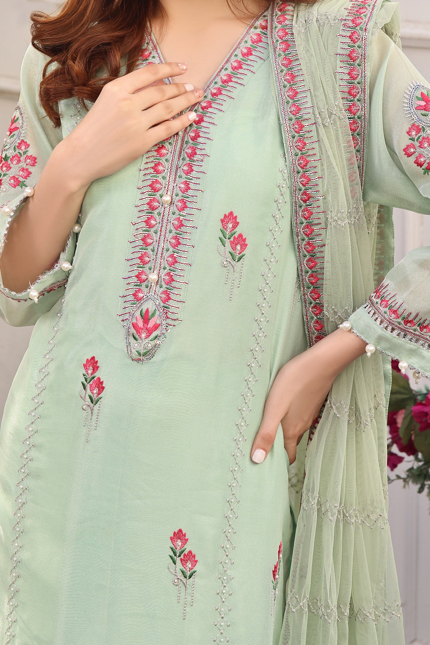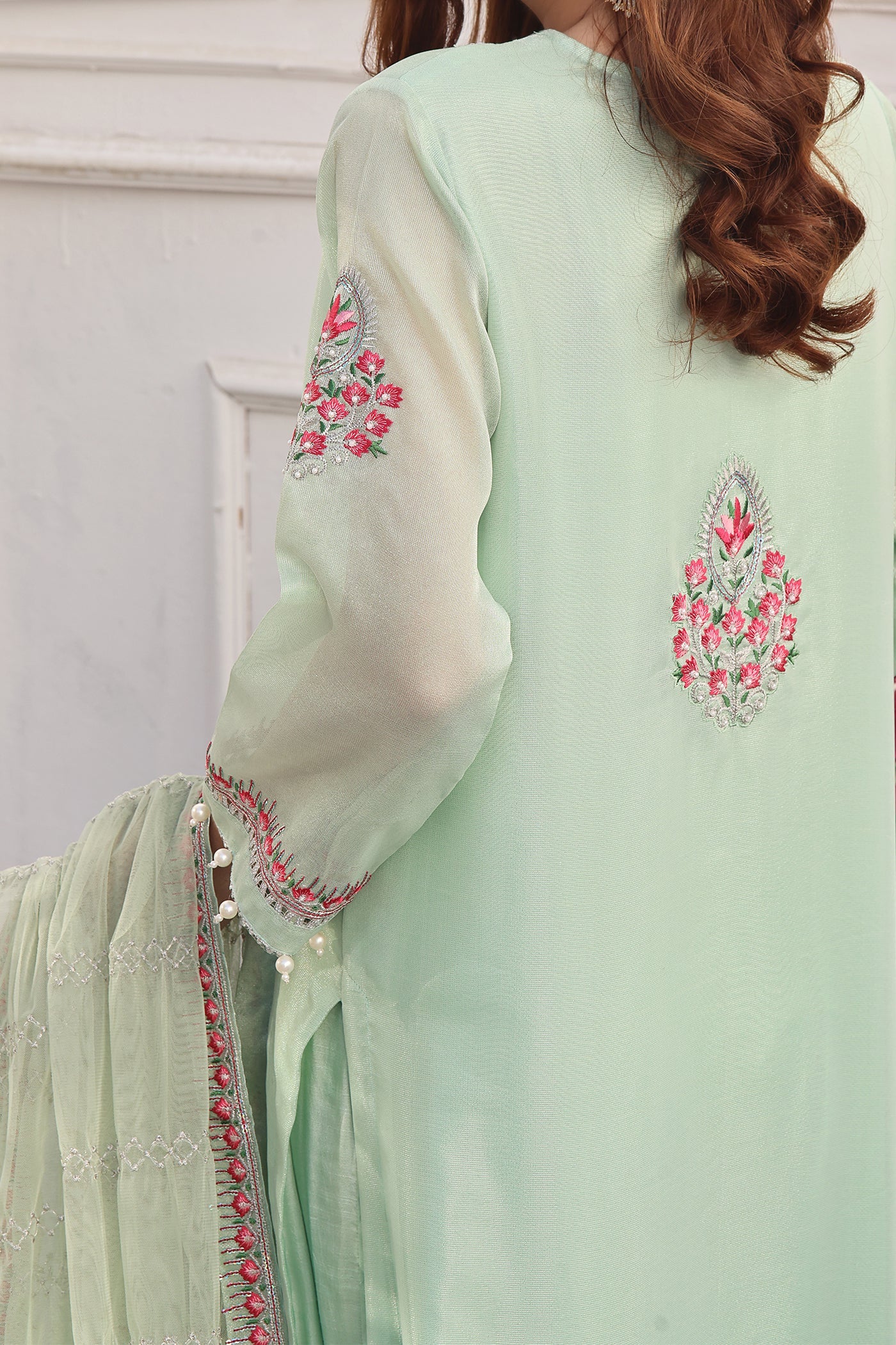 Indulge in understated elegance with this ensemble. Featuring an embroidered neckline and shirt adorned with hand embellishment, this outfit exudes sophistication and charm. The net dupatta adds a touch of shimmer and grace, elevating the design to new heights of elegance. Whether for a formal occasion or a casual gathering, this outfit promises to make a statement with its understated yet captivating allure.