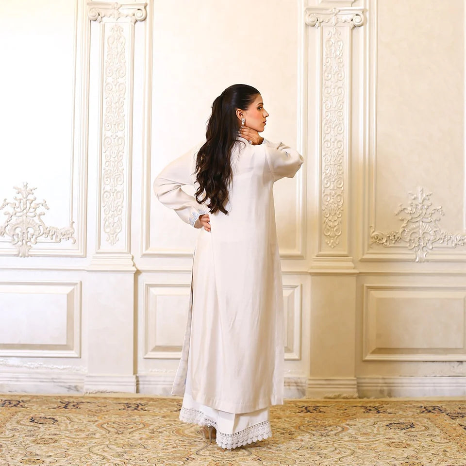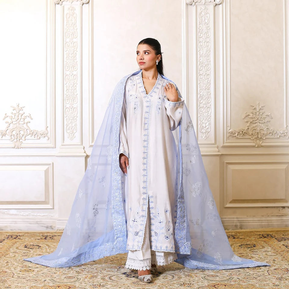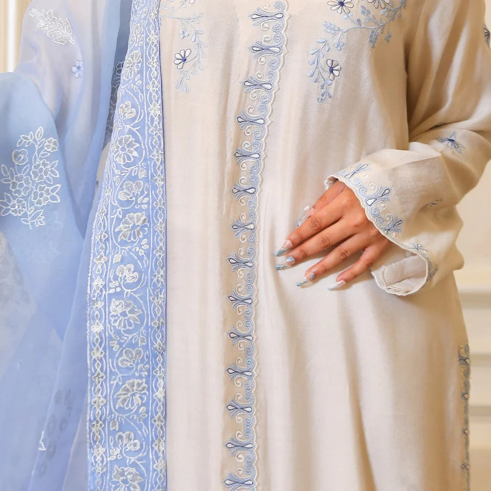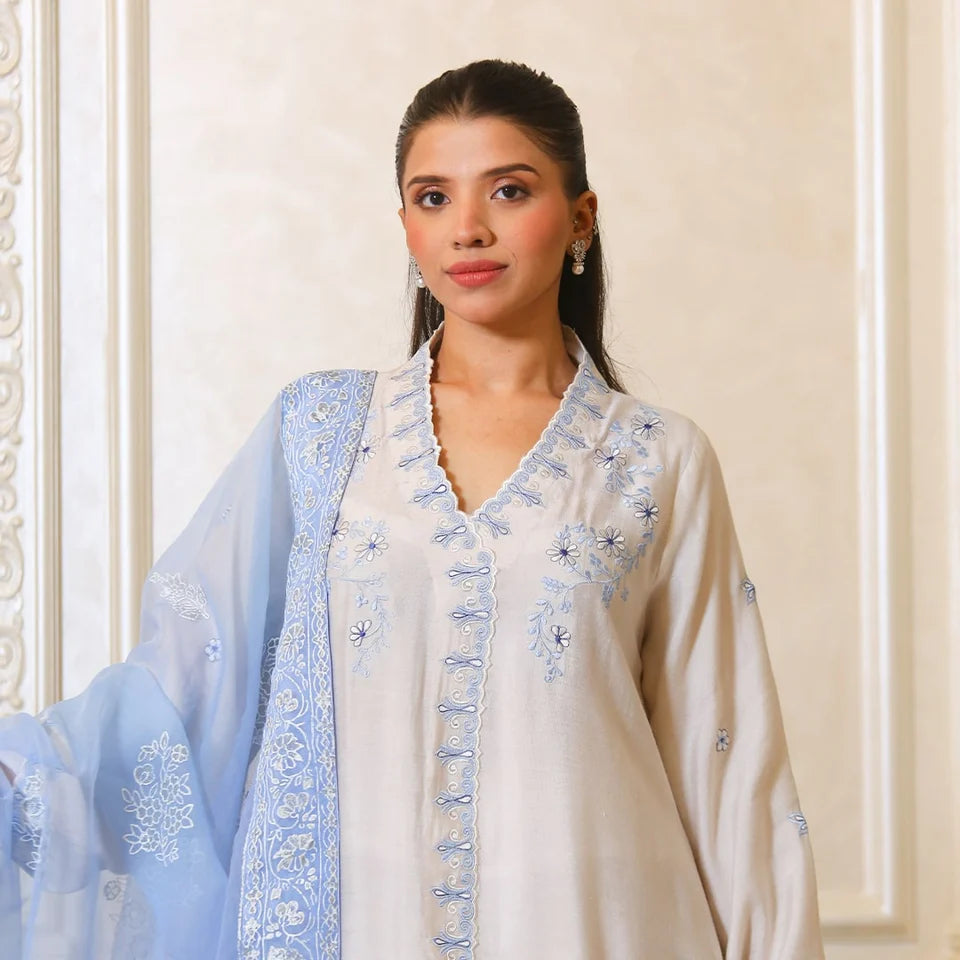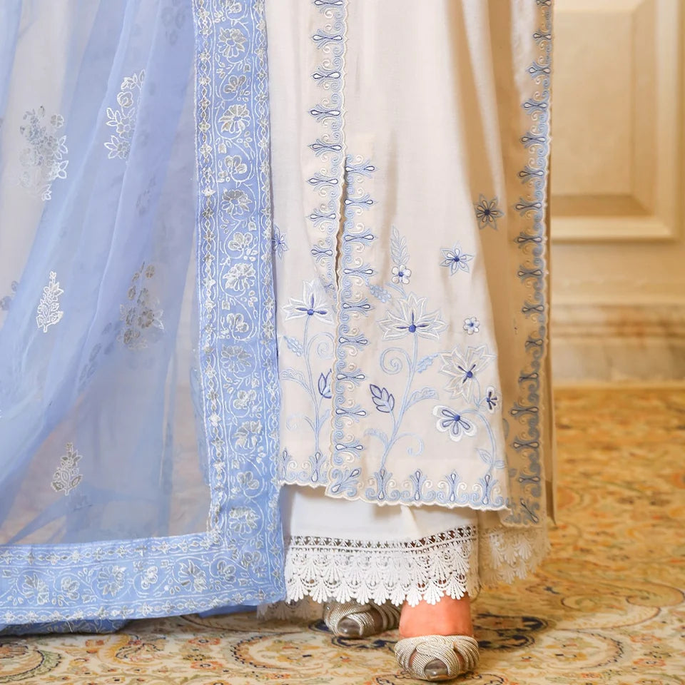An ethereal ivory outfit adorned with delicate ice blue embroidery, crafted from pure cotton net. Paired with a beautifully block-printed ice blue dupatta, it exudes timeless grace and subtle sophistication.