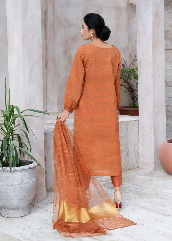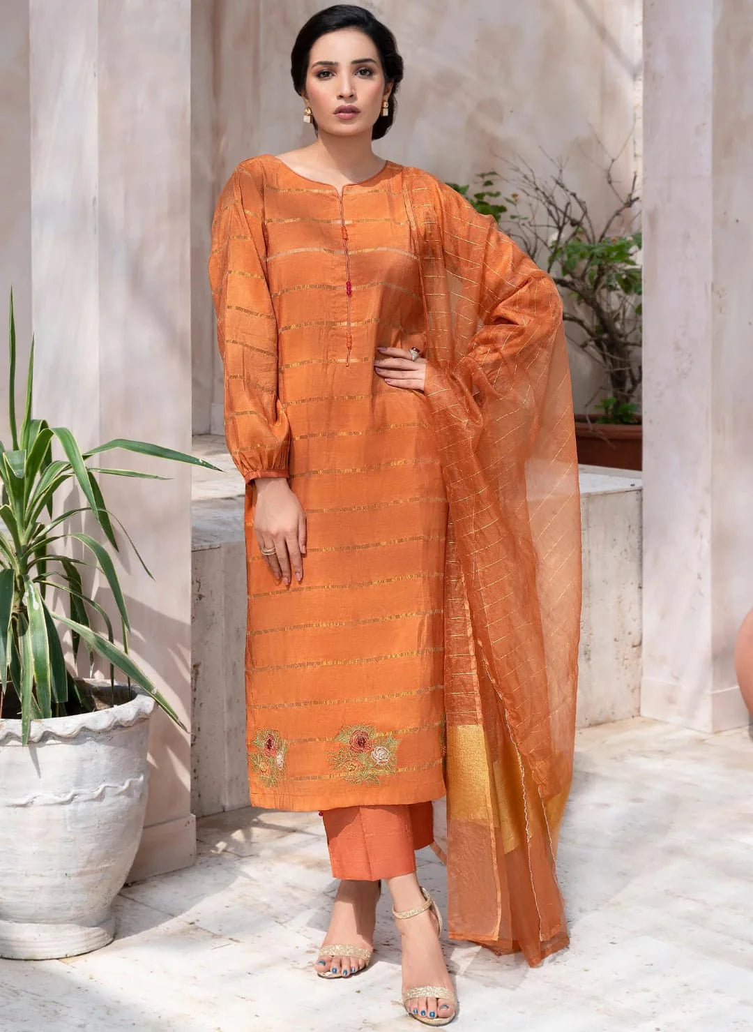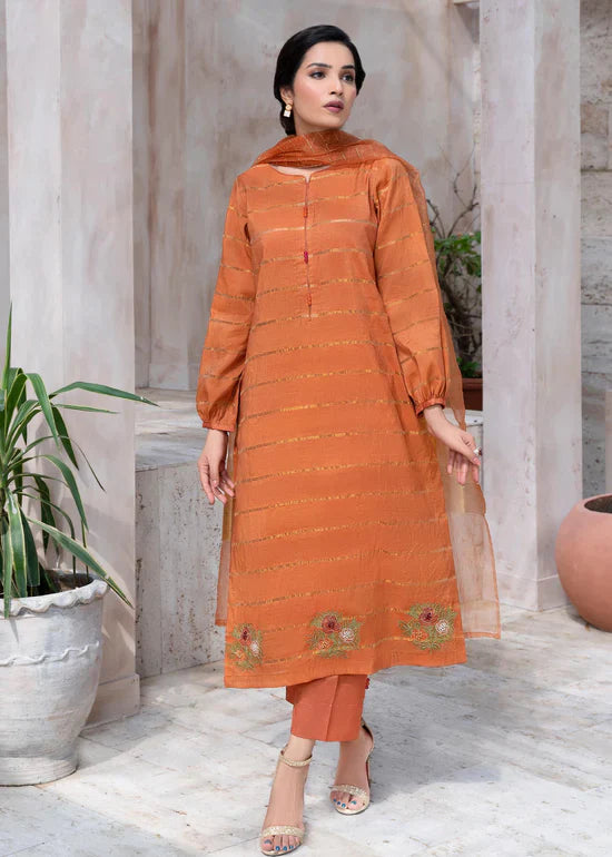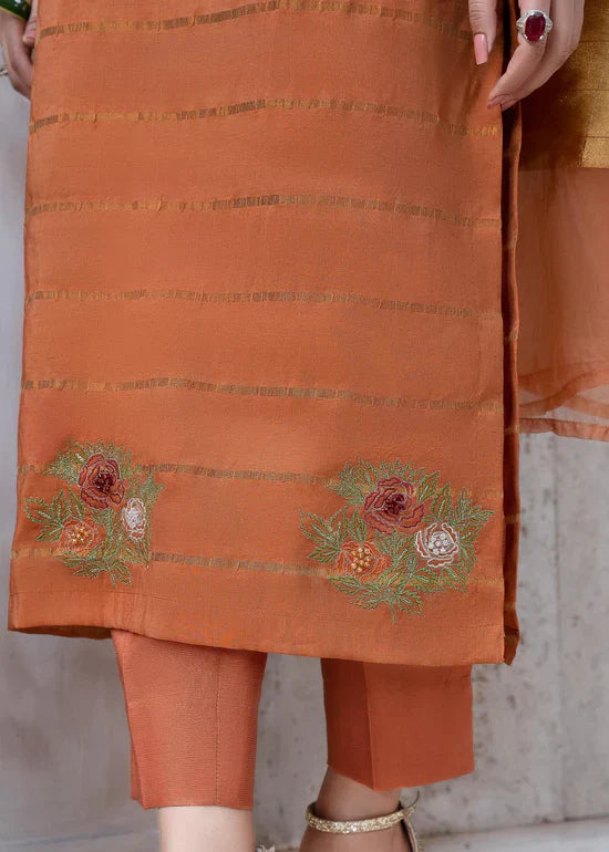 Create lasting memories for your events with this pleasant light rust ensemble crafted on a viscose net, handcrafted embroidered, and hand decorated with glass beads and colorful crystals. Complete this chic look with raw-silk straight pants and an elegant dupatta.