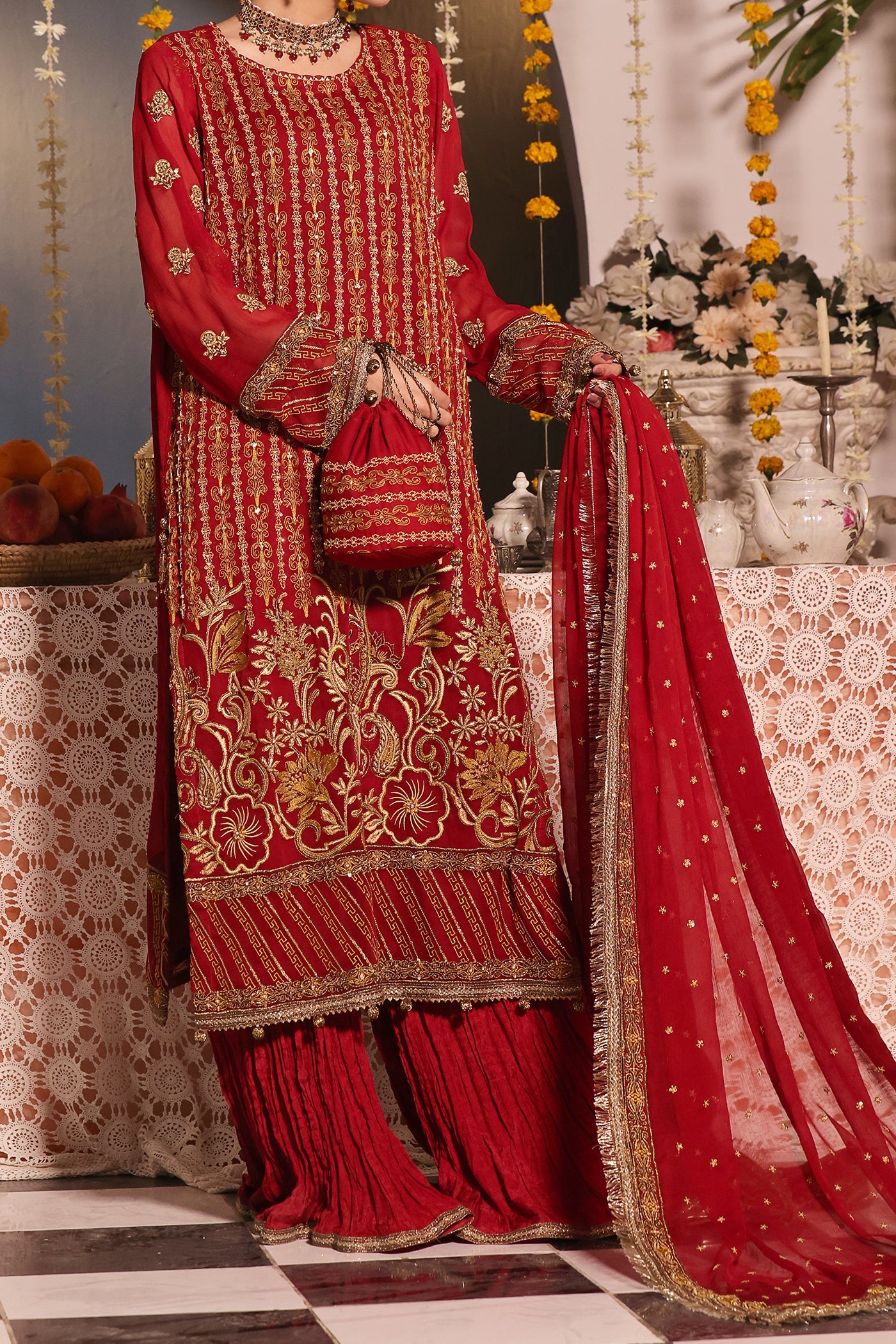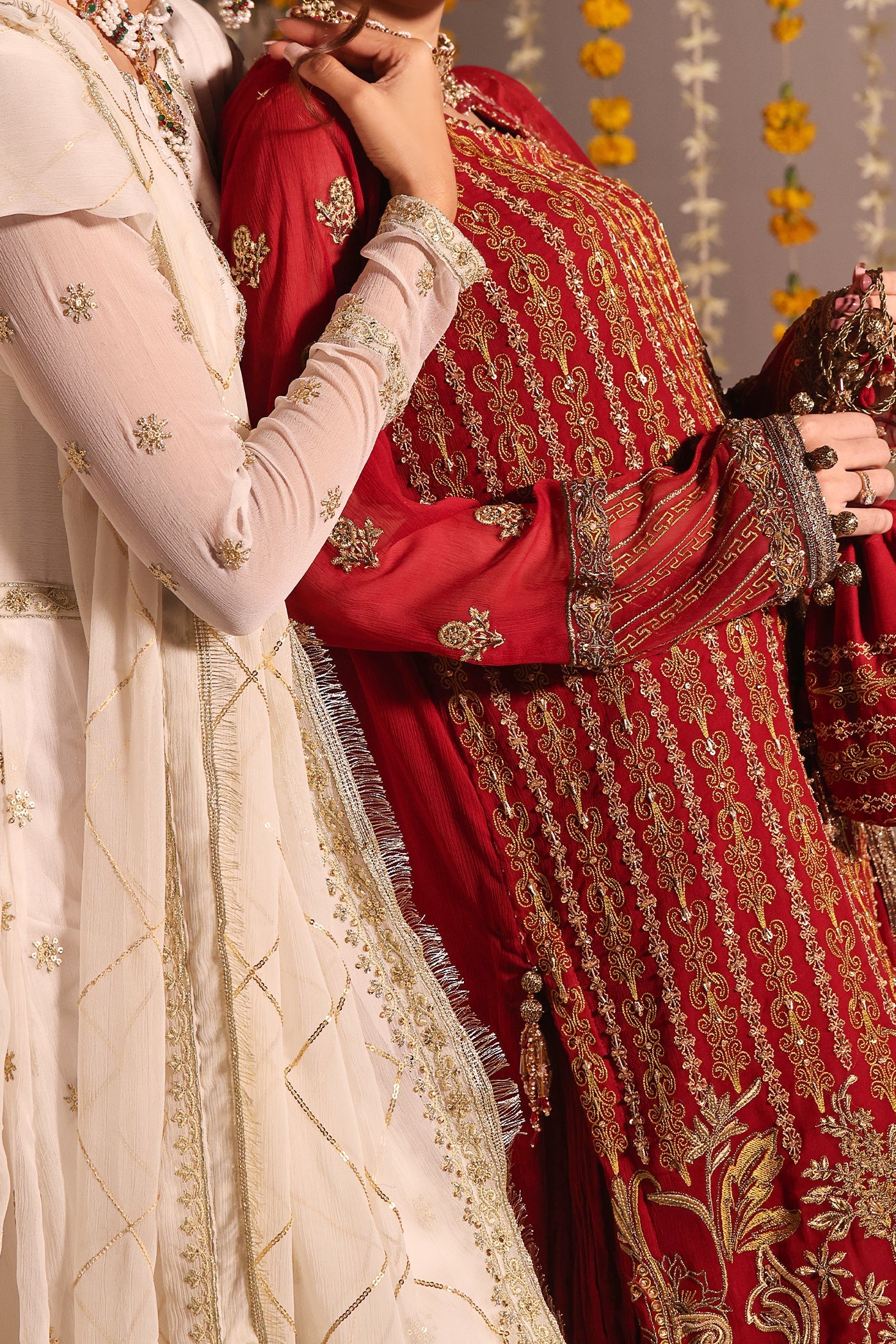 Imagine a symphony of gold hues on red cotton silk where innovation blends seamlessly in a captivating display of cultural richness and artistic expression. The embroidered in heritage are juxtaposed with contemporary motifs on the border, creating a mesmerizing contrast, like patterns shifting in the light. The red chiffon dupatta adorned with kiran, lace, and embroidery on borders adds depth to the allure.