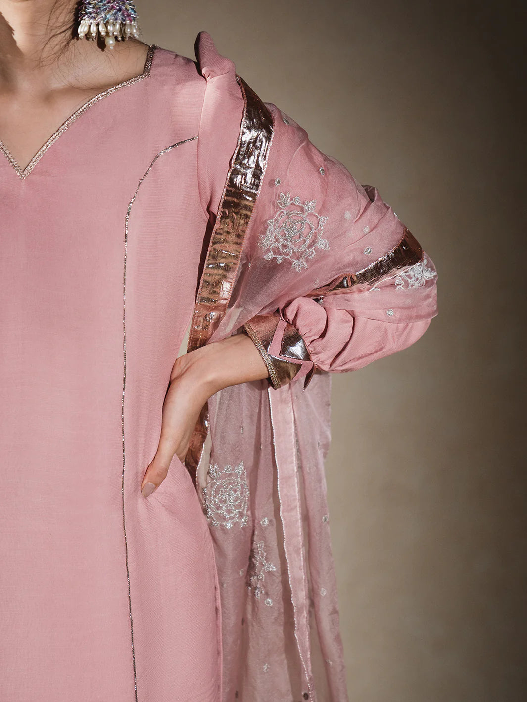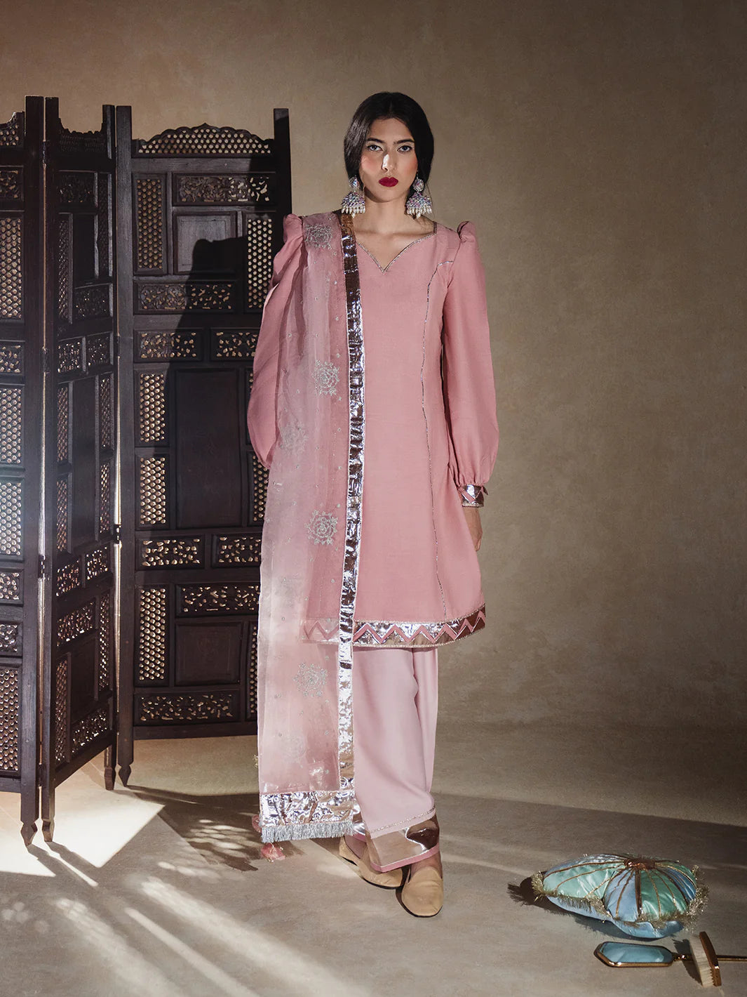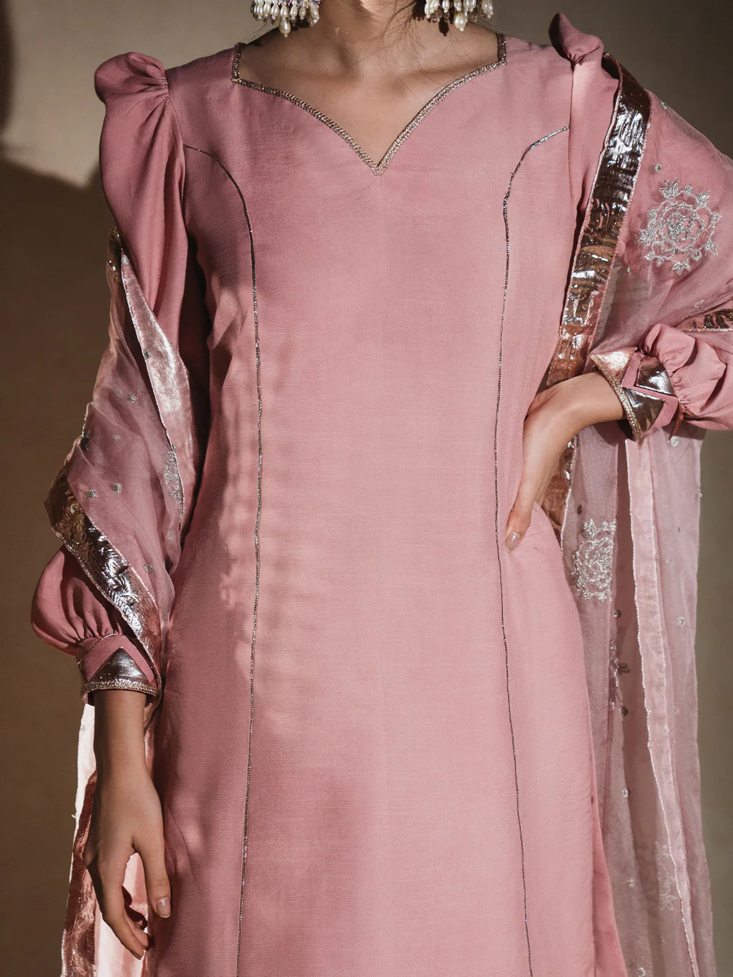 Sadabahar Gulabi raw silk kameez with softly puffed (chunnat numa) sleeves, enhanced by a romantic sweetheart (dil wala) neckline, and finished elegantly with a trikoni panni border. Paired with a gracefully flared shalwar edged in rose-gold panni lappa, and complemented by an airy sadabahar gulabi organza dupatta embellished with shimmering tillaydar chann, silver guldasta motifs, and framed by jhil mil lappa—subtle, warm, and full of heirloom charm.