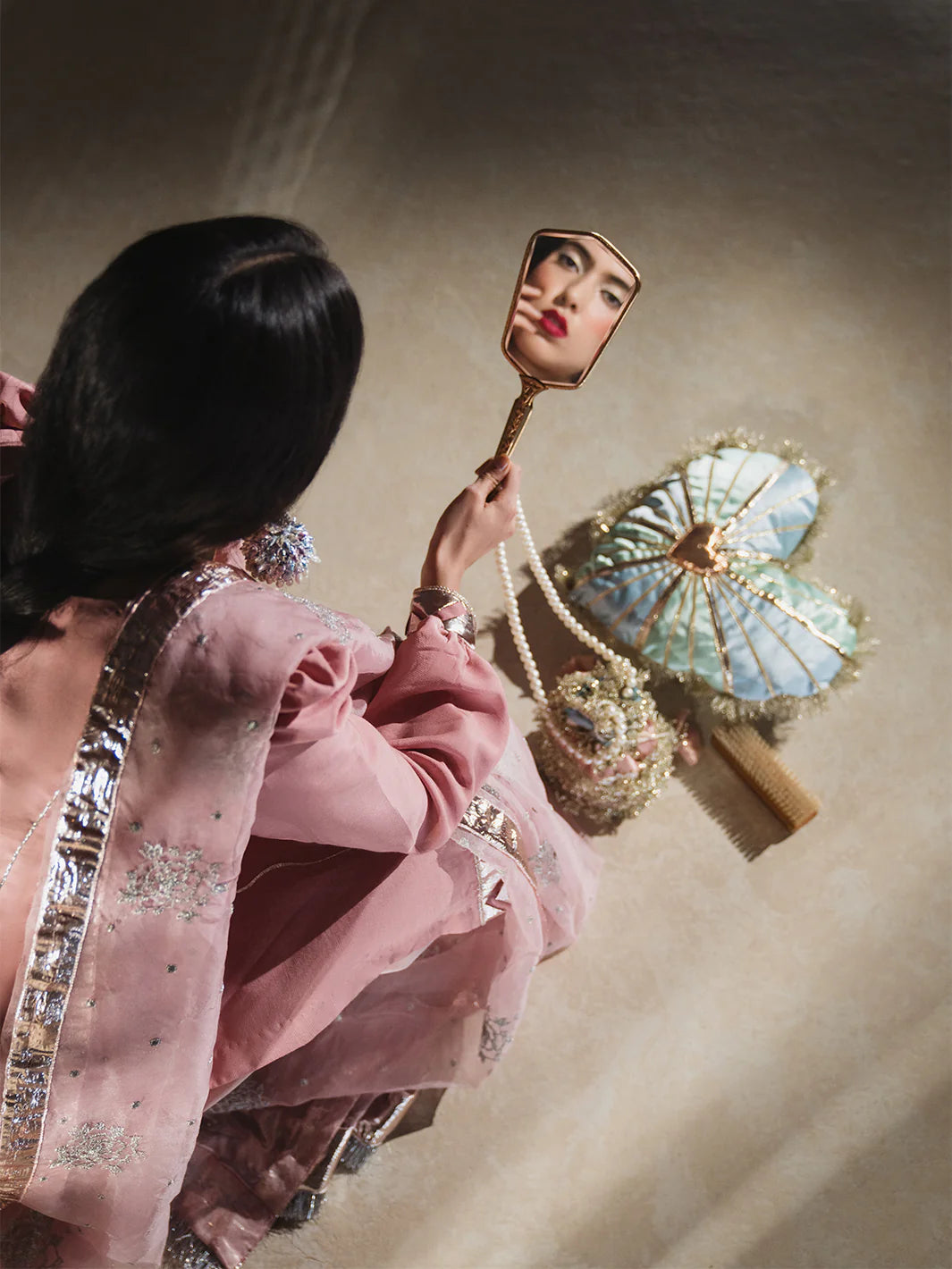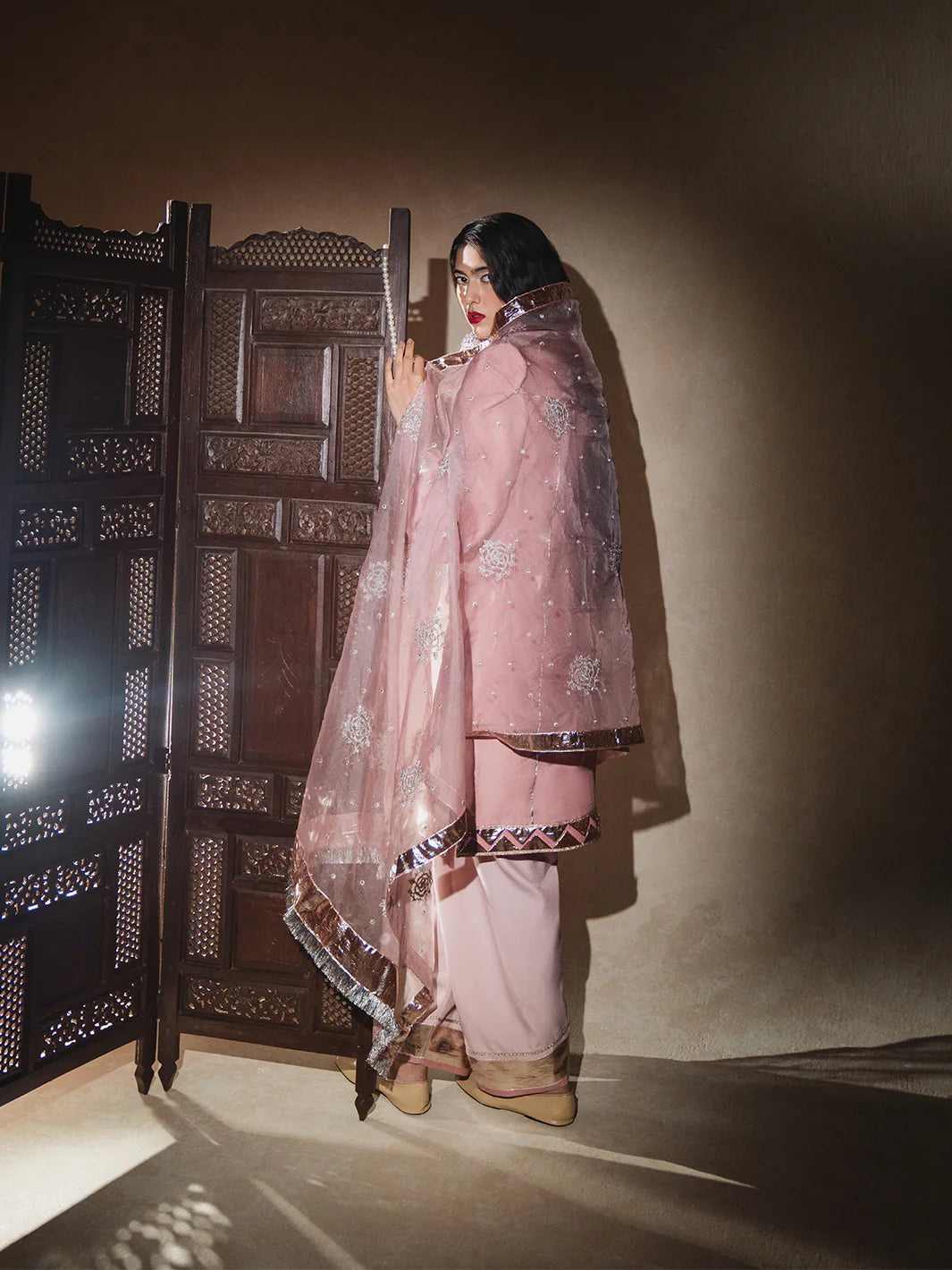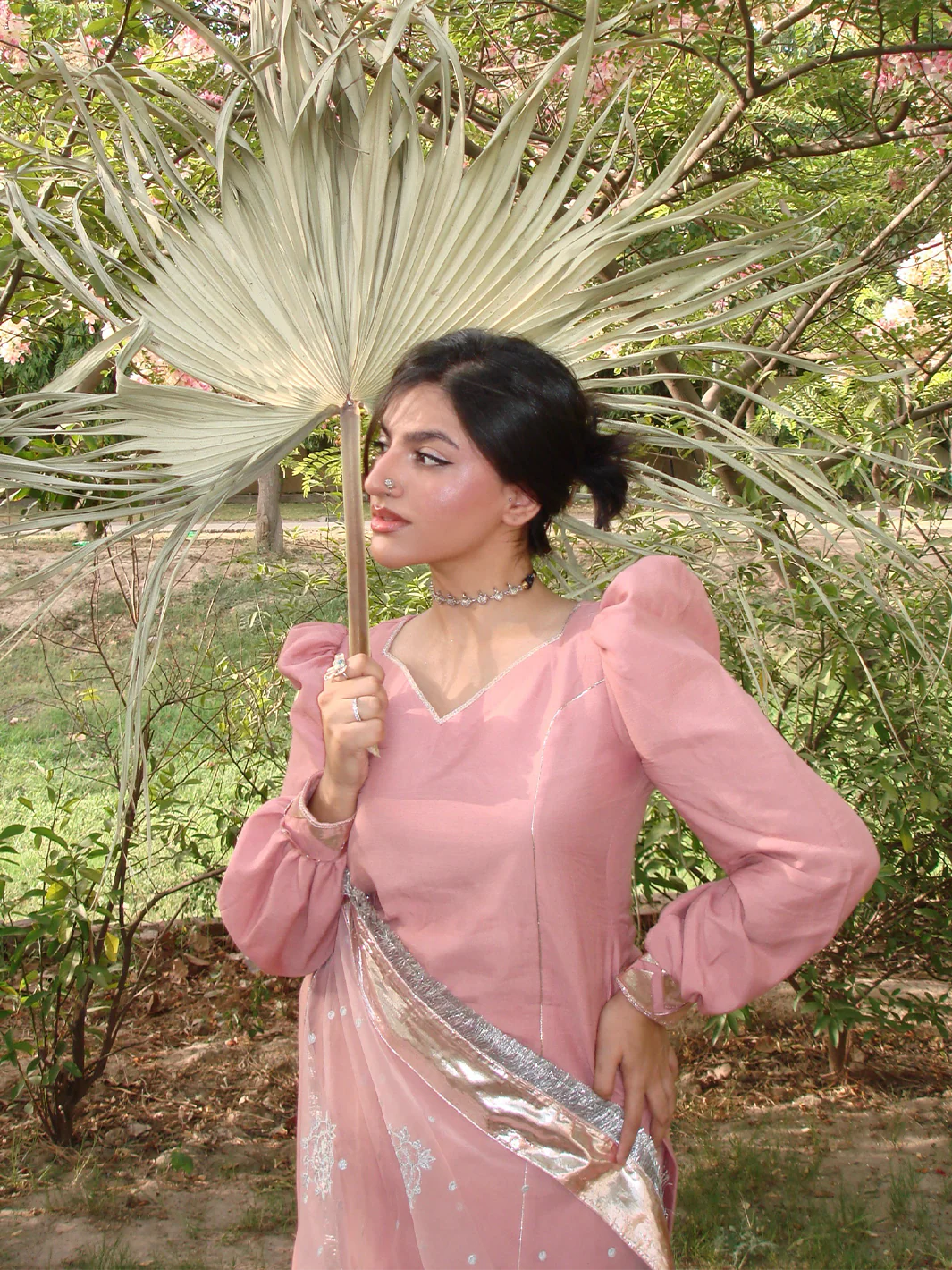 Sadabahar Gulabi raw silk kameez with softly puffed (chunnat numa) sleeves, enhanced by a romantic sweetheart (dil wala) neckline, and finished elegantly with a trikoni panni border. Paired with a gracefully flared shalwar edged in rose-gold panni lappa, and complemented by an airy sadabahar gulabi organza dupatta embellished with shimmering tillaydar chann, silver guldasta motifs, and framed by jhil mil lappa—subtle, warm, and full of heirloom charm.