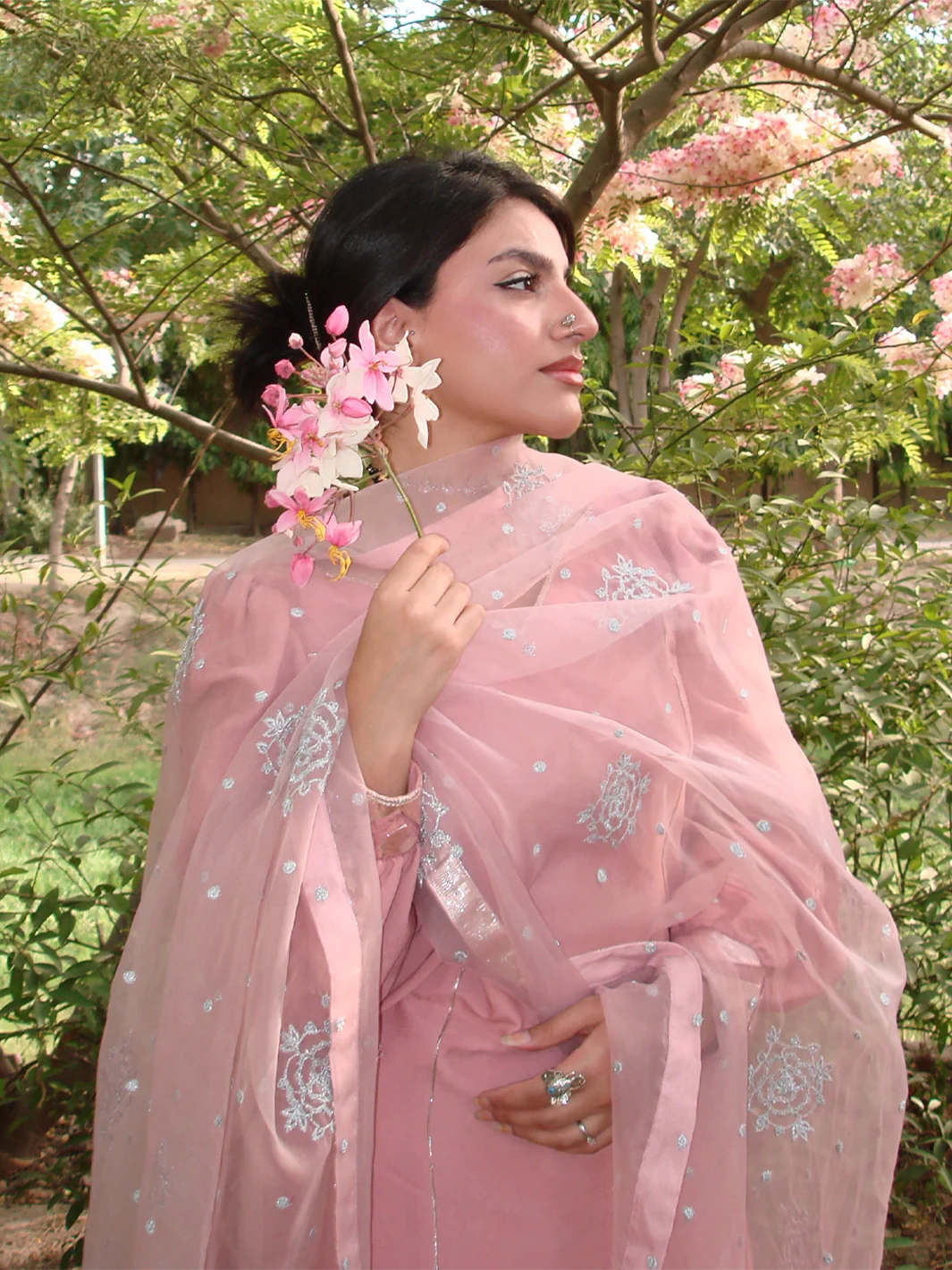 A sheer sadabahar gulabi organza dupatta adorned with carefully scattered tillaydar chann and guldasta motifs. Framed gracefully with a shimmering panni lappa border and chamkeeli kiran, capturing the essence of timeless celebration.