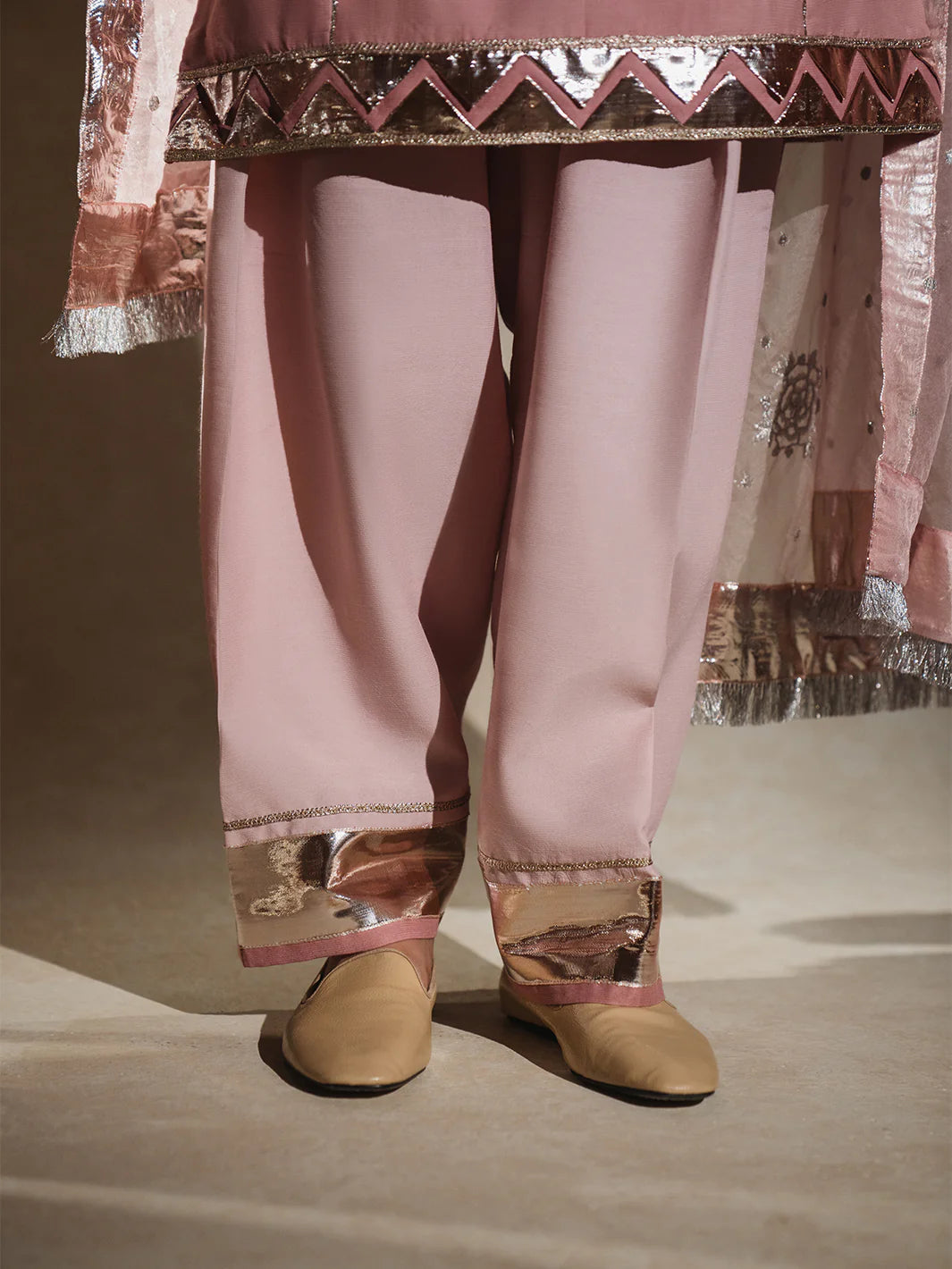 A wide ghayray wali raw silk shalwar tailored for comfortable elegance, detailed with khulay pauncha finished neatly by rose-gold panni lappa for a refined, festive touch.