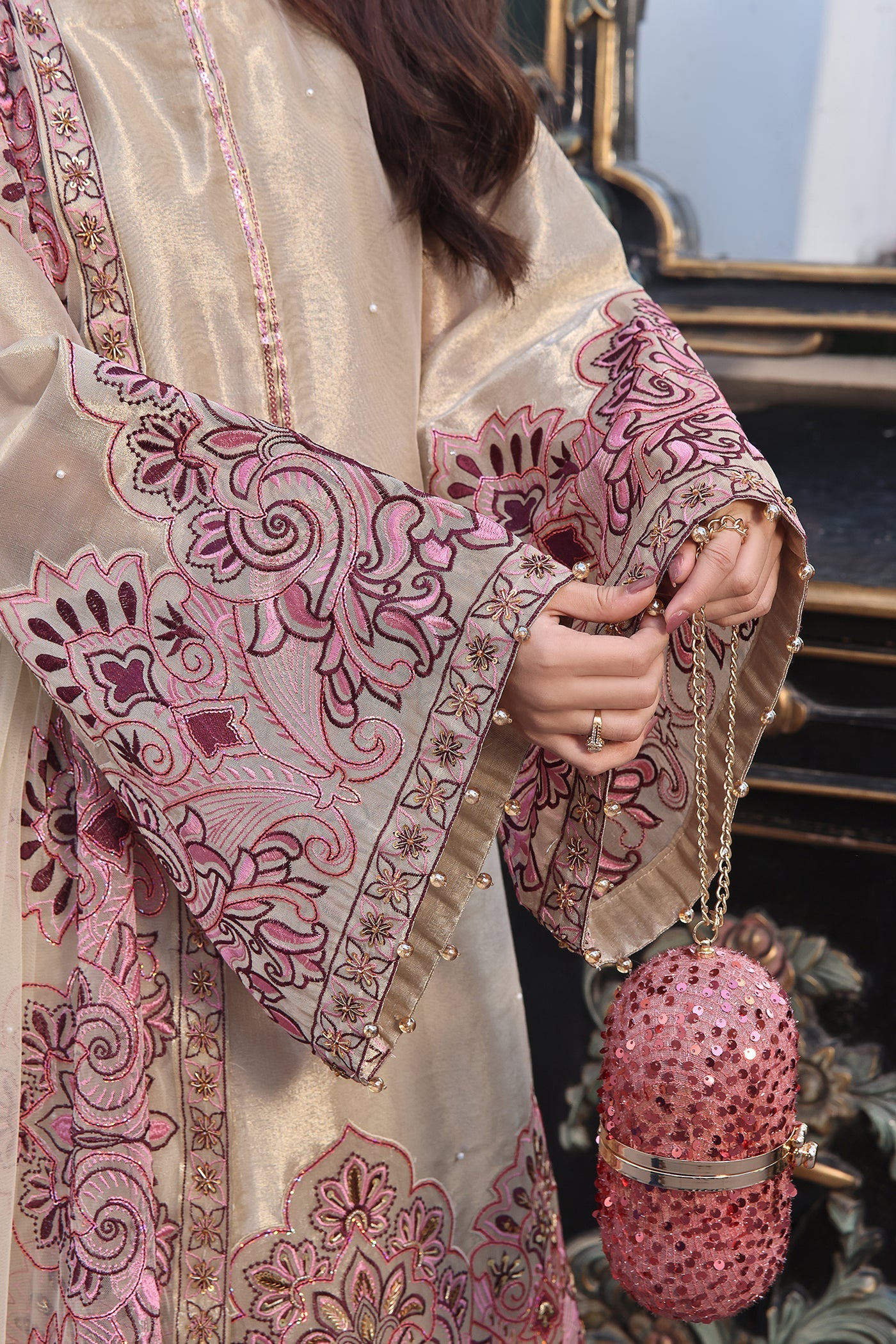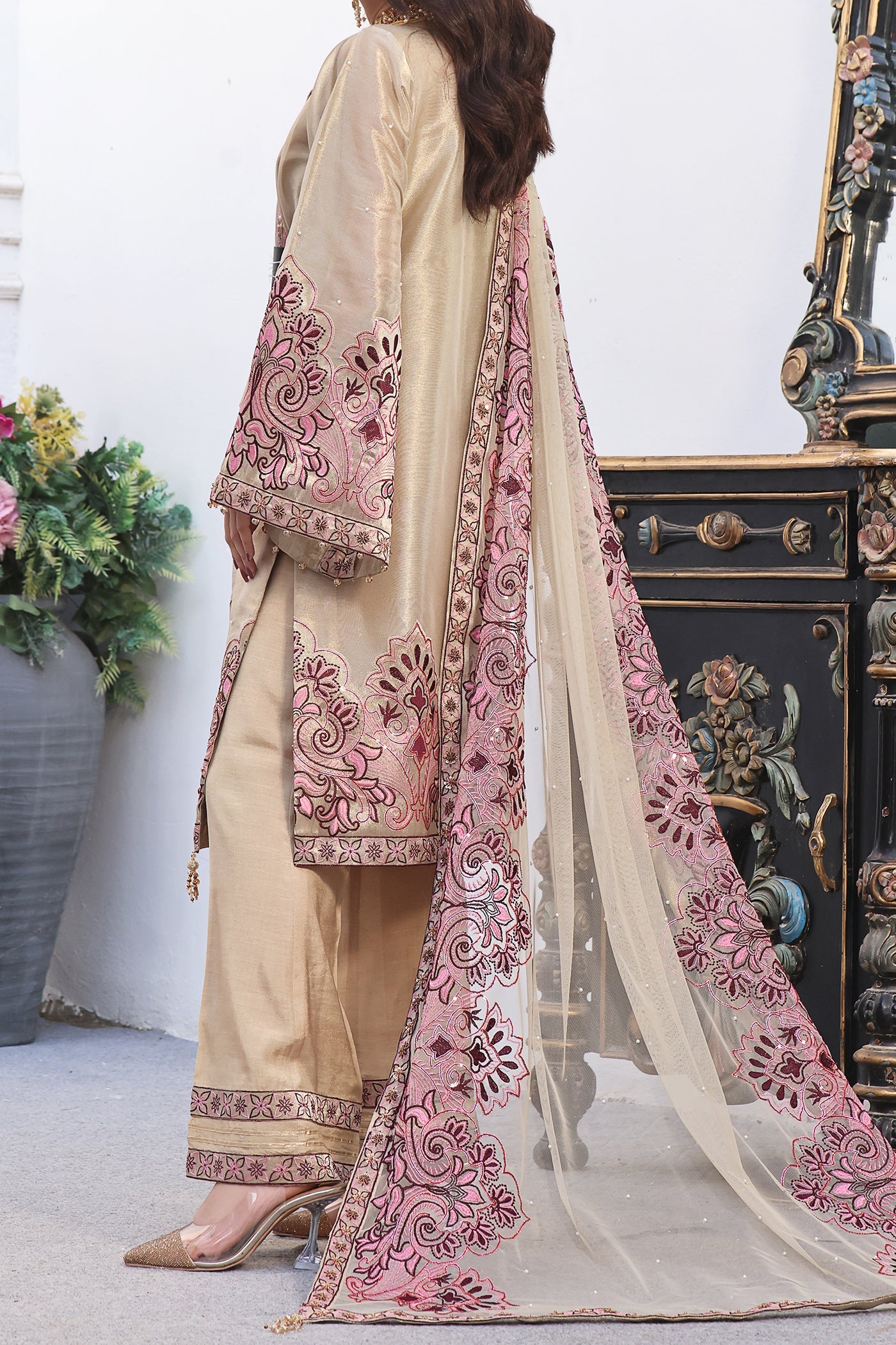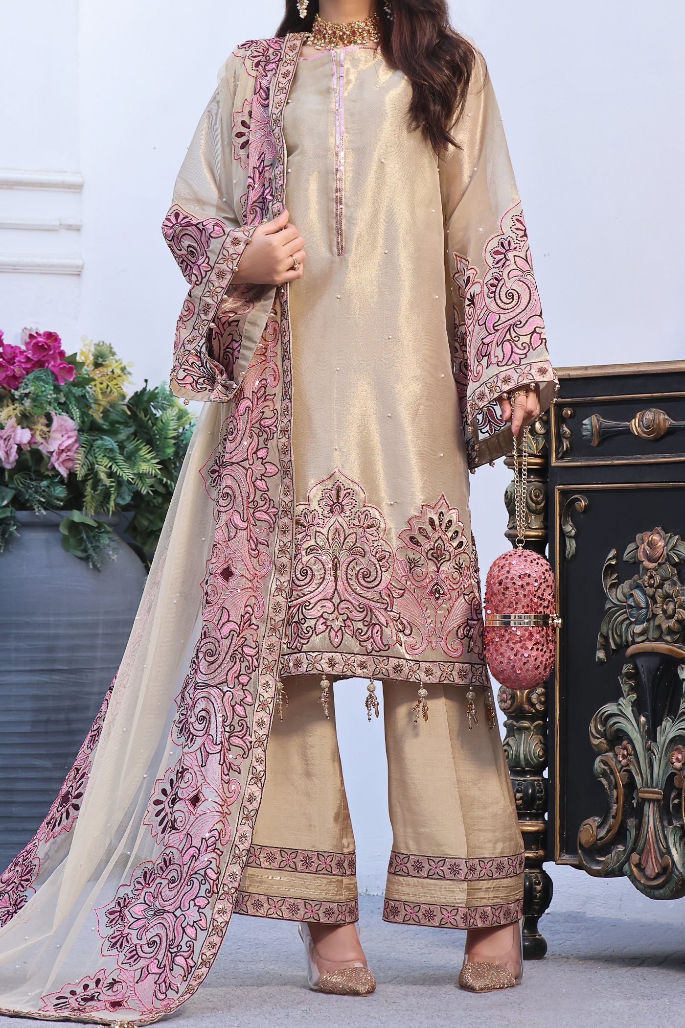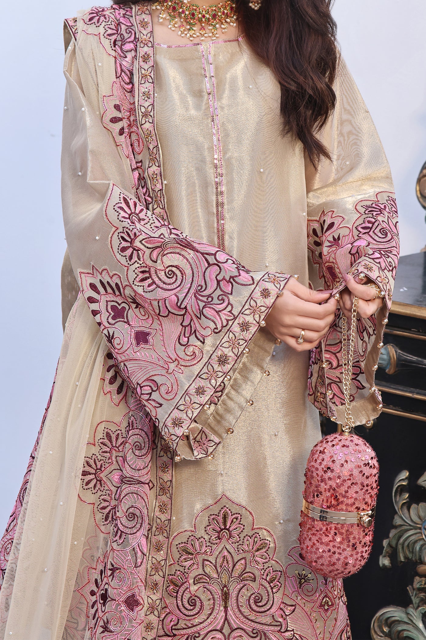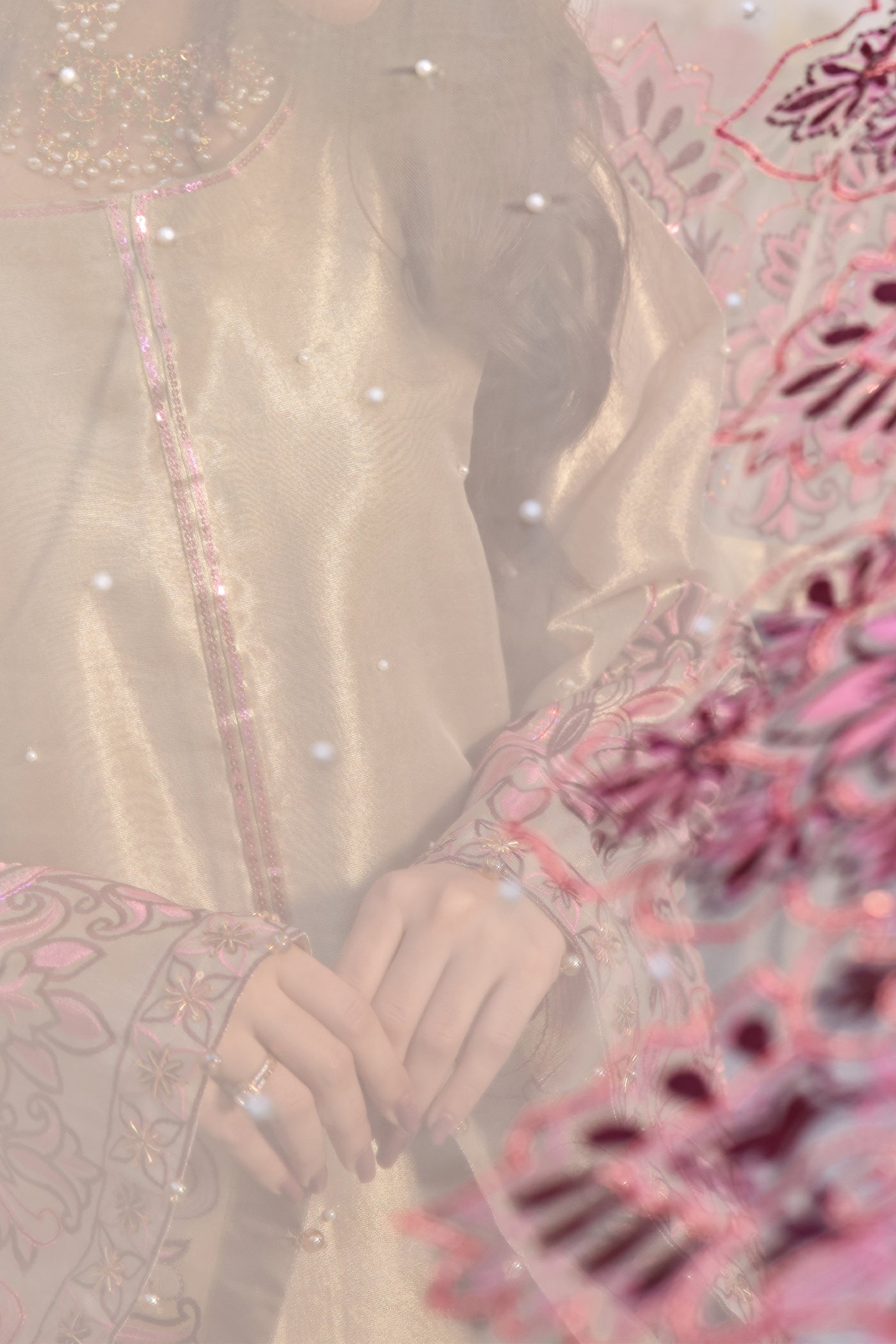 Creating a symphony of timeless beauty and redefined elegance with our three-piece embroidered messuri suit, unveiling a graceful floral embroidered canvas adorned with pearls, dabka, and tassels on the hem. This masterpiece is elevated with dyed wide-leg trousers and a dupatta, detailed with embroidered borders to instantly steal the spotlight!