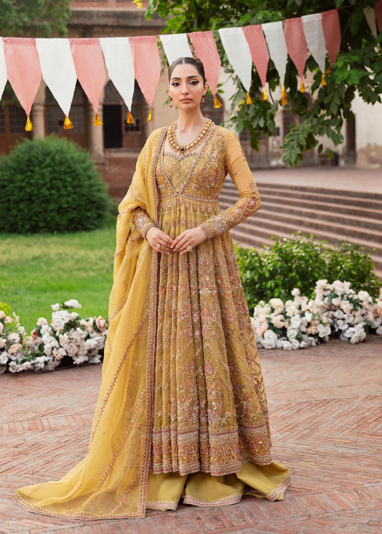 Capture the essence of timeless beauty with this radiant bridal gown by Akbar Aslam. Featuring a delicate sweetheart neckline, this gown beautifully frames the décolletage, adding a touch of romantic charm to its overall design. Intricate embroidery flows gracefully across the bodice and cascades down the full skirt, creating a harmonious blend of elegance and tradition. The fitted bodice and full sleeves offer a flattering silhouette, while the accompanying dupatta drapes effortlessly to complete the look. Perfect for the bride who seeks to exude regal charm, this ensemble is a stunning balance of classic sophistication and modern allure.