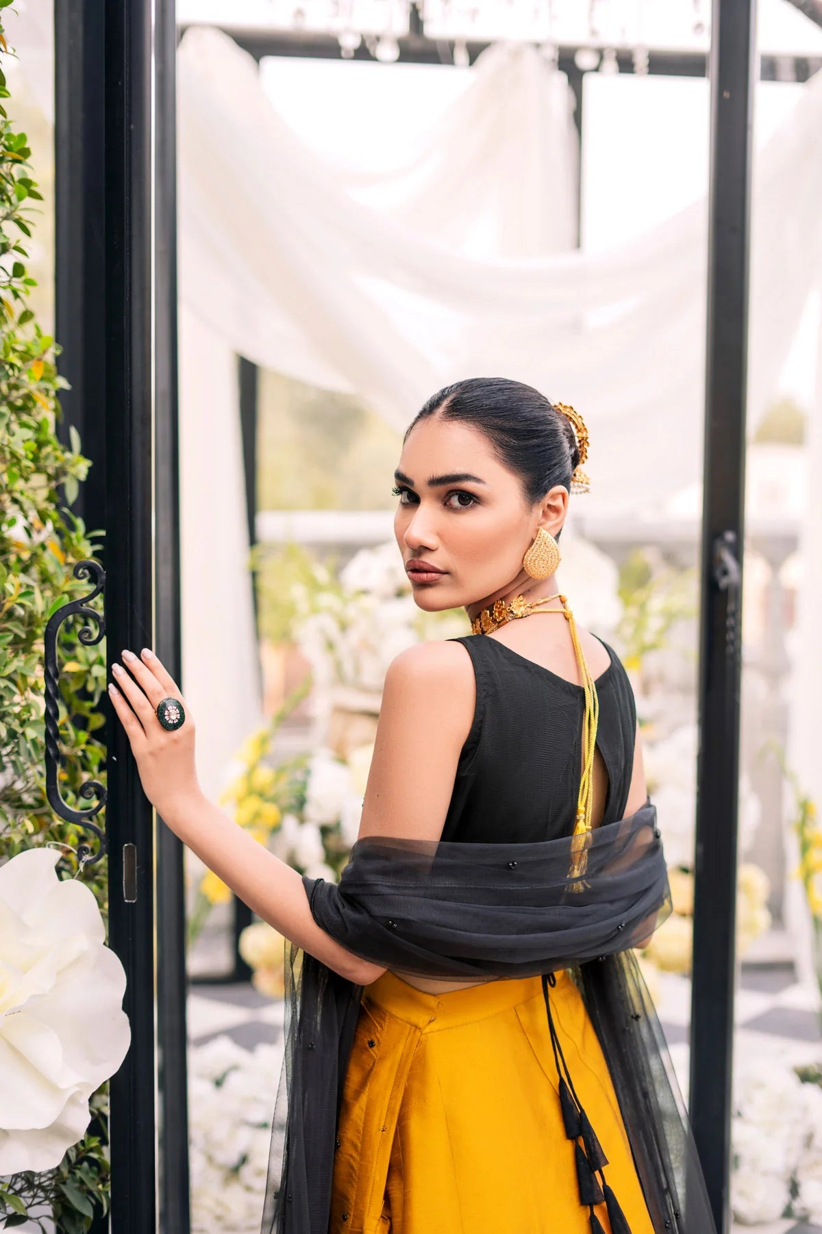 This raw silk lehnga is a pristine classy piece covered in beads chatta work. The mustard golden bottom exhibits urbanity with a traditional touch. The black short choli is hand embroidered on net with a teardrop back. The net dupatta with bead chatta follows the enchanting top and bottom. The whole outfit manifests a bewitching night ball look and is bound to cast a spell of your personality to whoever you meet.