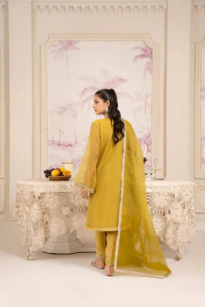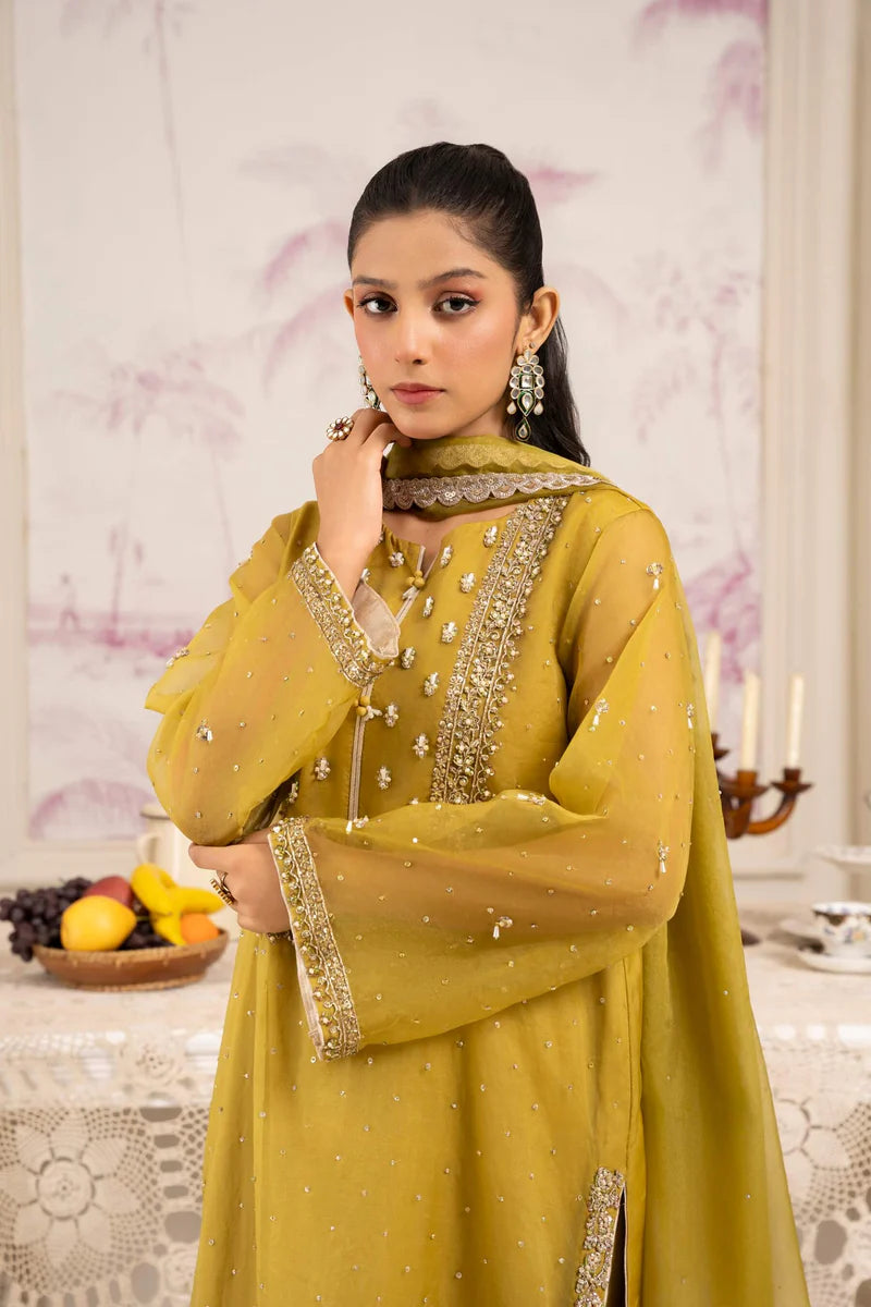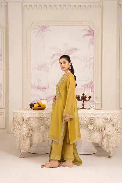 A Masterpiece Of Understated Luxury, This Olive-Gold Hand-Embellished Raw Silk Shirt Is A Piece Of Art. Adorned With Delicate Dabka, Sequins, And Resham Detailing, It Radiates Subtle Shimmer While Maintaining Effortless Poise. The Finely Crafted Sleeves And Borders Elevate The Design With Refined Craftsmanship And Traditional Charm. Paired With A Hand-Embellished Organza Dupatta, Featuring Intricate Borders And Soft Drape, This Ensemble Exudes Festive Grandeur. The Dyed Pants Provide A Seamless Finish, Completing The Look With Elegance And Harmony. Ideal For Festive Gatherings, This Outfit Blends Grace, Texture, And Heritage Craftsmanship In Every Detail.