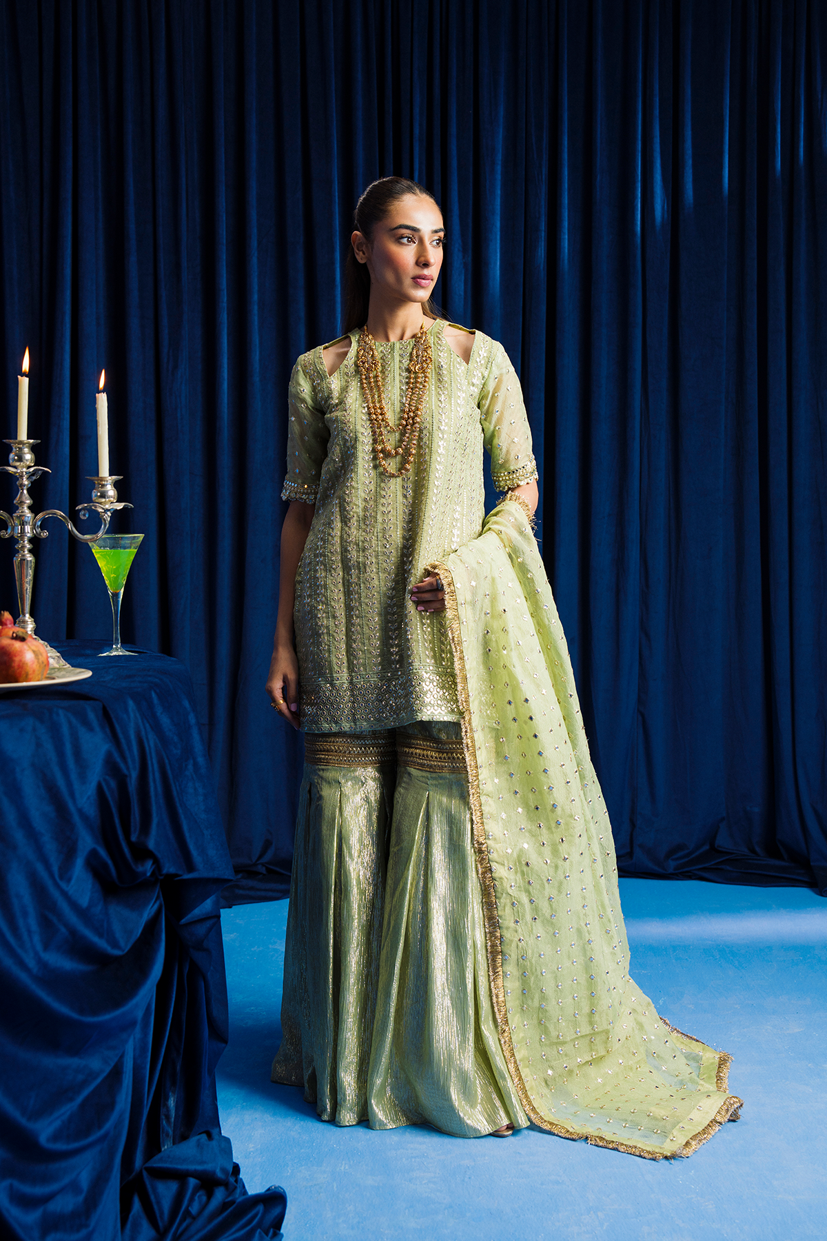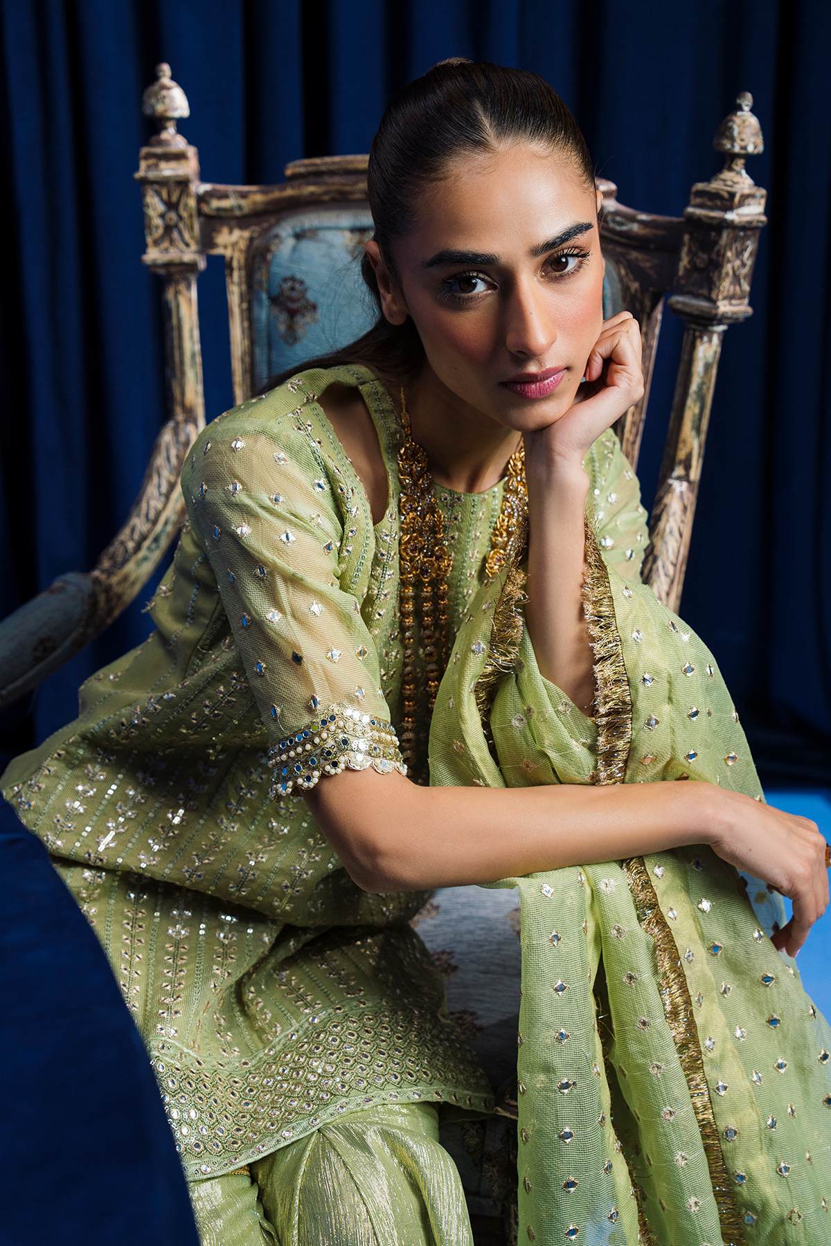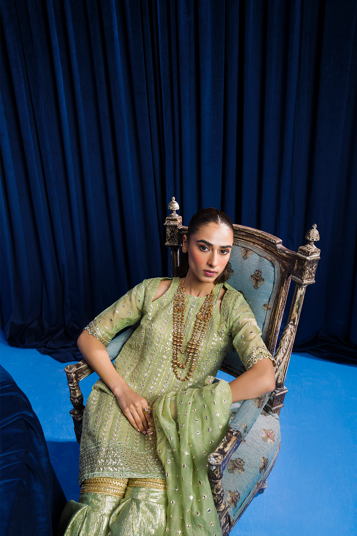 A green gharara set with intricate silver work and a golden border exudes sophistication, complemented by a matching dupatta featuring shimmering silver motifs and golden edges, striking a perfect blend of tradition and modernity.