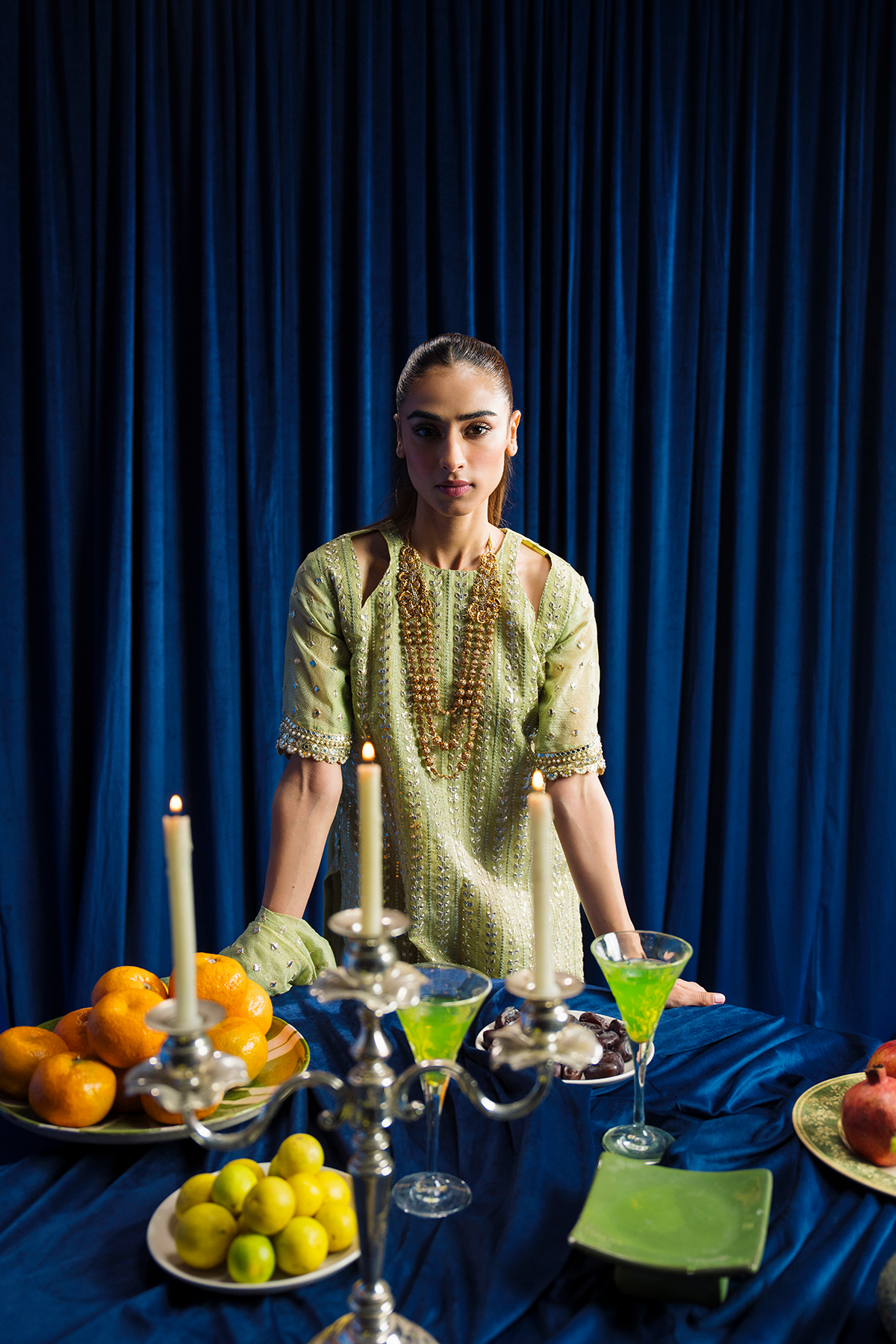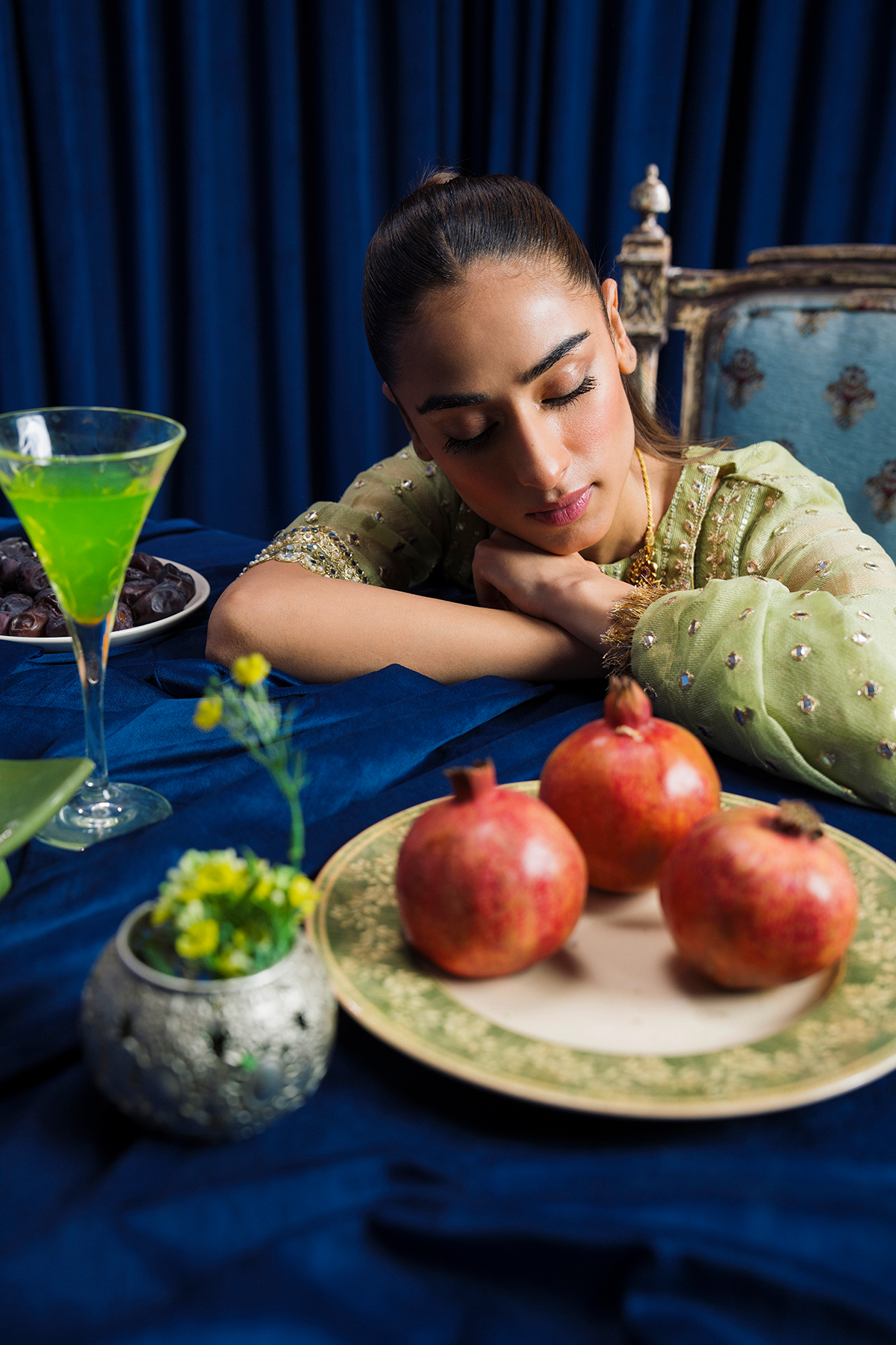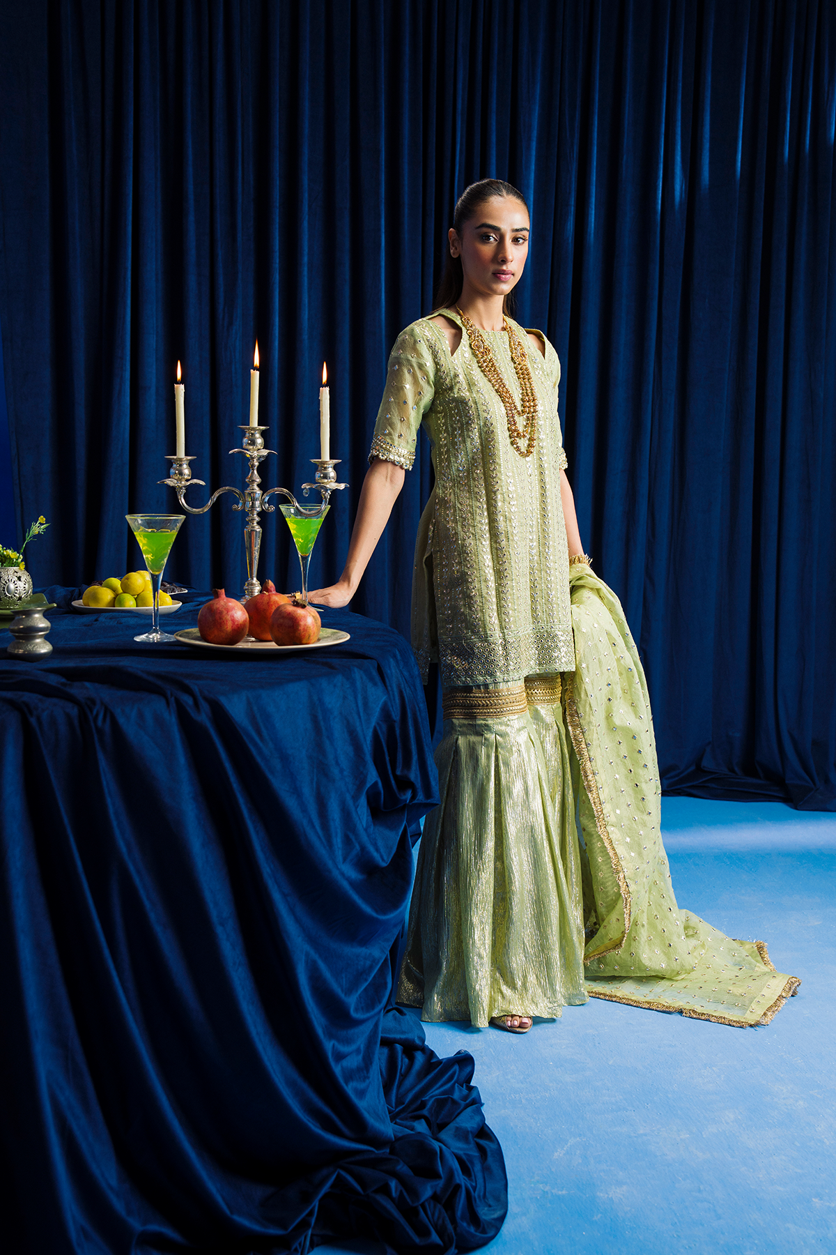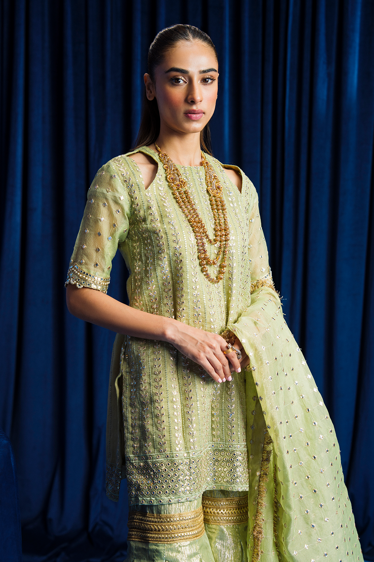 A green gharara set with intricate silver work and a golden border exudes sophistication, complemented by a matching dupatta featuring shimmering silver motifs and golden edges, striking a perfect blend of tradition and modernity.