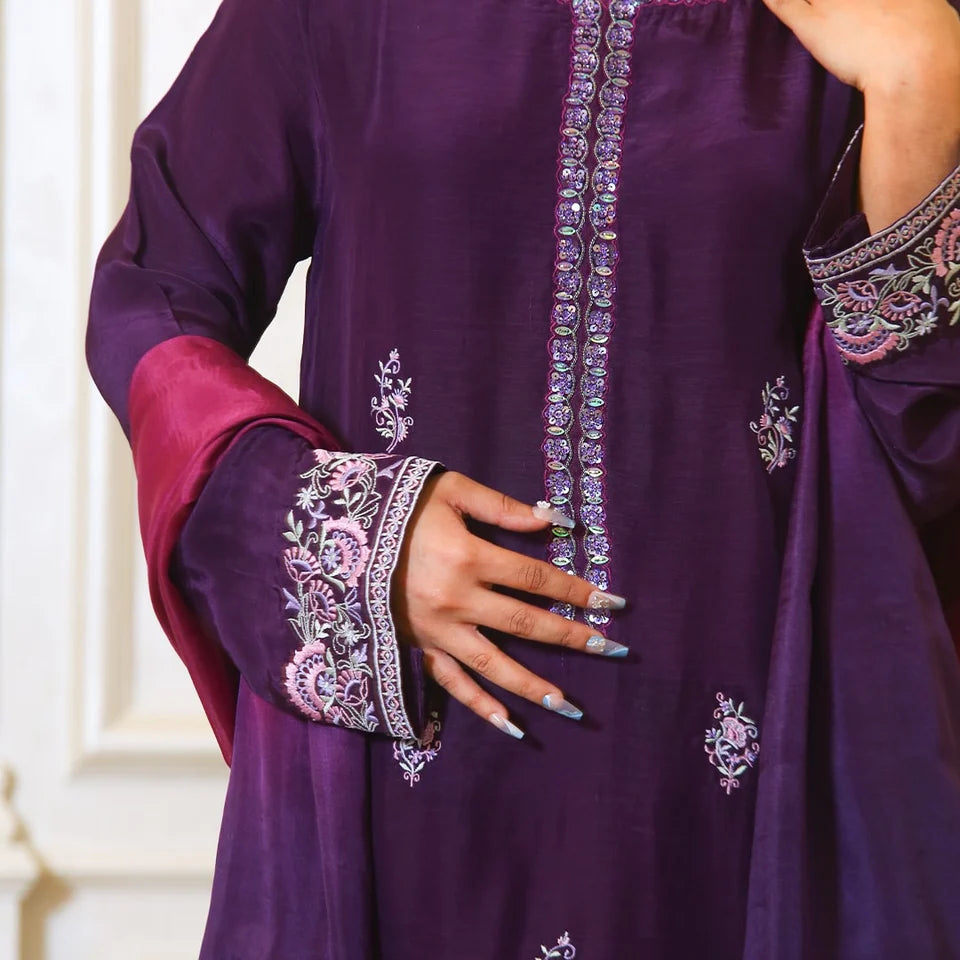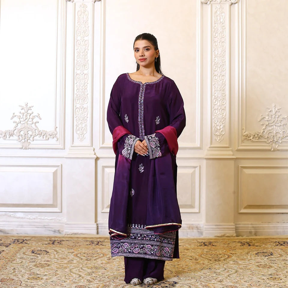 A dark purple silk outfit featuring a long, embellished neckline with intricate embroidery and motifs all over the fabric and daman. Paired with a luxurious dip dyed silk dupatta for a regal finish.