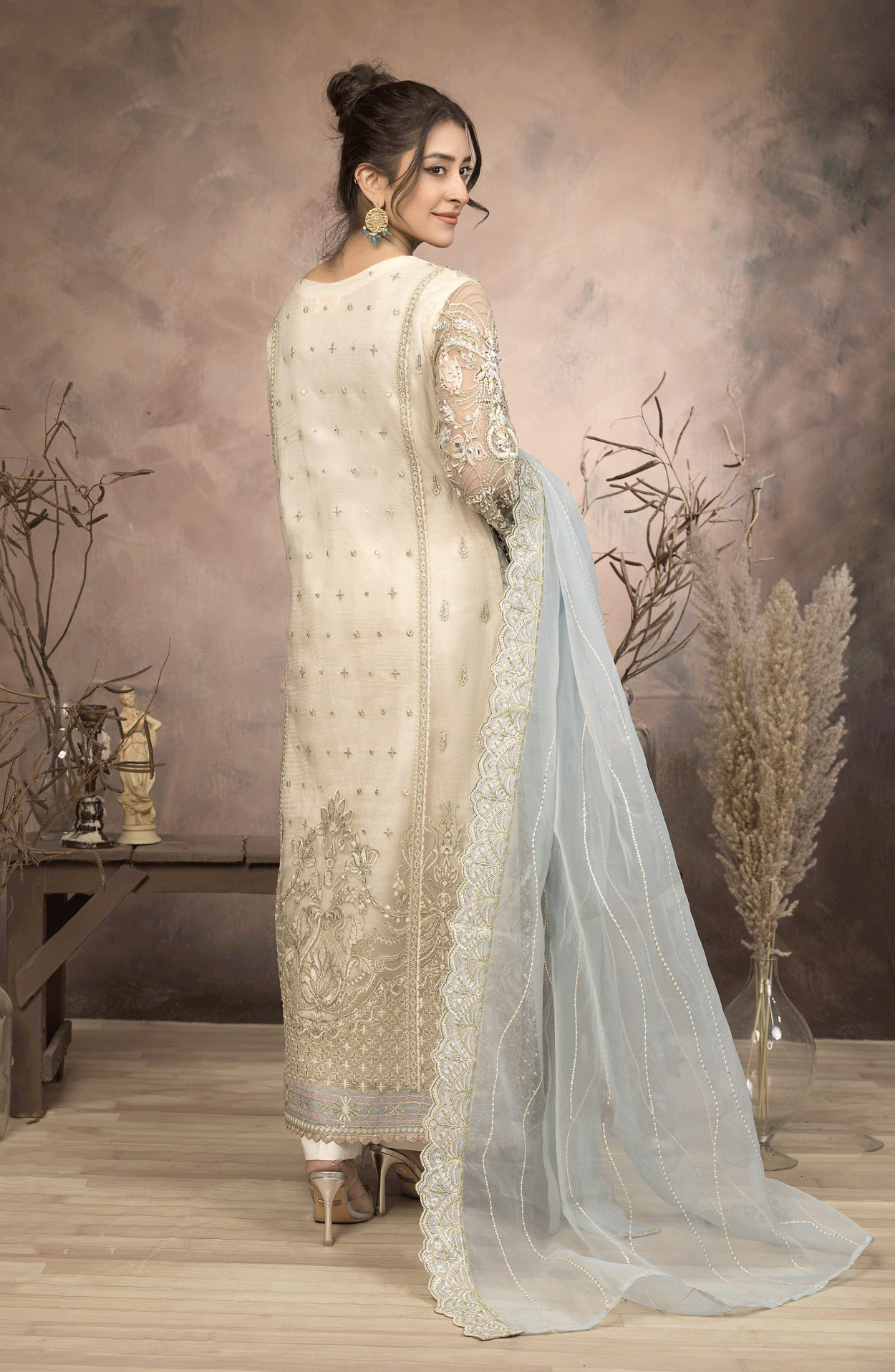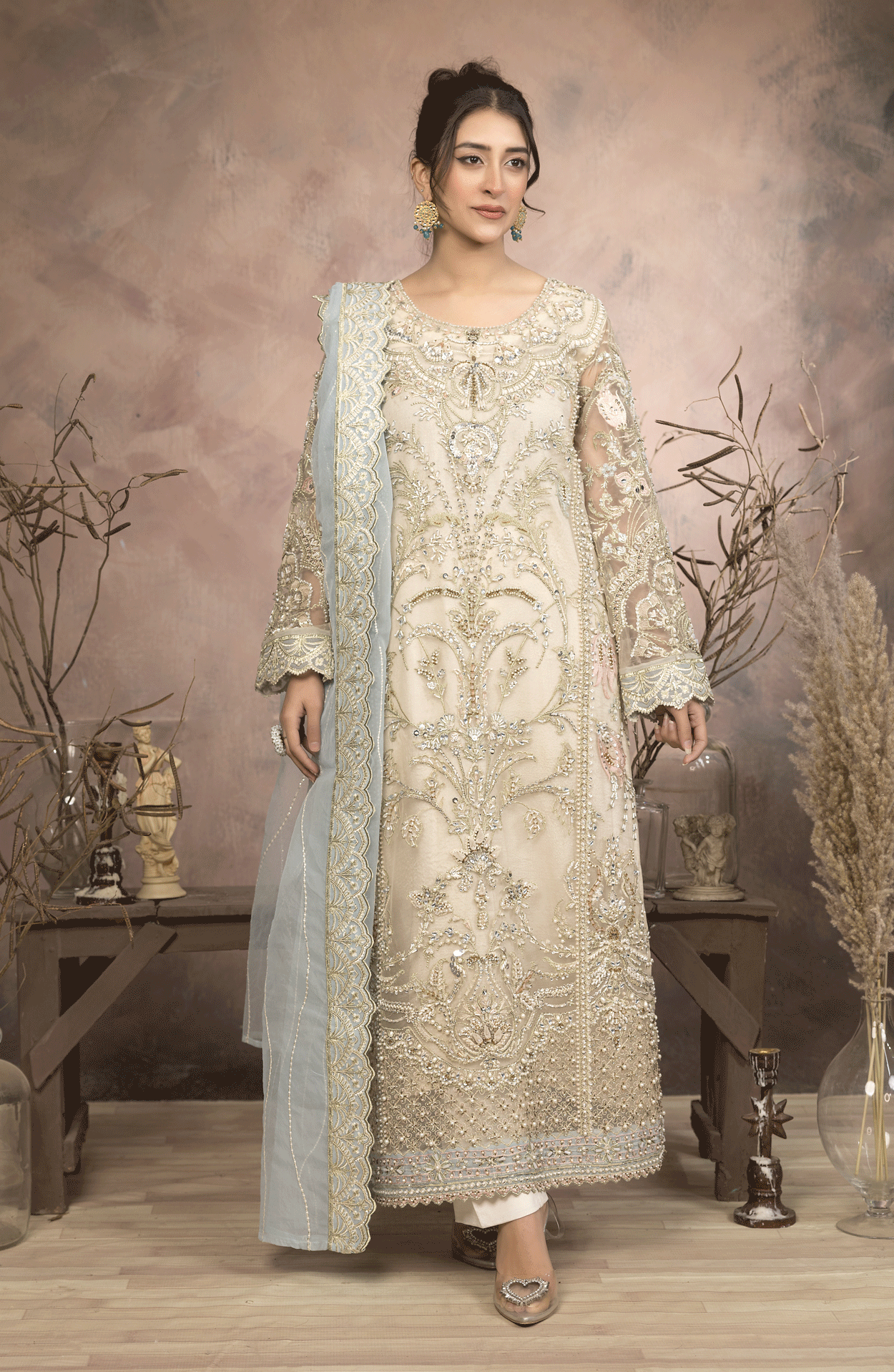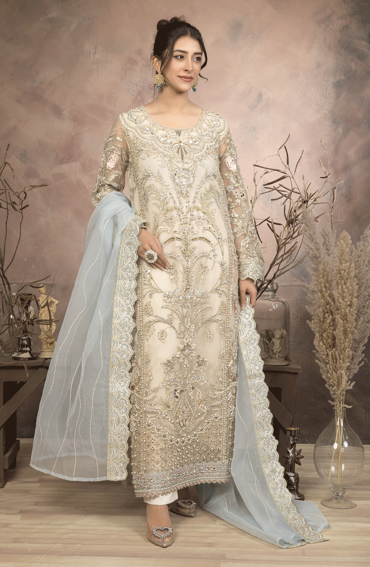 Additional Description: Colour: Off-White Fabric: Net and Rowsilk Shirt: Heavy Adda Work on Embroidery on Net Front And Back with Border Dupatta: Embroidery on Net With Four Side Embroidered Border Trouser: Plain Rowsilk