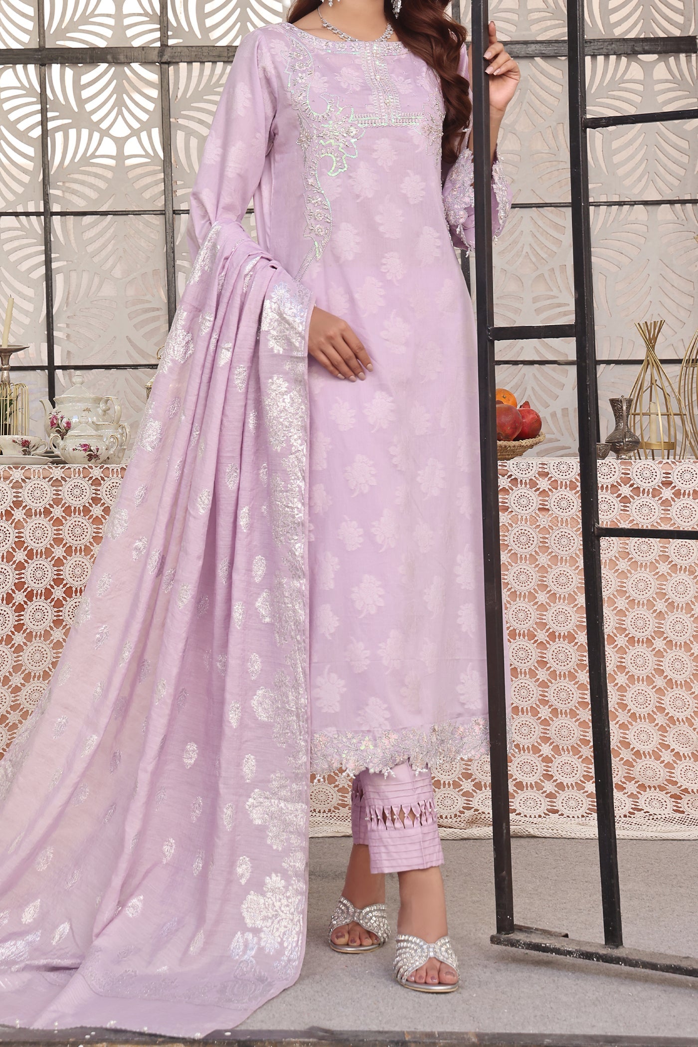 This ethereal lavender long shirt is adorned with a breathtaking array of traditional adda work, featuring the intricate artistry of naqshi, sequins, dabka, pearls, stones, and moti. Every stitch is a testament to impeccable craftsmanship. The dupatta is adorned with pearls and moti on the borders, with a classic cut-work trouser to pair with, making it a perfect statement style for a festive occasion.