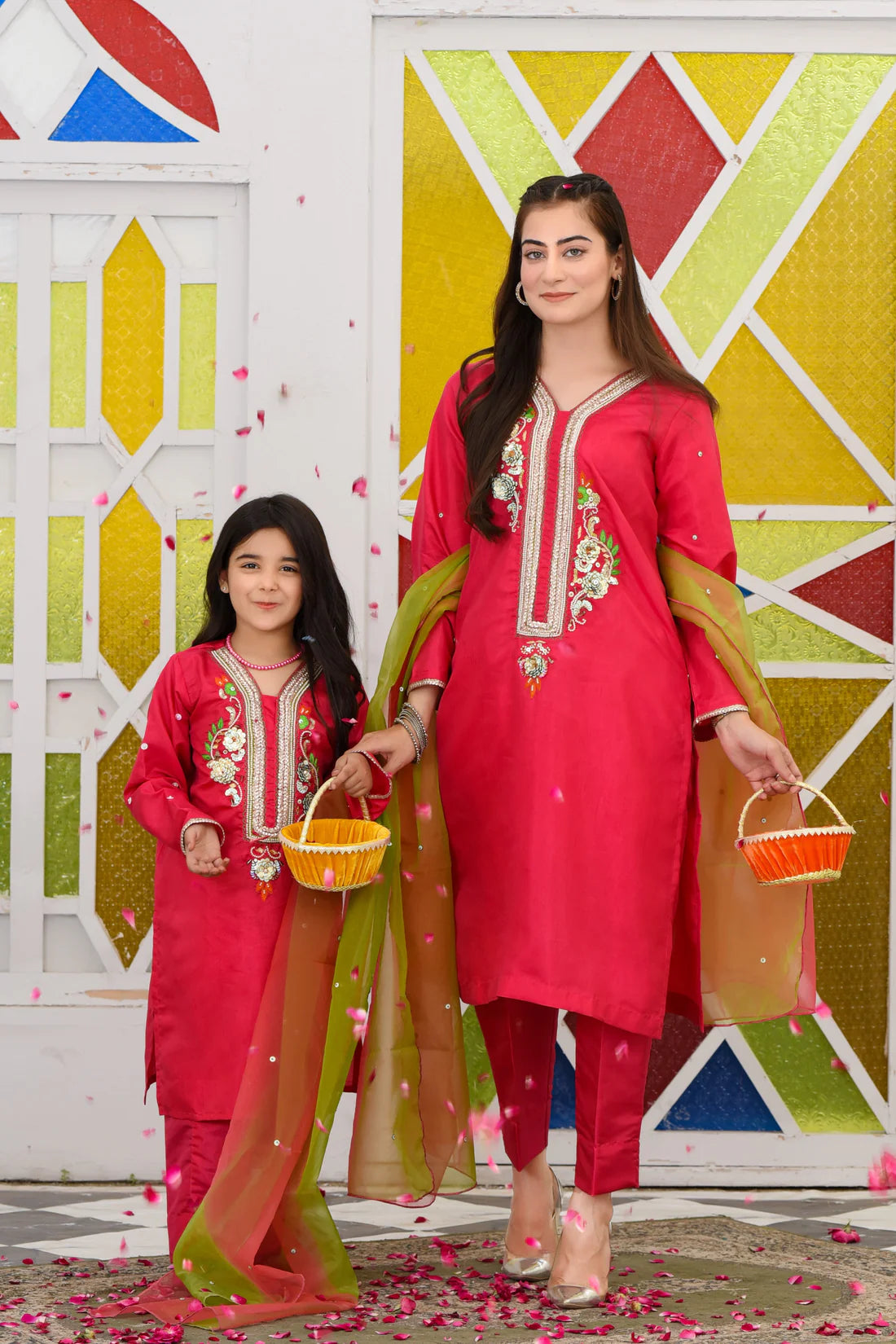 Fiery rose is one of those eye-catching and vibrant delicacies, that you’re gonna love. Rangoli comes in a glossy, lustrous fabric which detailed with hand embroidery and embellishments which give it a undoubtedly gorgeous and delicate look. Nonetheless, its dupatta is made of organza which is all over showered with sitara. This elegant piece is paired with kataan silk straight pants.