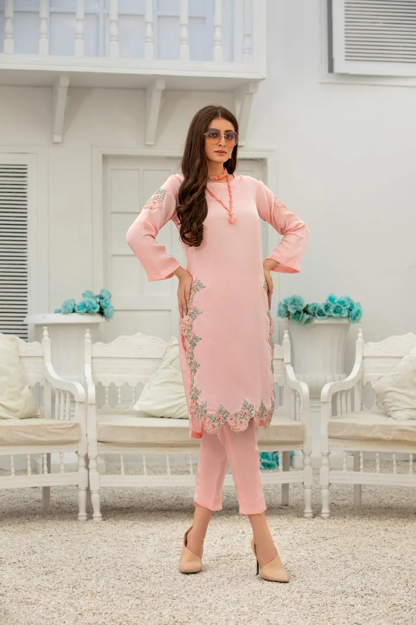 Elegance meets charm in this soft powder pink 2-piece dress adorned with exquisite raita work on the daman and sleeves. Embrace sophistication with a touch of allure in this captivating ensemble.