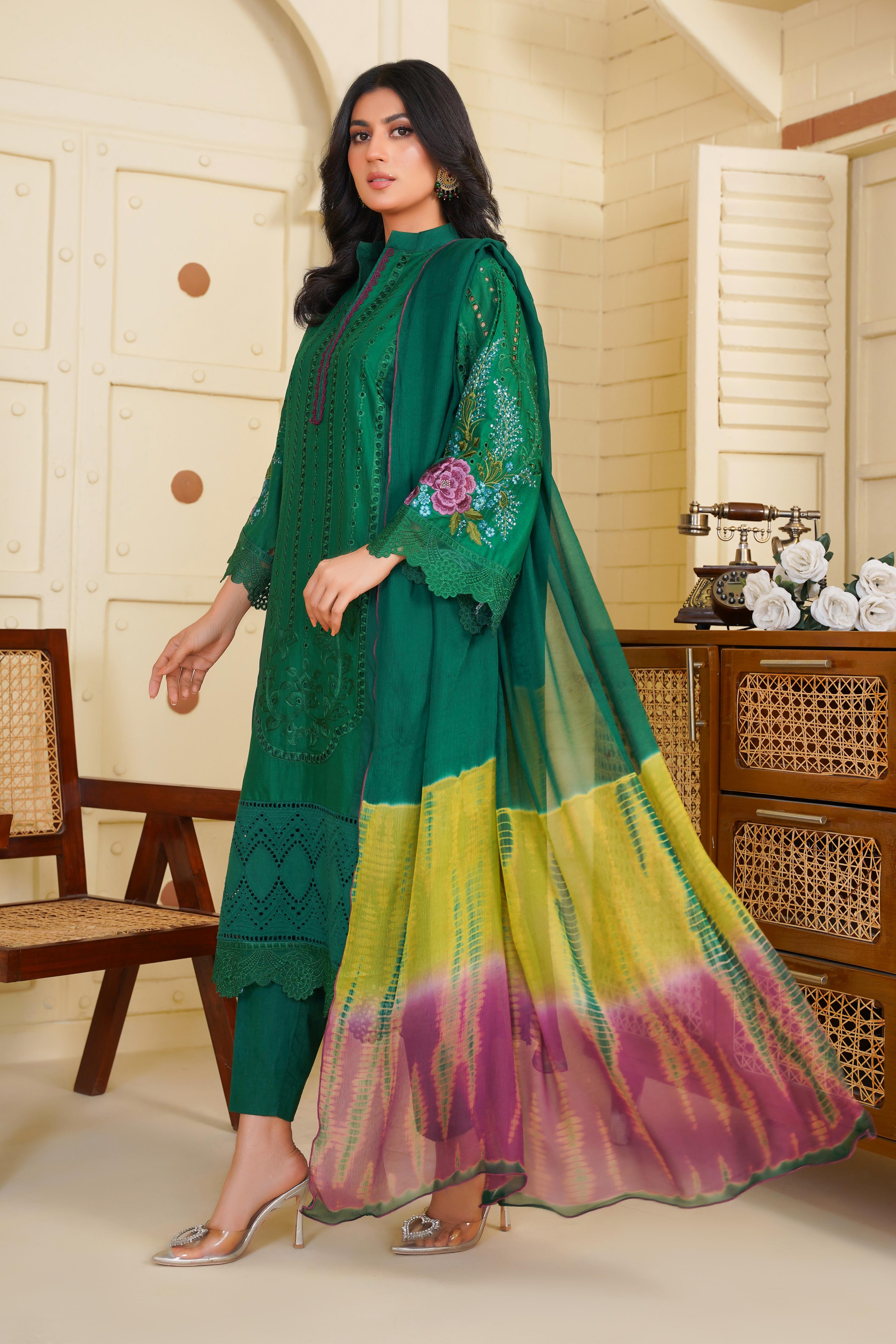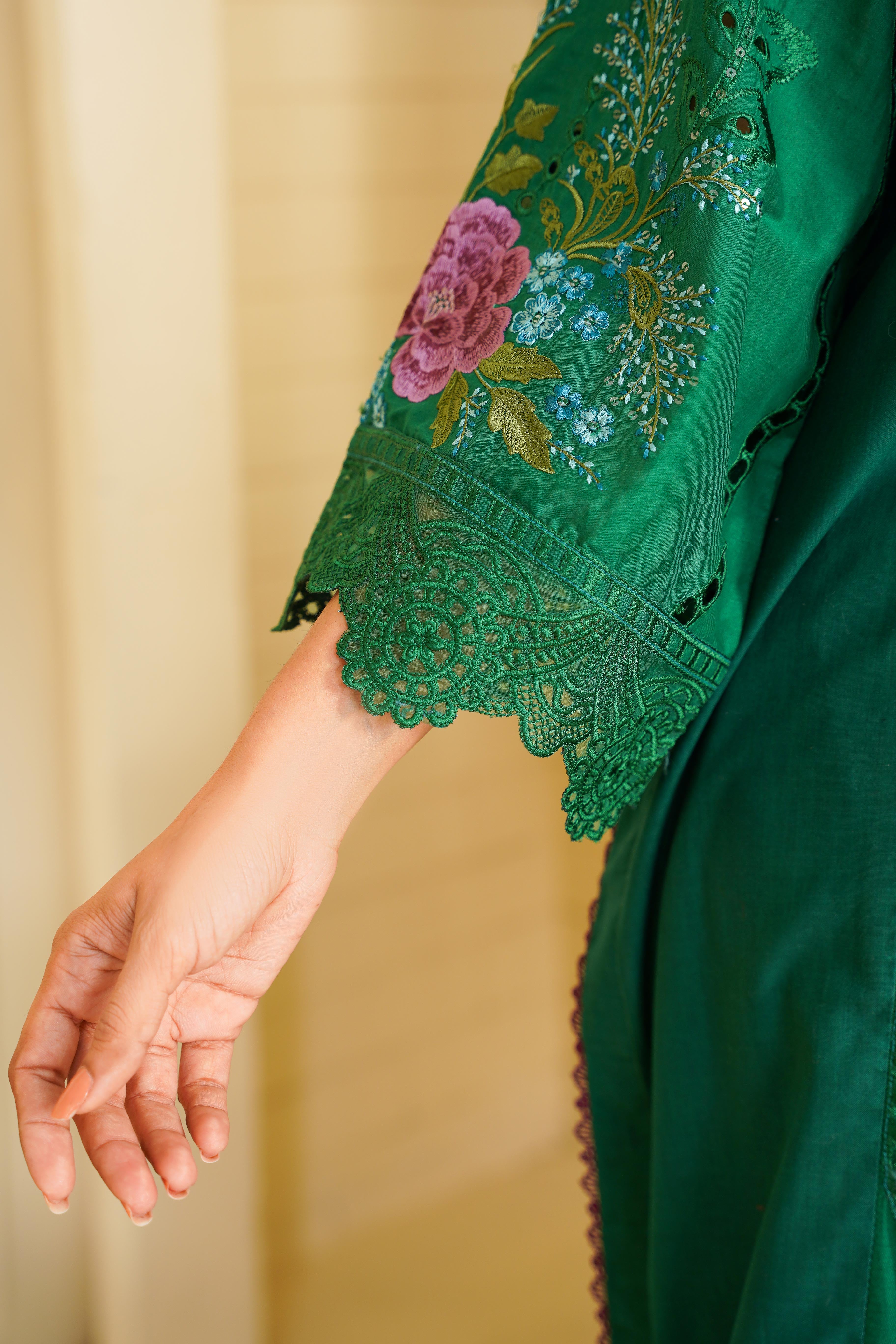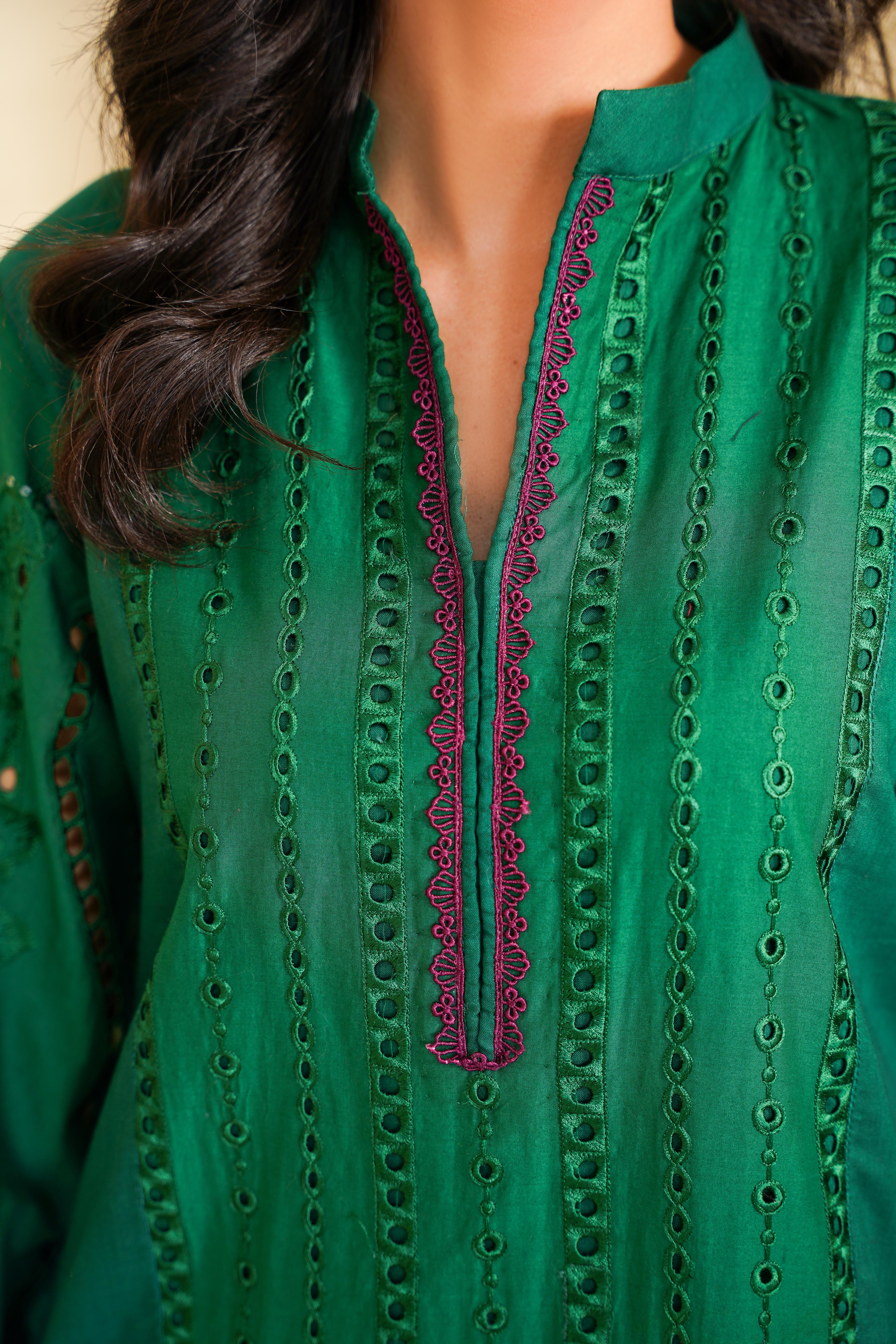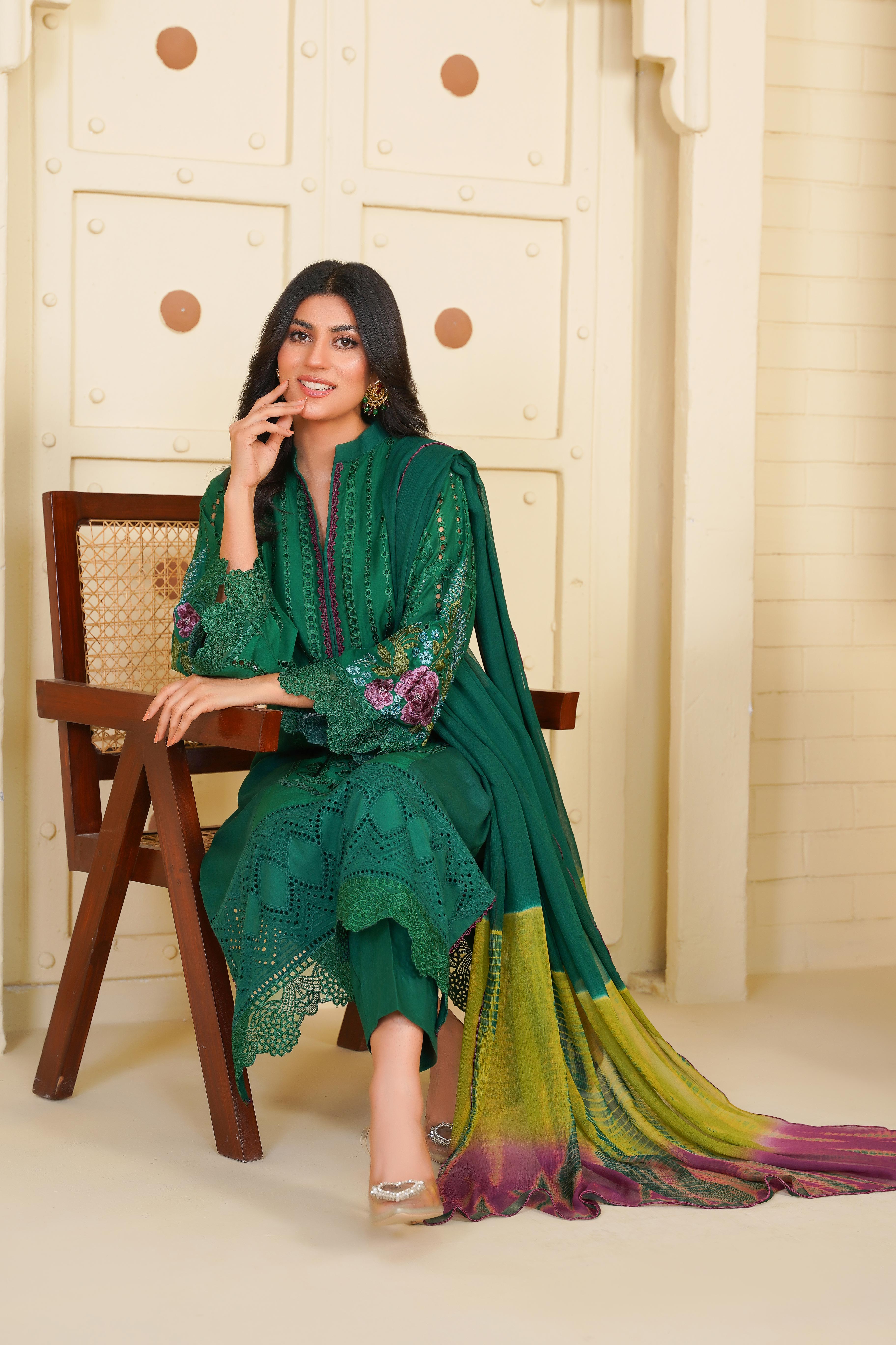Step into timeless elegance with this stunning Aroma article from the Floral Whisper Collection. Designed in a rich green hue, this outfit features delicate Chikankari embroidery, adding a touch of sophistication and tradition.