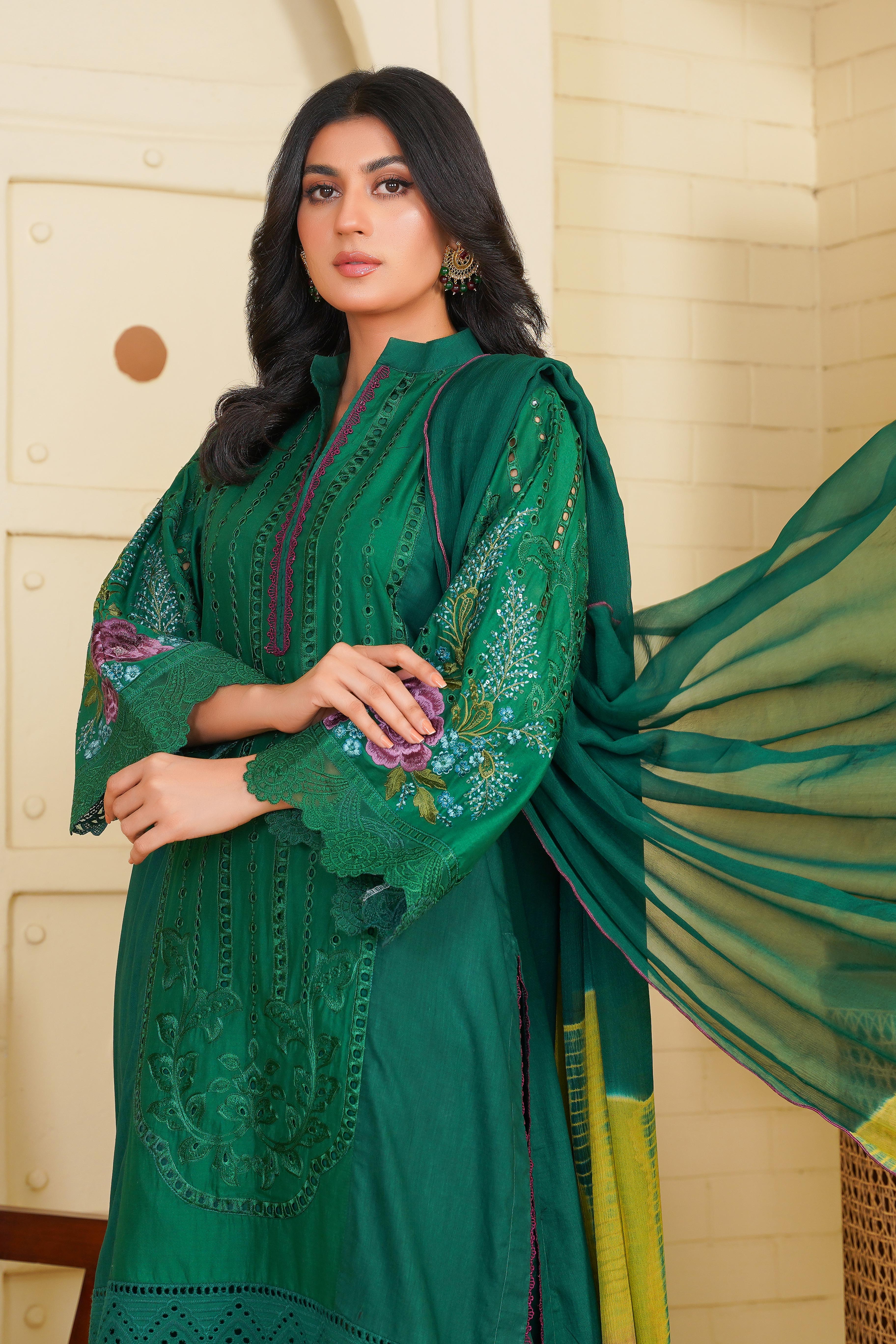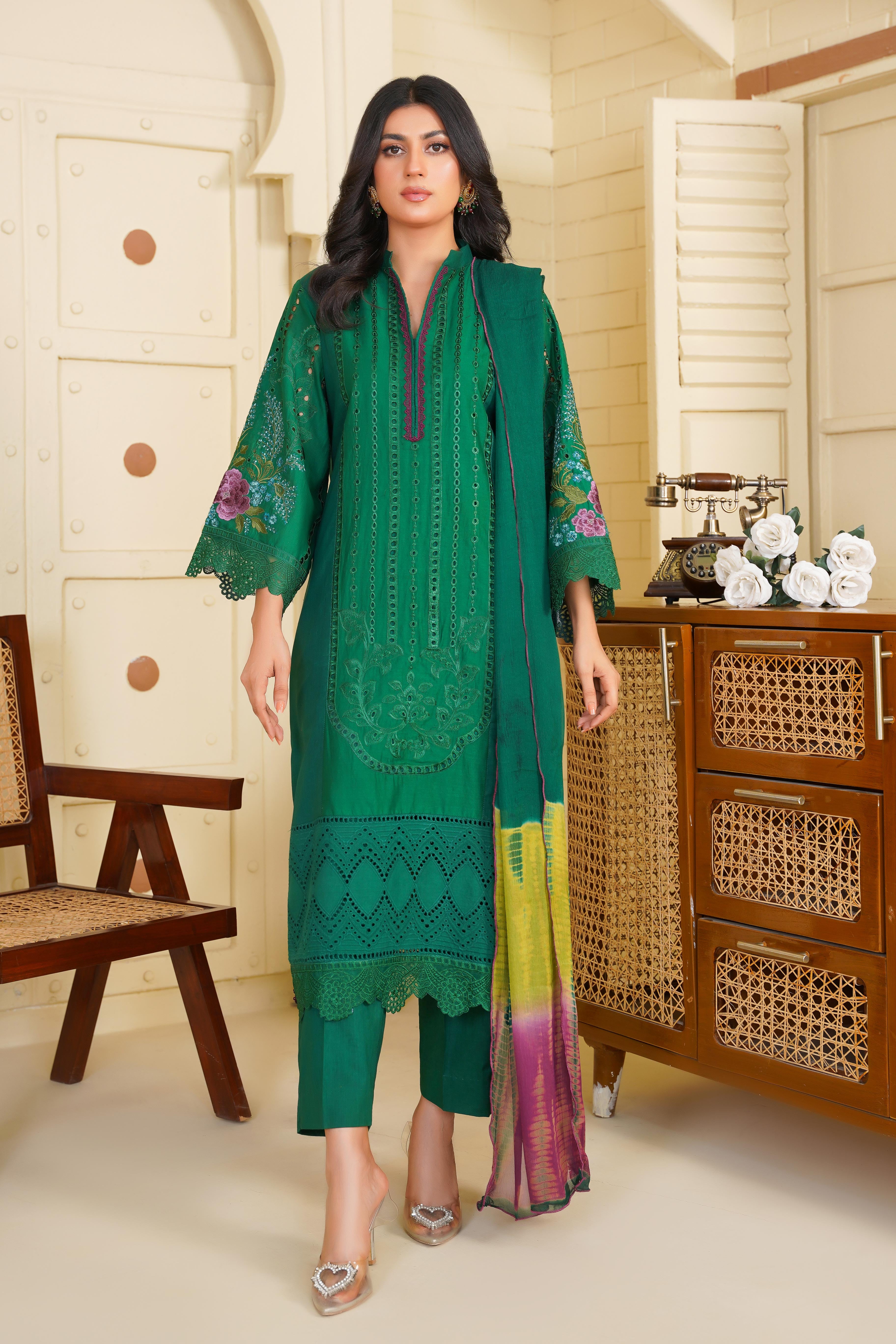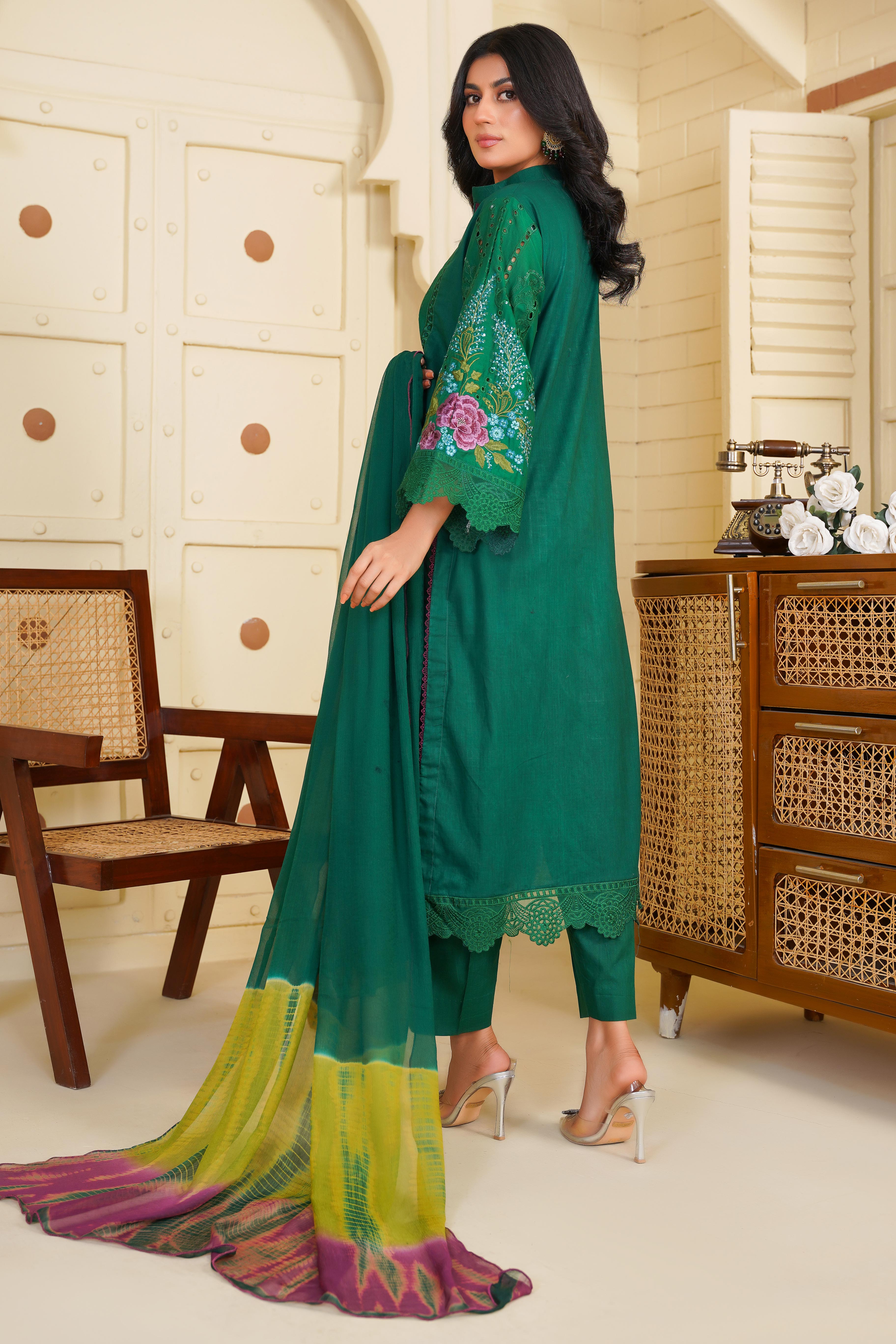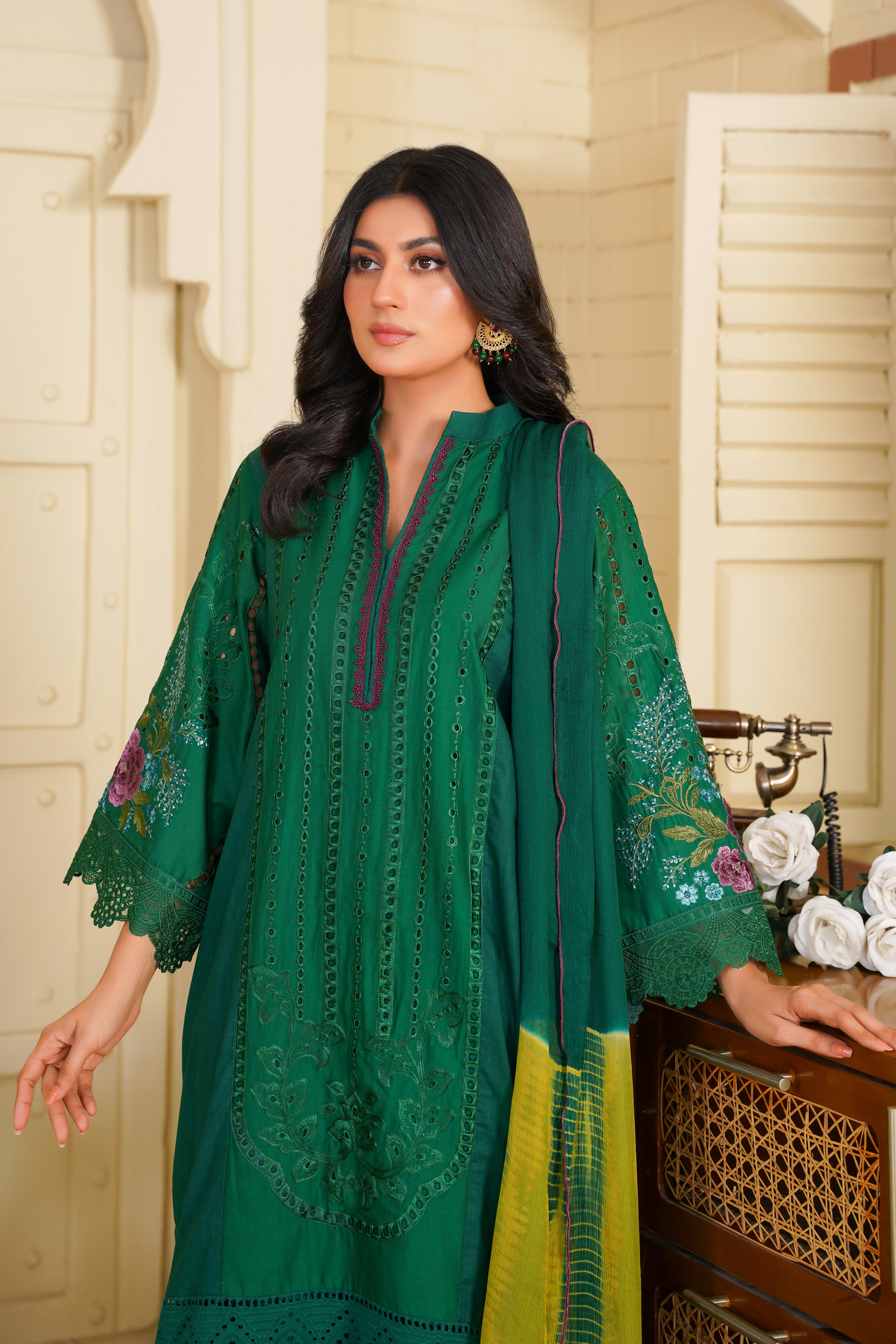 Step into timeless elegance with this stunning Aroma article from the Floral Whisper Collection. Designed in a rich green hue, this outfit features delicate Chikankari embroidery, adding a touch of sophistication and tradition.
