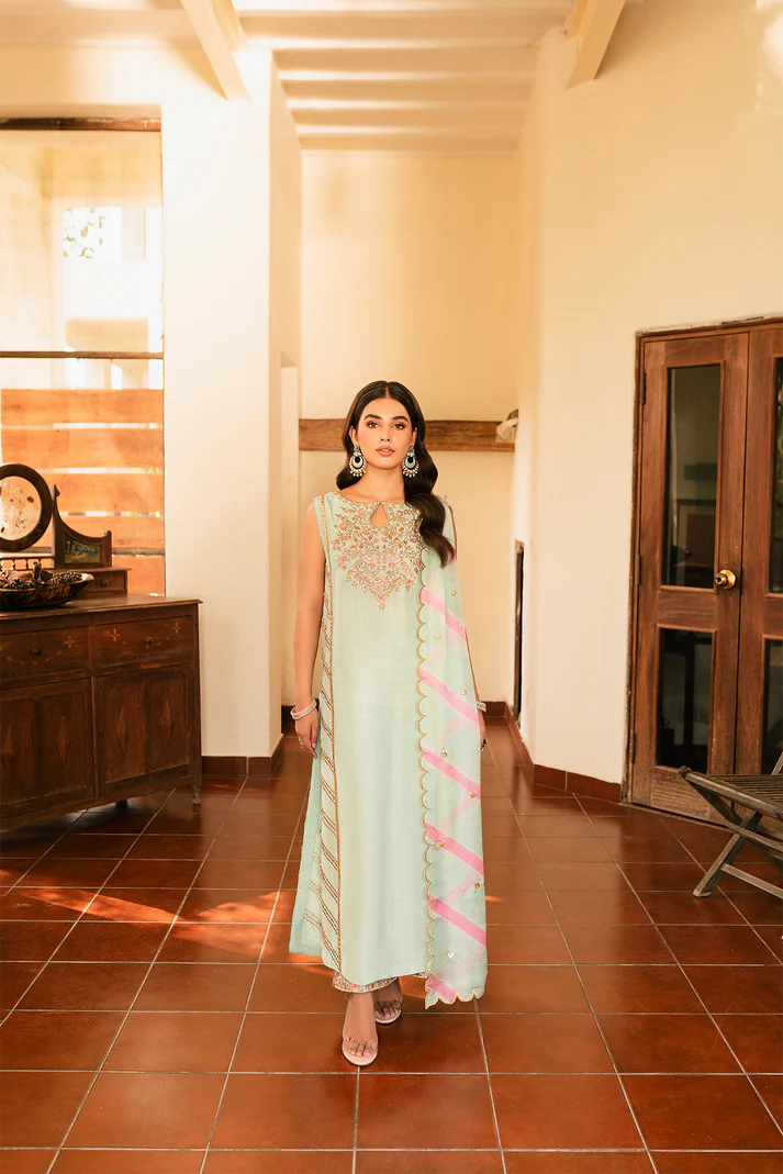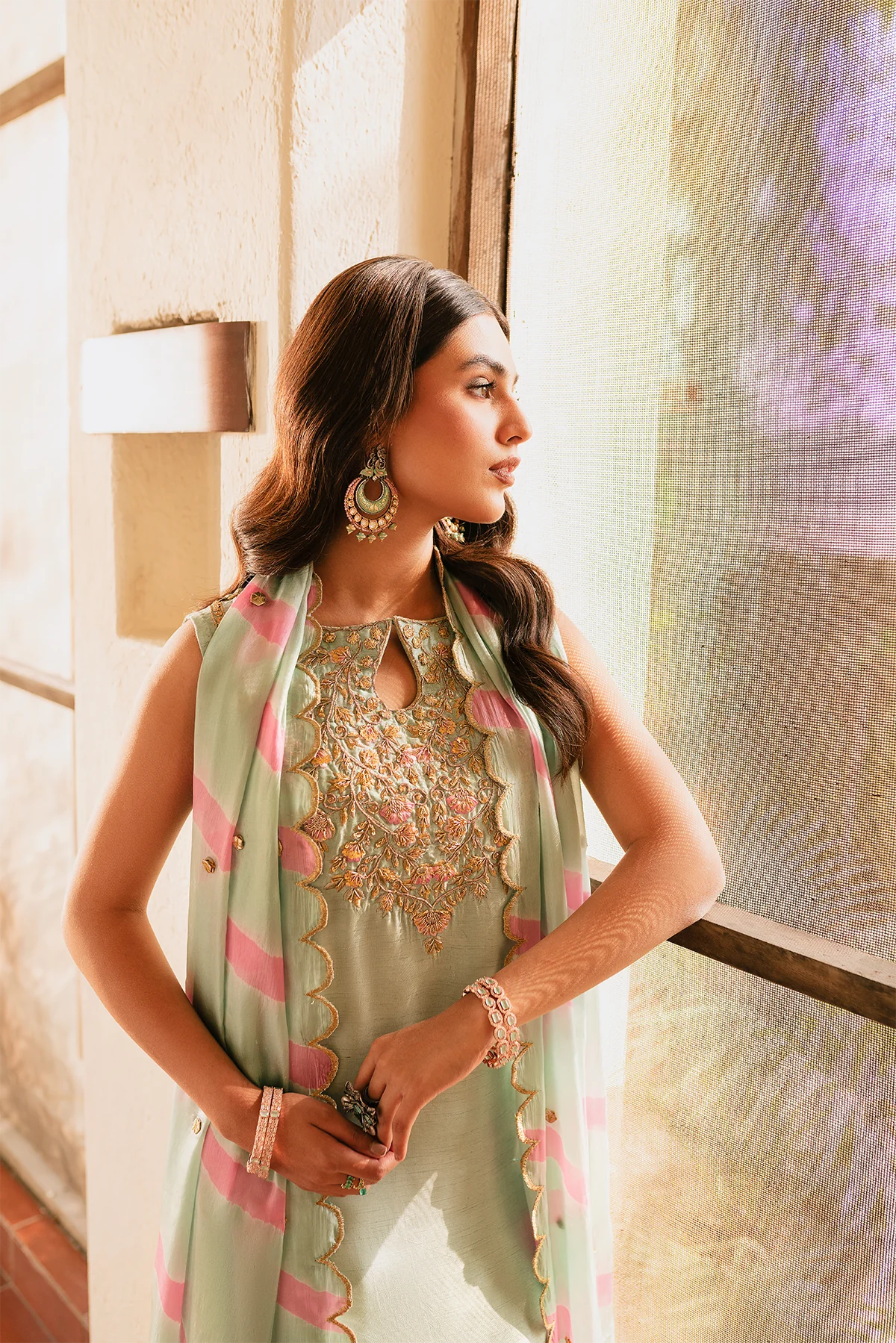 This ravishing attire manifests the pragmatic shade of mint green contrasted with pink in a pure raw silk full-length paneled shirt with Izaar pants.