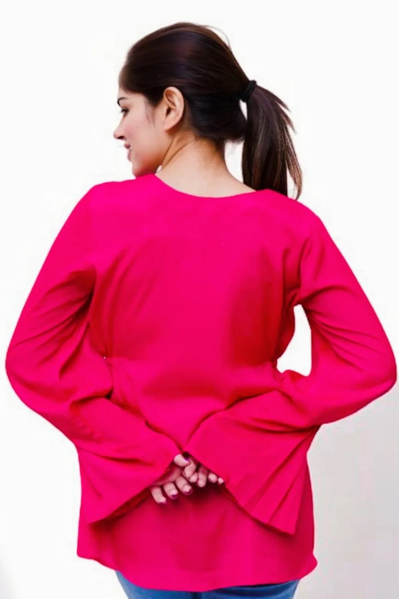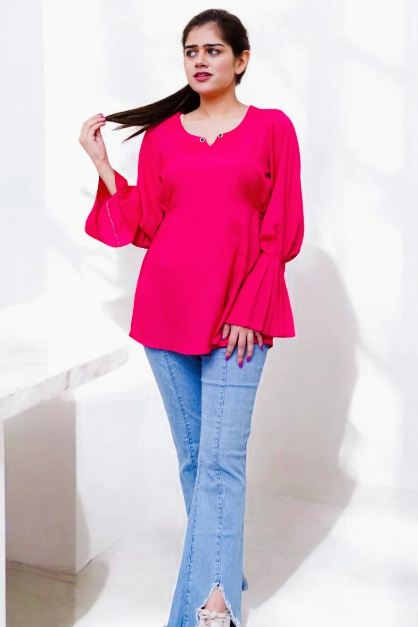 A stunning pink grip top featuring elegant sleeves and a studded neckline. The soft pink hue adds a feminine touch, while the sophisticated sleeves and embellished neckline with studs elevate the design, making it a perfect blend of chic and edgy.